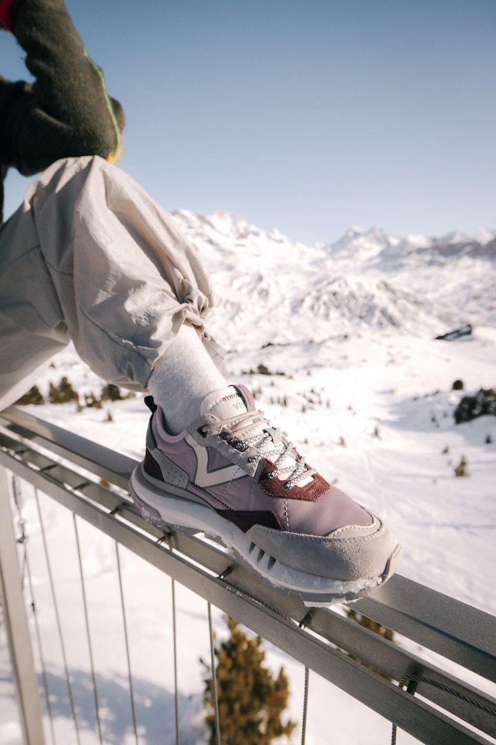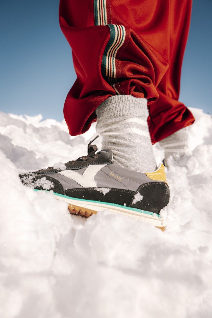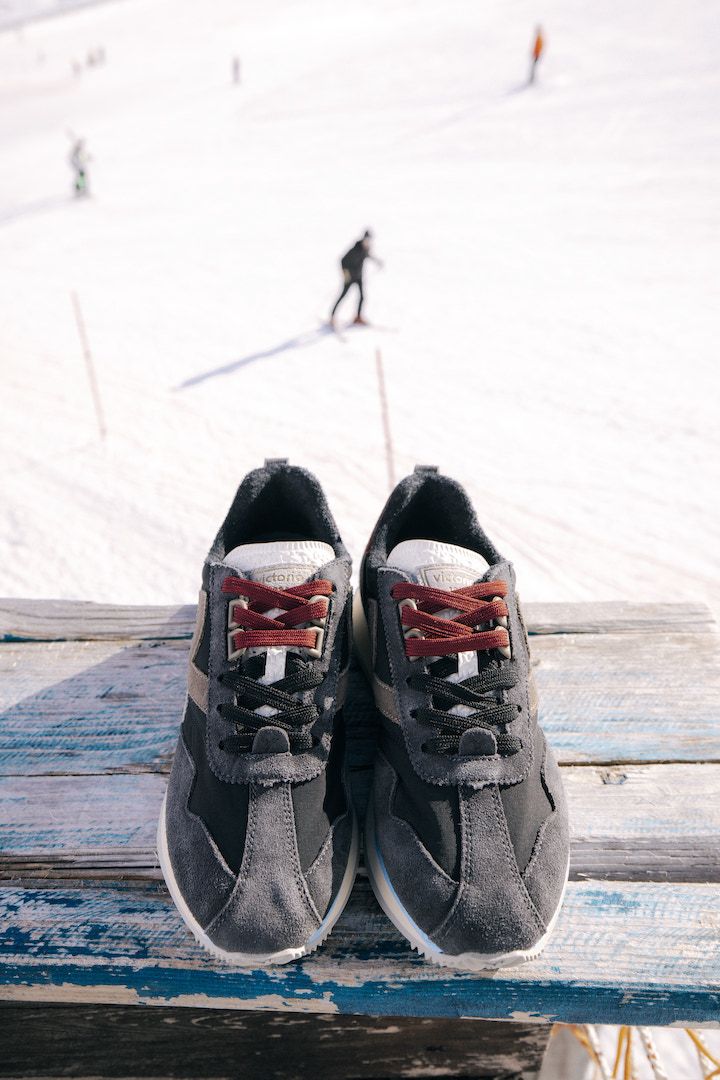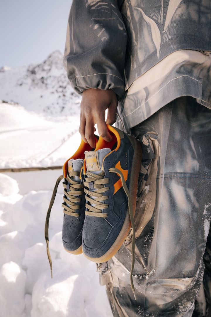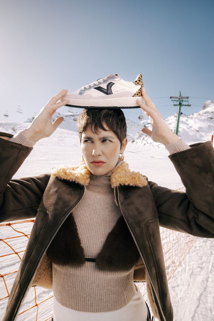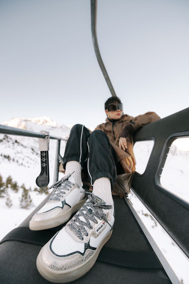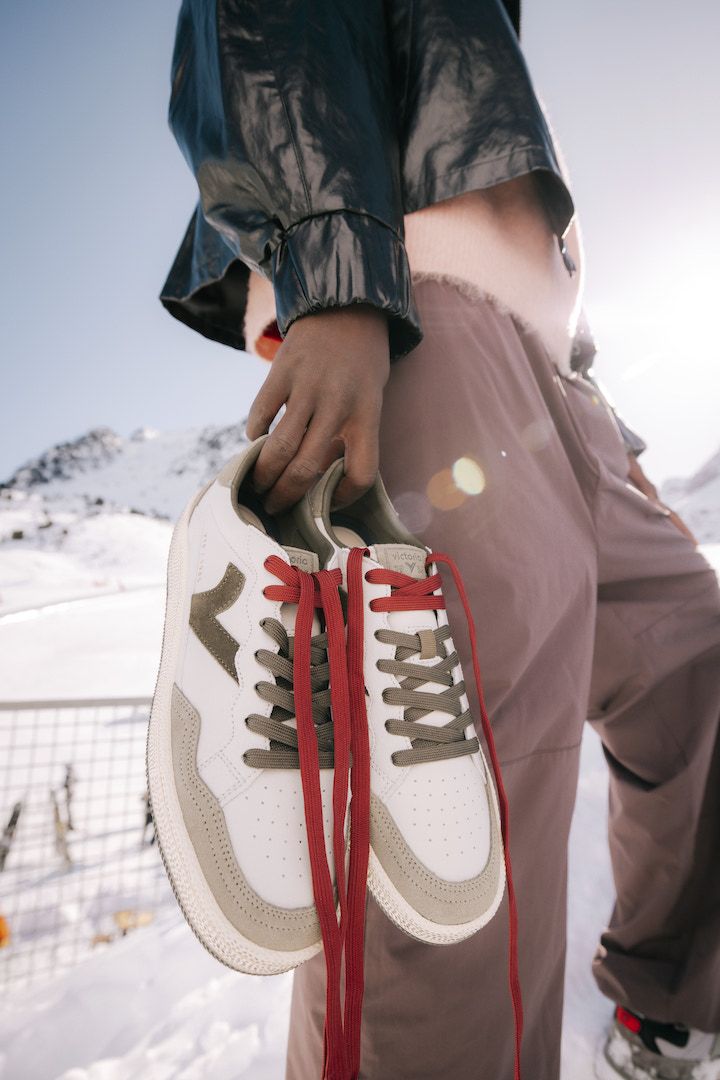 With Snow Much Fun, Victoria doesn’t endure winter — she sculpts it into a visual language. The campaign is infused with snowy landscapes, capturing silence, white light, and the majestic strength of nature to shape the essence of design. The silhouettes combine soft volumes and bright white palettes, highlighted by metallic accents reminiscent of the fleeting sparkle of ice under the sun. The brand’s intrinsic elegance persists, even in models designed for escape. And while the collection is dominated by this icy purity, it dares to break winter codes by introducing an unexpected olive green — a fresh, contemporary accent that breathes vibrant light into tradition. The centerpiece of this season bridges time itself: the Saturno, a sneaker drawing from 1970s archives to reinvent the jogger aesthetic with a decidedly modern approach.