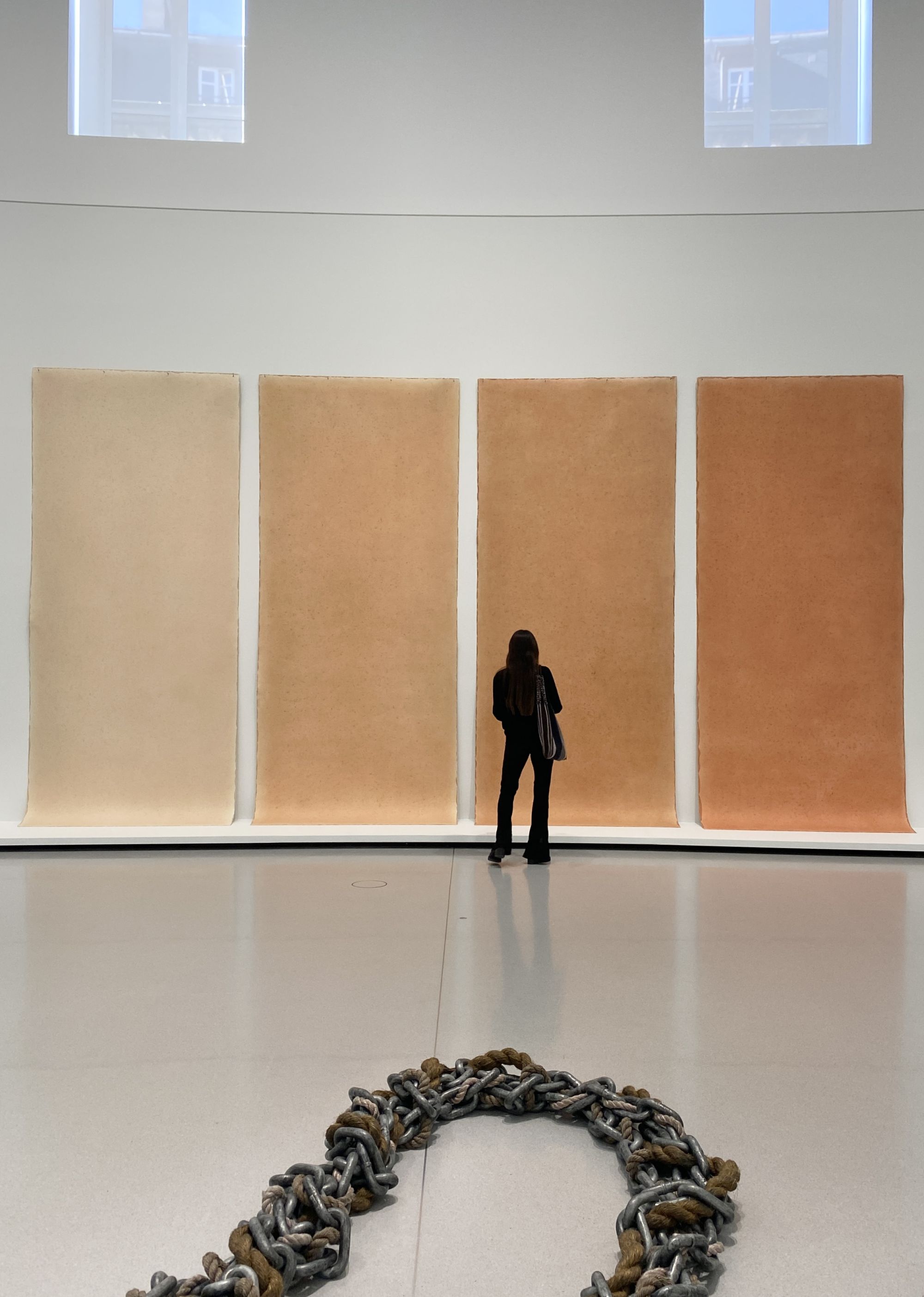 Within the Bourse de Commerce is also Weaving Space, a special exhibition on artist Lygia Pape, curated by Emma Lavigne. On a large screen, her 1968 performance Divisor plays on loop. It features a hundred people from all walks of life walking beneath a huge white sheet, only their heads showing through small openings. In this shared garment, class and hierarchies do not exist. Everyone is equal in their participation in a system where one’s worth is measured through productivity and possessions. Being part of a “fabric” much bigger than ourselves, trust and community become the currency. In another room, another one of her works, Ttéia 1, C, stands as a main event, featuring golden threads nailed into wood, creating a strategic play of light and shapes. Like value itself, its boundaries seem undefined.