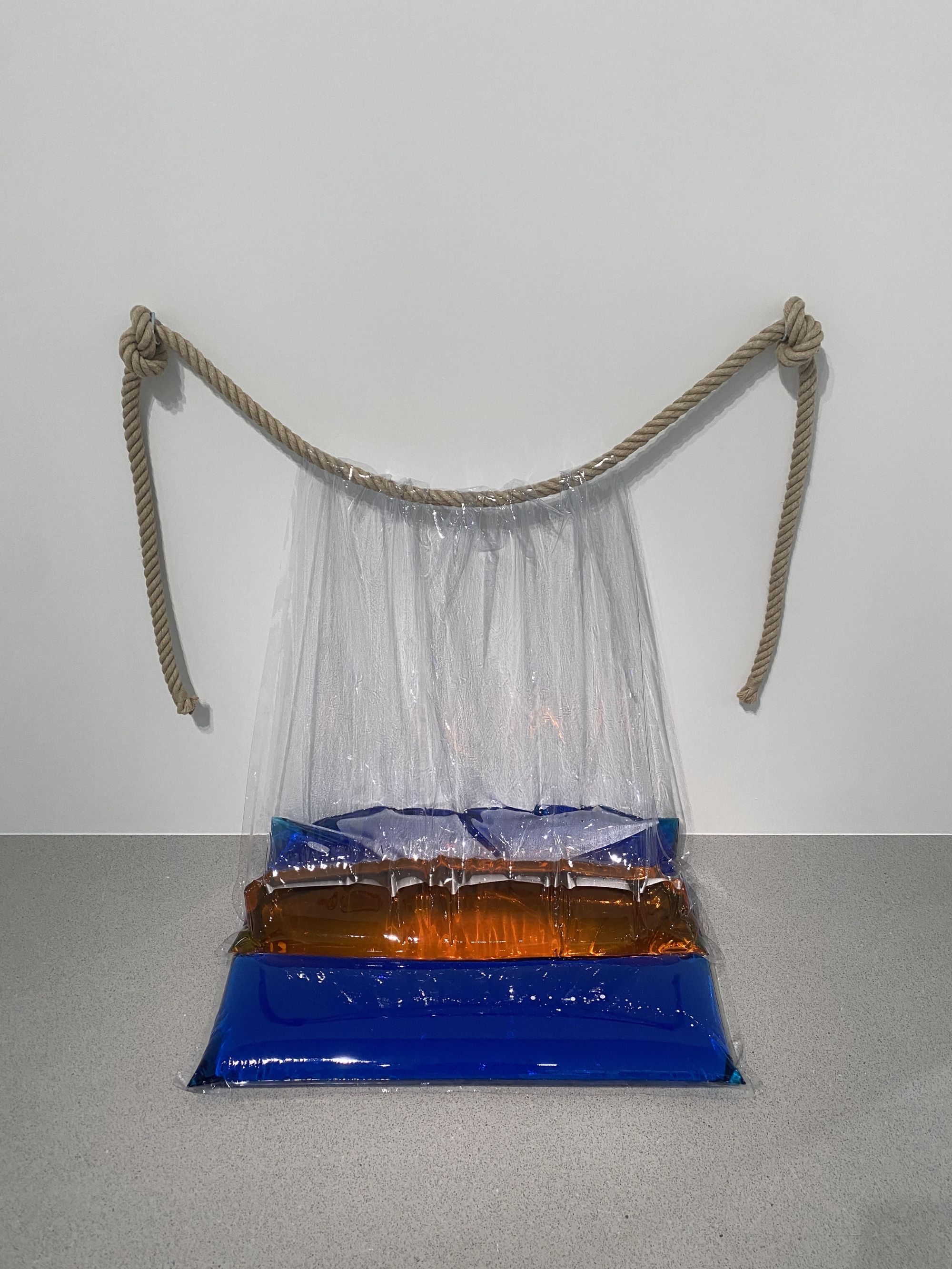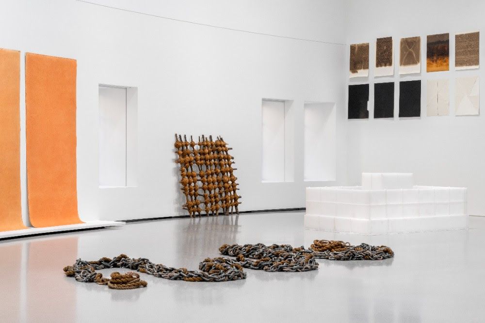 Fittingly, Webster’s work occupies the heart of the exhibition, bringing together works of 52 artists from Europe, Asia, and the Americas, and itself divided into seven sections: Light, Mono-ha, Balance, Surface, Grid, Monochrome, and Materialism. Minimalism from Dan Flavin’s and Chryssa’s neon light echoes commercial signages and advertising. Senga Nengudi’s Water Composition series, which curator Morgan describes as a response to pressure and gravity, features liquid, sealed in plastic, collapsing heavily on the floor, ropes holding it like tired, injured limbs—almost like a representation of the weight of realities. The 30-foot River Floor sculpture by Marden Hassinger stretches across the gallery, using shipping ropes to tell the story of the transatlantic voyages of enslaved Africans to the Americas. The piece calls attention to the waterways that facilitated the slave trade, and industrialization’s destructive effects on life and labor. These artists, among many, radically changed art in the 1960s and 1970s, “in part a response to changing political, social, and technological developments” by utilizing “pared-back forms, everyday materials, and direct engagement with the environment.”