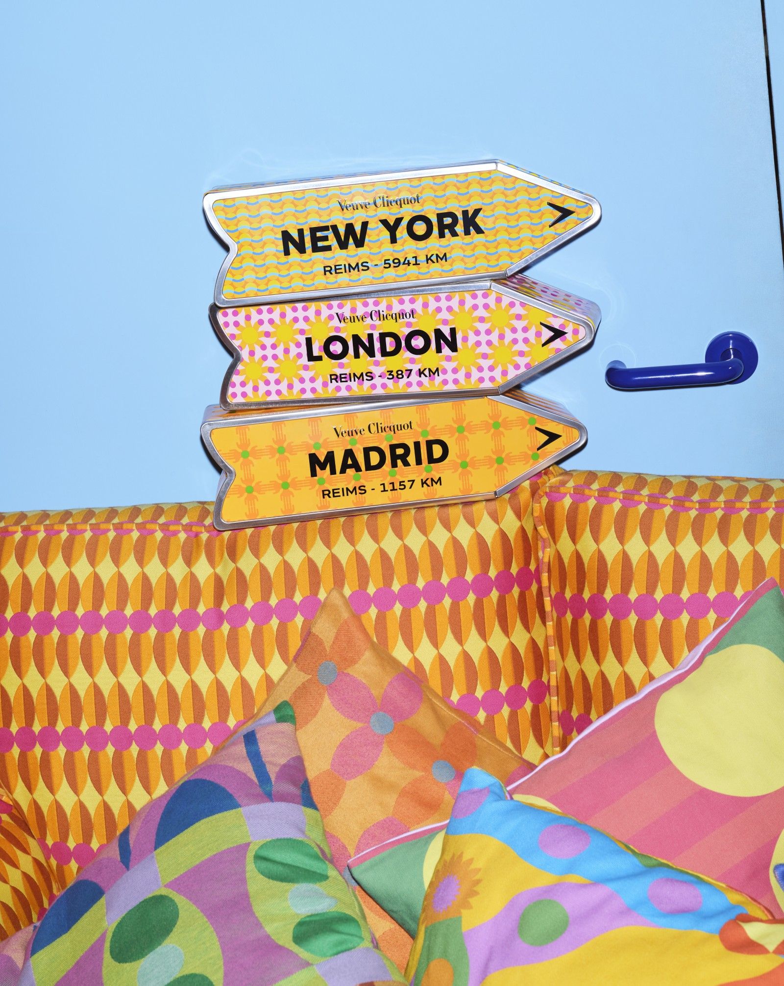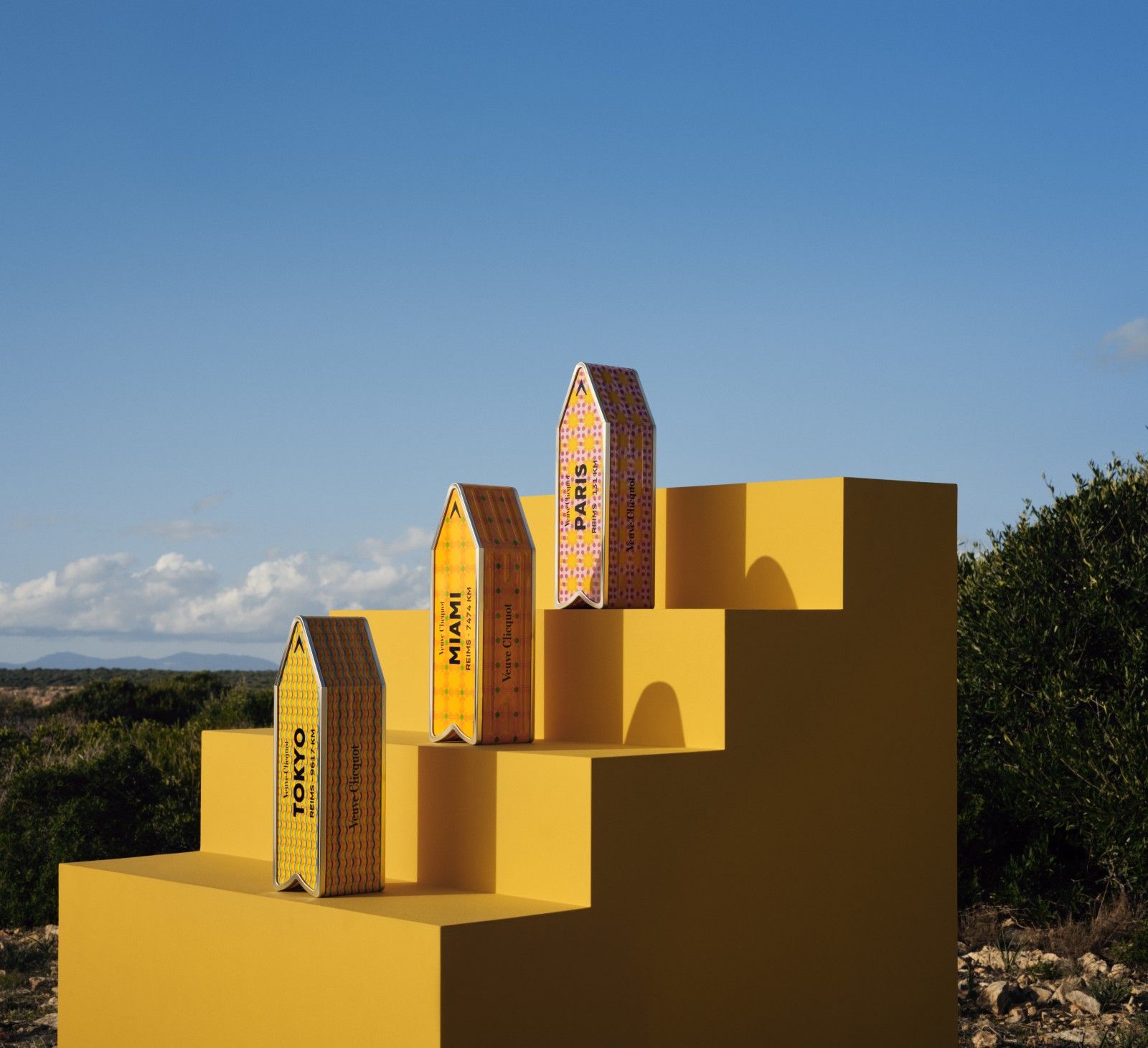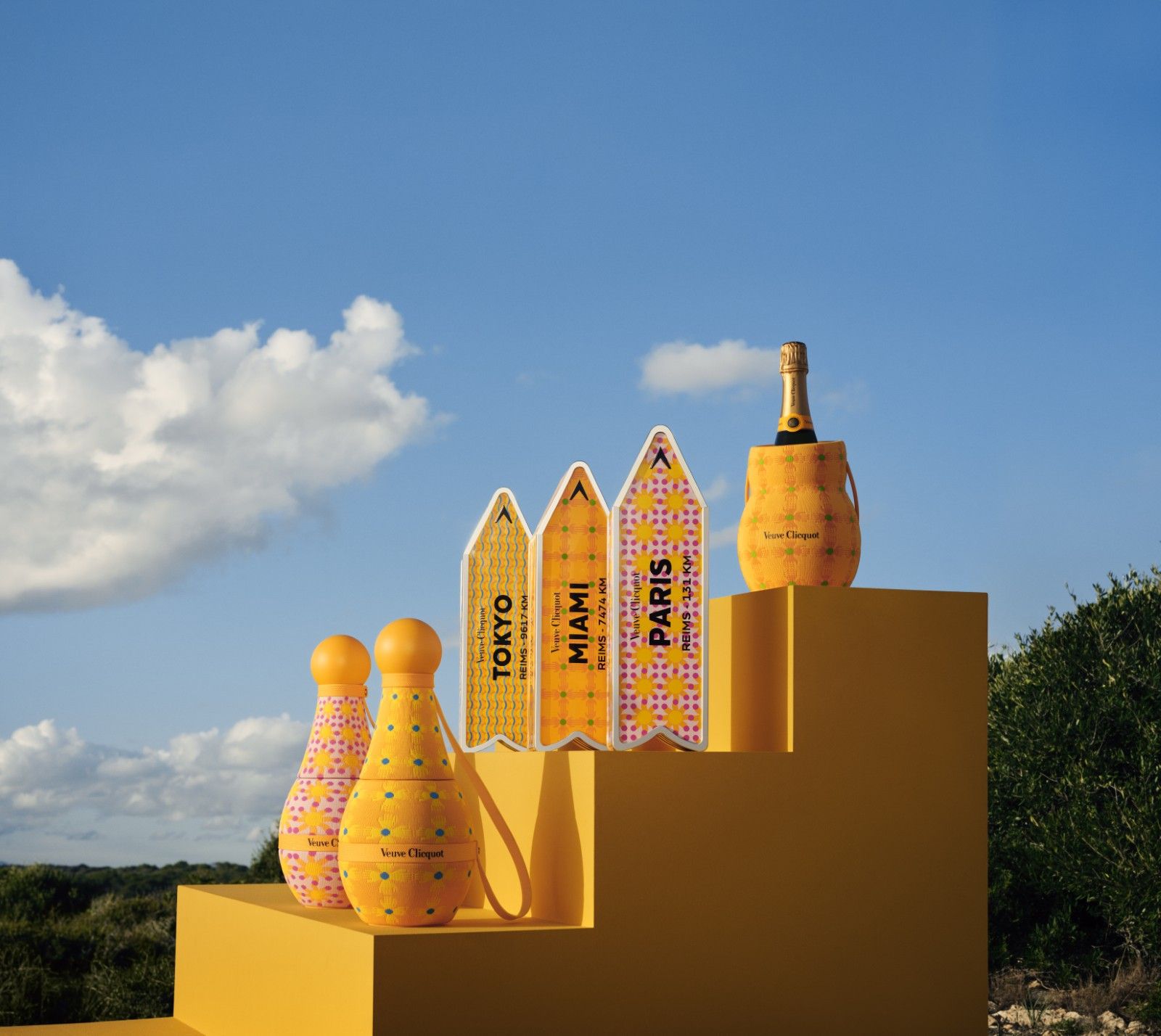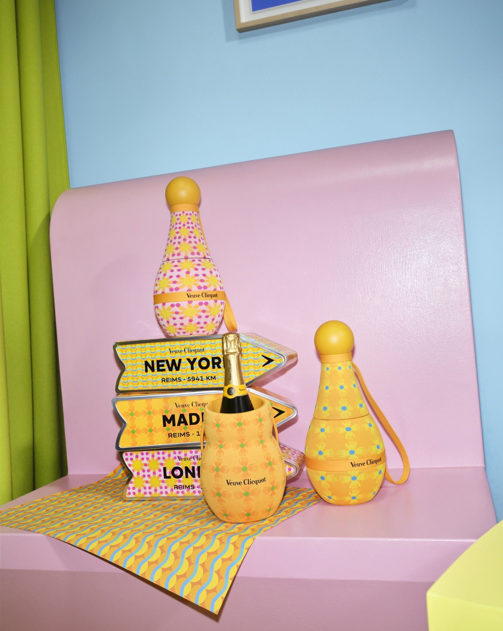 There are also the Sun Totems that reinterpret the gourd as a portable drinking vessel: also made with recycled materials and 3D knitting technology, they turn joyful moments into true rituals of sharing. The iconic Clicquot Arrow, the arrow-shaped gift packaging inspired by road signs, is reinvented with three new vibrant patterns created by Ilori, each capable of indicating the distance between the chosen destination and Veuve Clicquot’s cellars in Reims.