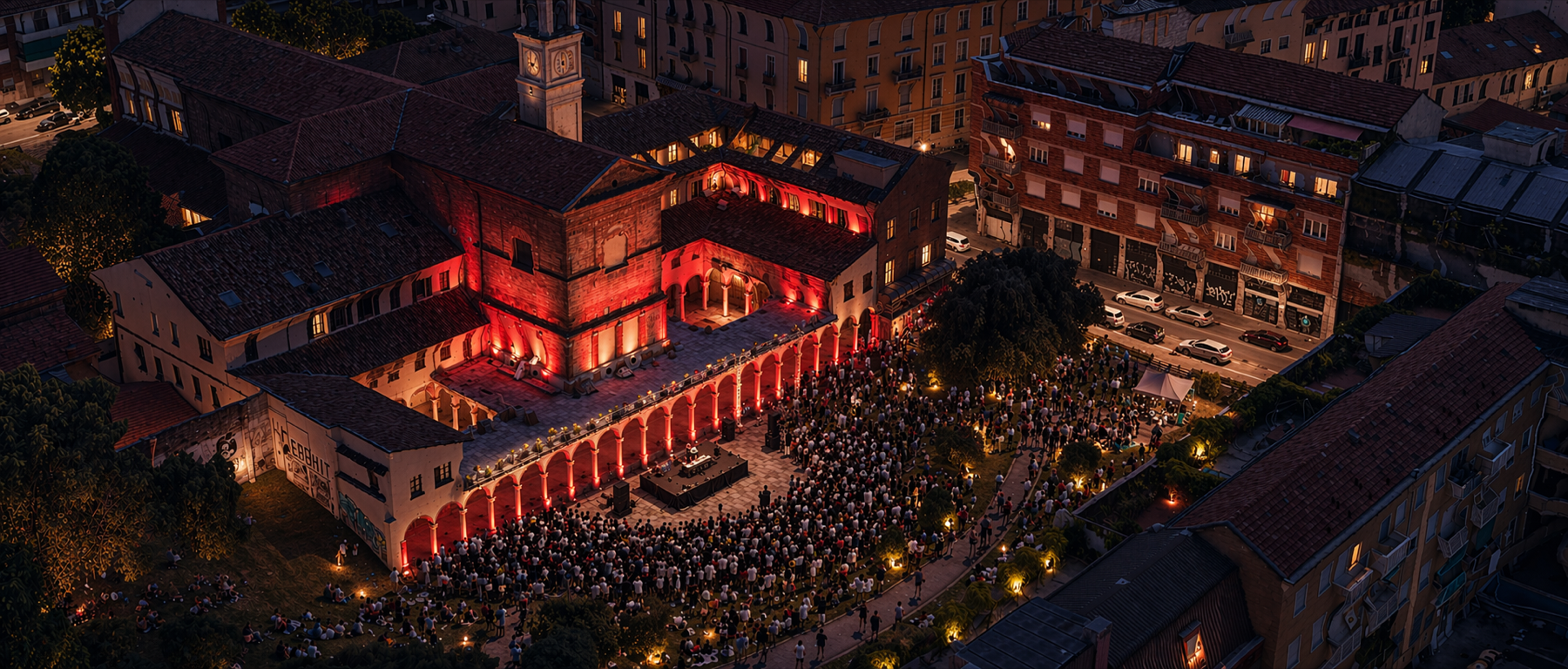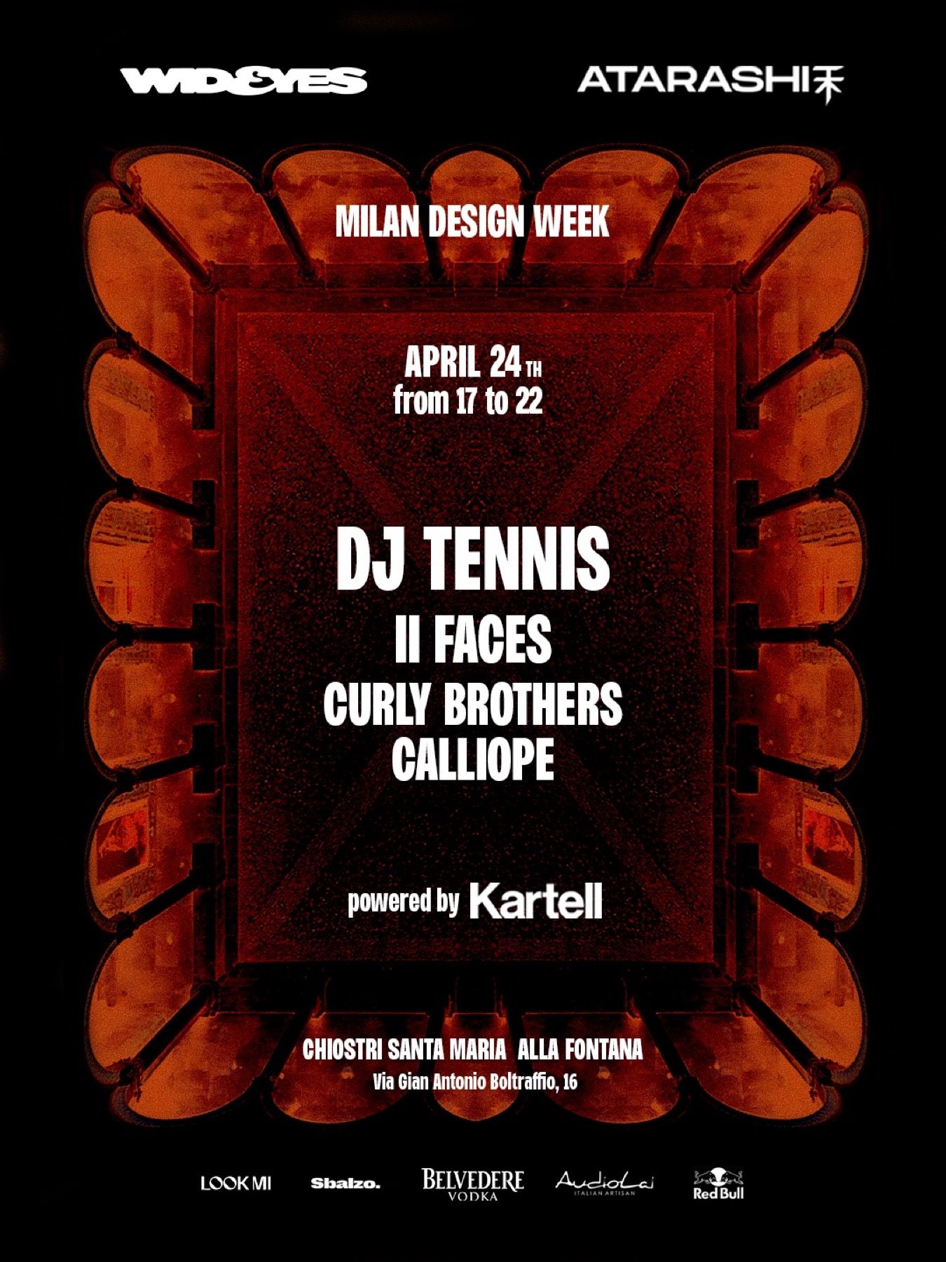 Already on April 24, during Design Week, the external semicircle and surrounding areas hosted the launch event evening, created in collaboration with Atarashi. The project, already active, is bringing one of Milan’s most fascinating and lesser-known Renaissance complexes to life, returning it to visitors as a contemporary space for gathering, listening and experimentation. The electronic music line-up featured the Curly Brothers as opening act and DJ Tennis as the main act, an internationally renowned artist and founder of the label Life and Death. The set was conceived to engage with the history of the venue and with the Design Week audience. Guests then toasted with a premium cocktail list based on Belvedere Vodka.