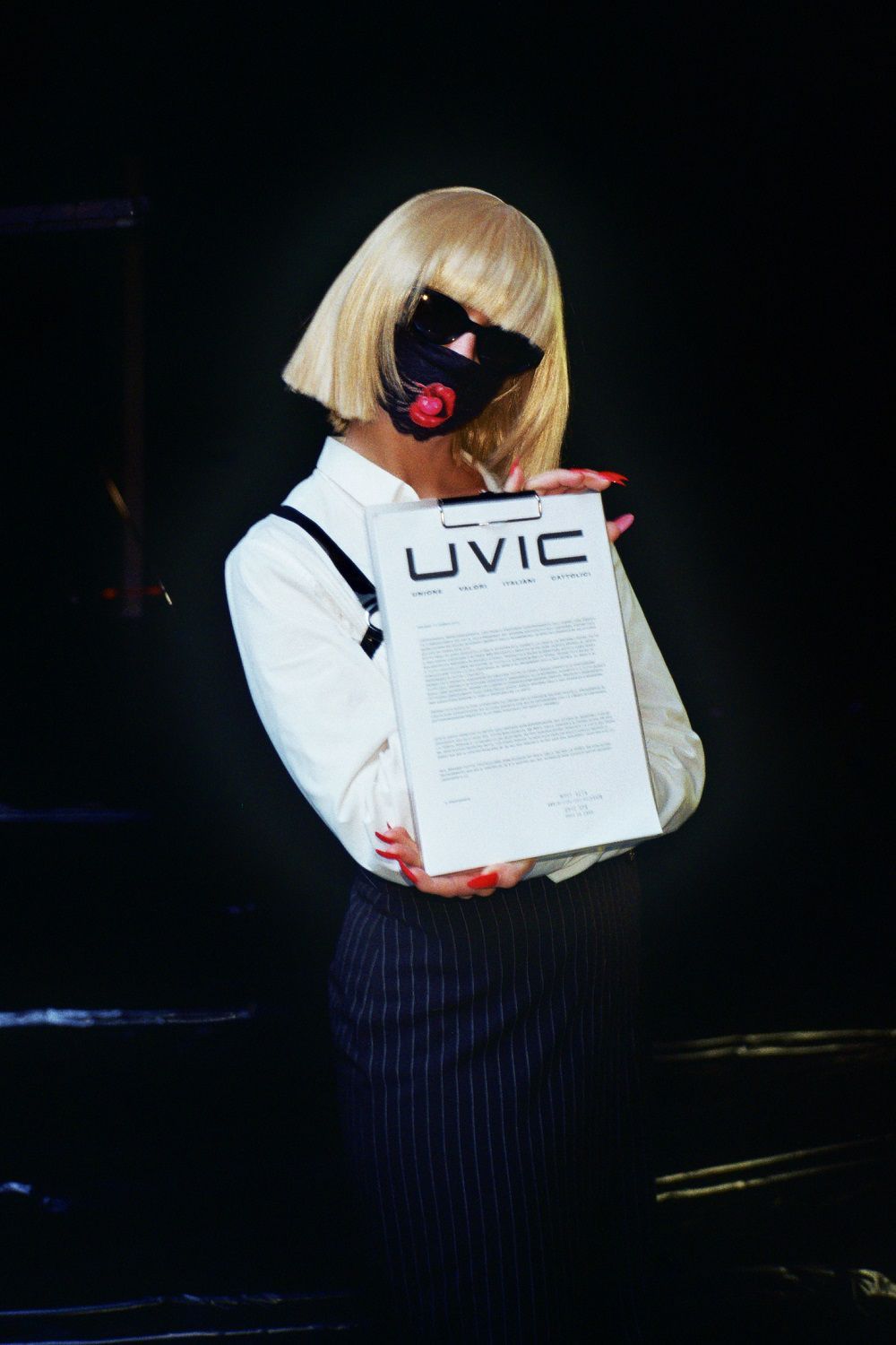 Sexy more than ever, the diva sways between a look at Lady Gaga until the return of a Britney-must: a bomb hair style and white shirt unbuttoned ... just a little bit 'Womanizer. From the black adherent jumpsuit lacquered to the super aggressive blonde maxi pigtail. A mix of references that, in UNA VITA IN CAPSLOCK, acquire meaning and historicity: from Caligola to Andy Warhol, to Matrix and to the color bars of old TV.