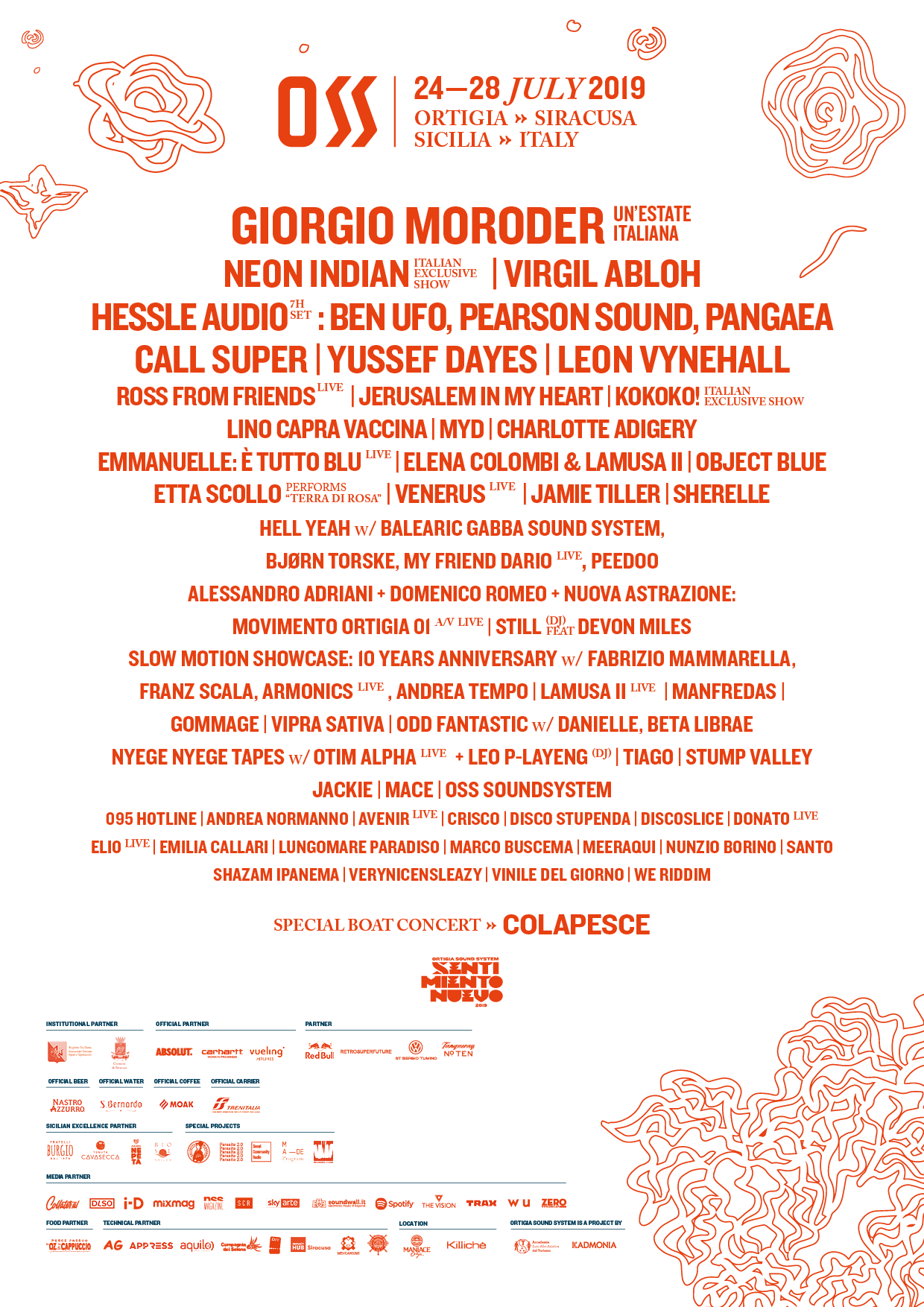 Among the artists that will be at the festival this year stand out the names of Giorgio Moroder, Virgil Abloh, Neon Indian, Ben UFO, Yussef Dayes, Ross From Friends, Emmanuelle, Venerus, and many others. To officially inaugurate the festival there will be a Sicilian artist, Colapesce, who will be the protagonist of the boat concert on Wednesday, July 24th. The line-up sees moreover the new entry of Mace, a well-known DJ and producer who boasts collaborations with the most important rappers of the Italian scene. At nightfall, the music will move to Lido Oss (Marina di Ortigia) for the traditional annual event with the Stump Valley.