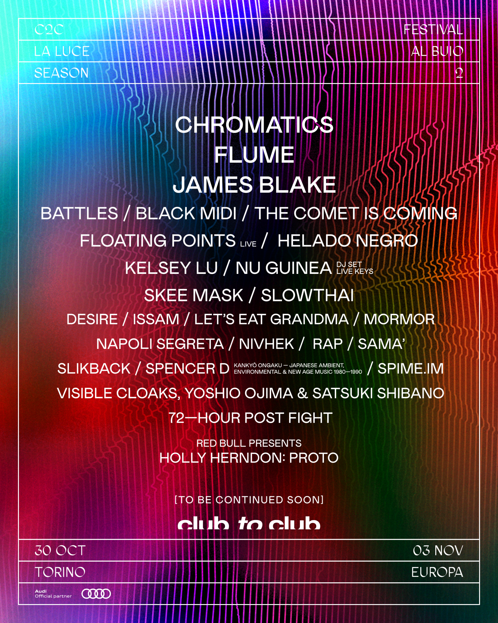 Along with these giants, Club To Club has announced today new names in its line-up, first and foremost Floating Points, strong of the success of his performance at Sónar Festival, producer, DJ and composer born in Manchester who's become one of the most respected and appreciated musicians in the current scene. But the list continues with Chromatics, Slowthai, Nu Guinea, Napoli Segreta, Desire, Let's Eat Grandma, Black Midi, Kelsey Lu, Skee Mask and many others.