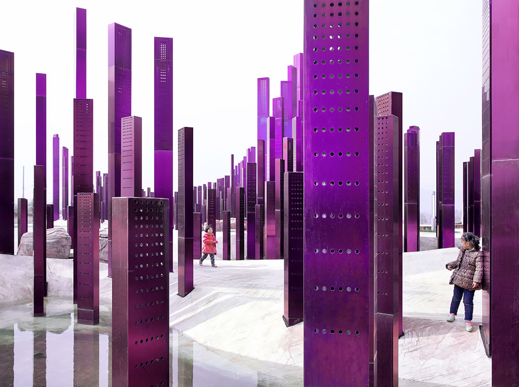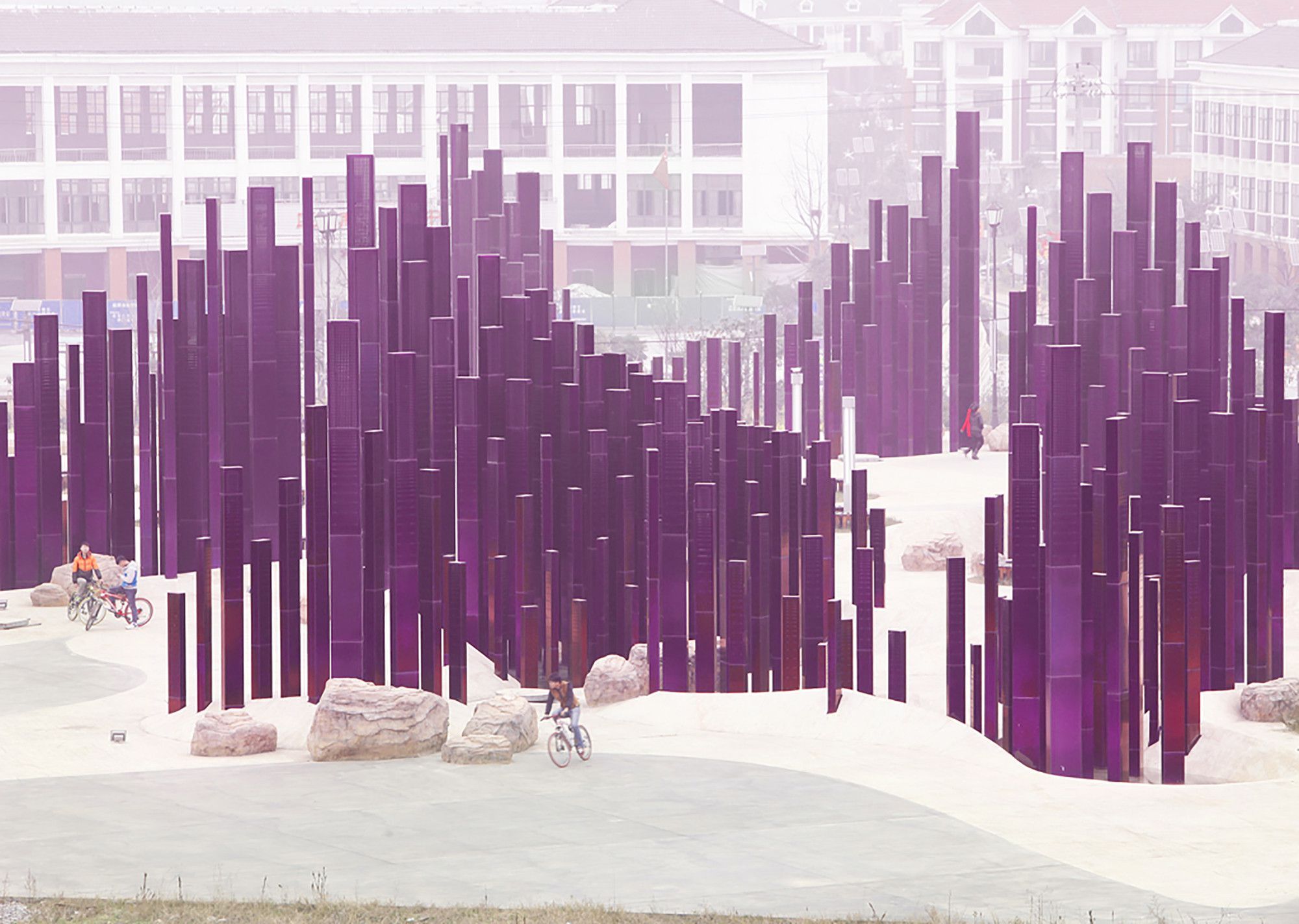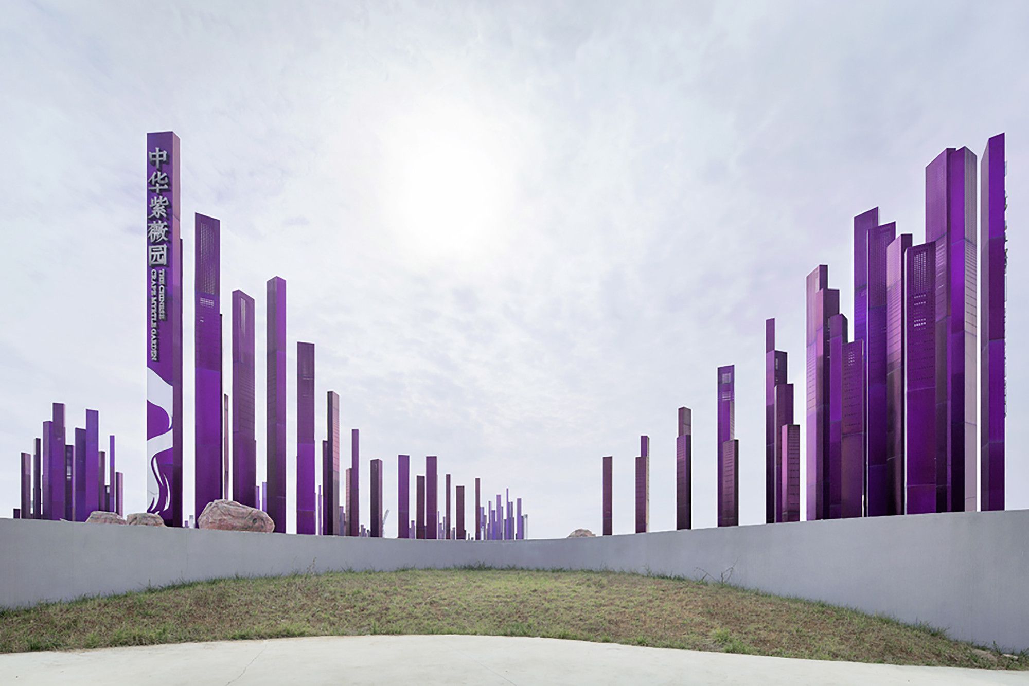 Located in Xiangyang, in the province of Hubei in China, at the entrance of the great Myrtle Tree Garden, it is an installation made up of over 500 perforated steel fins, of different heights and four shades of purple, the color of the millennial trees of myrtle that surround it.