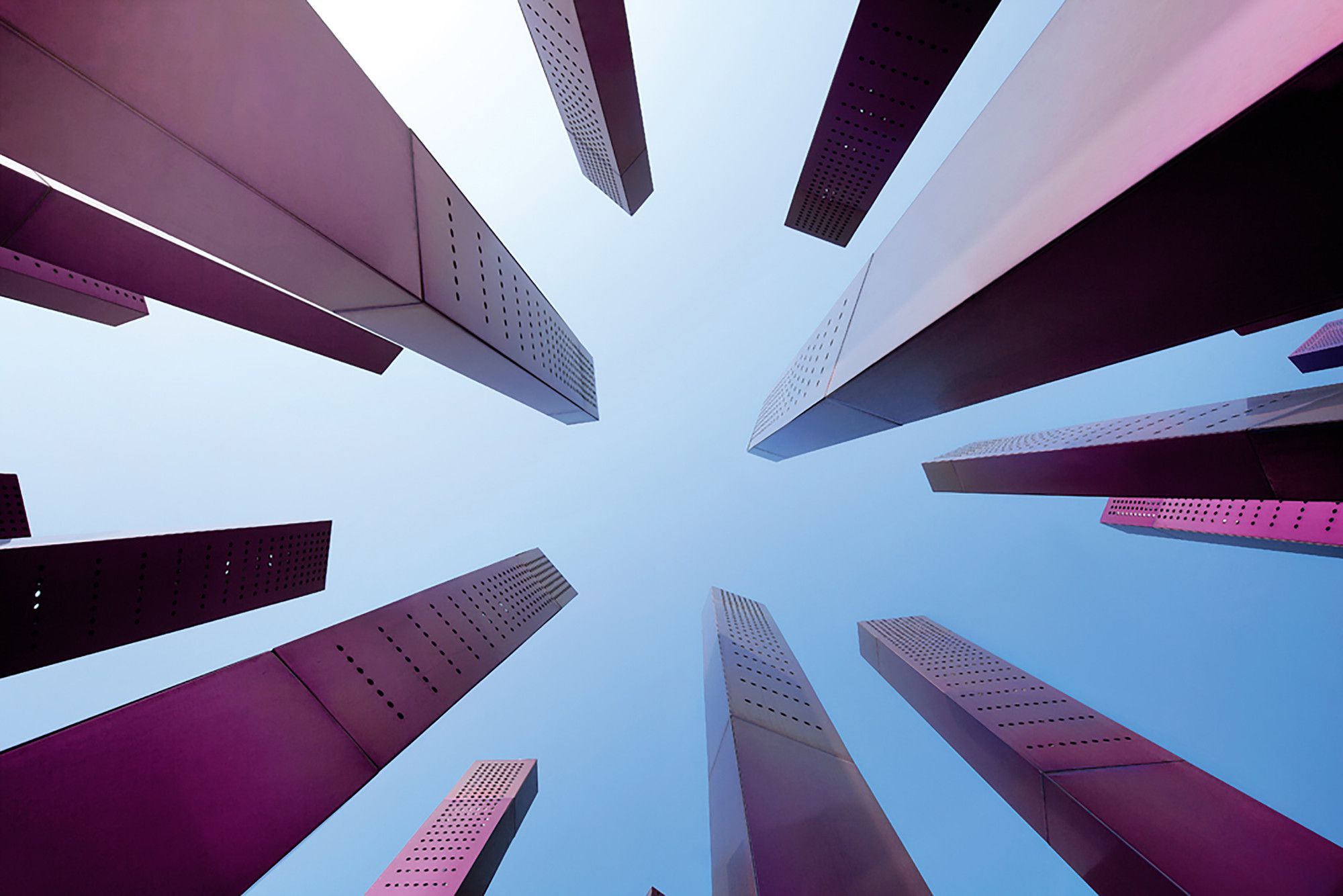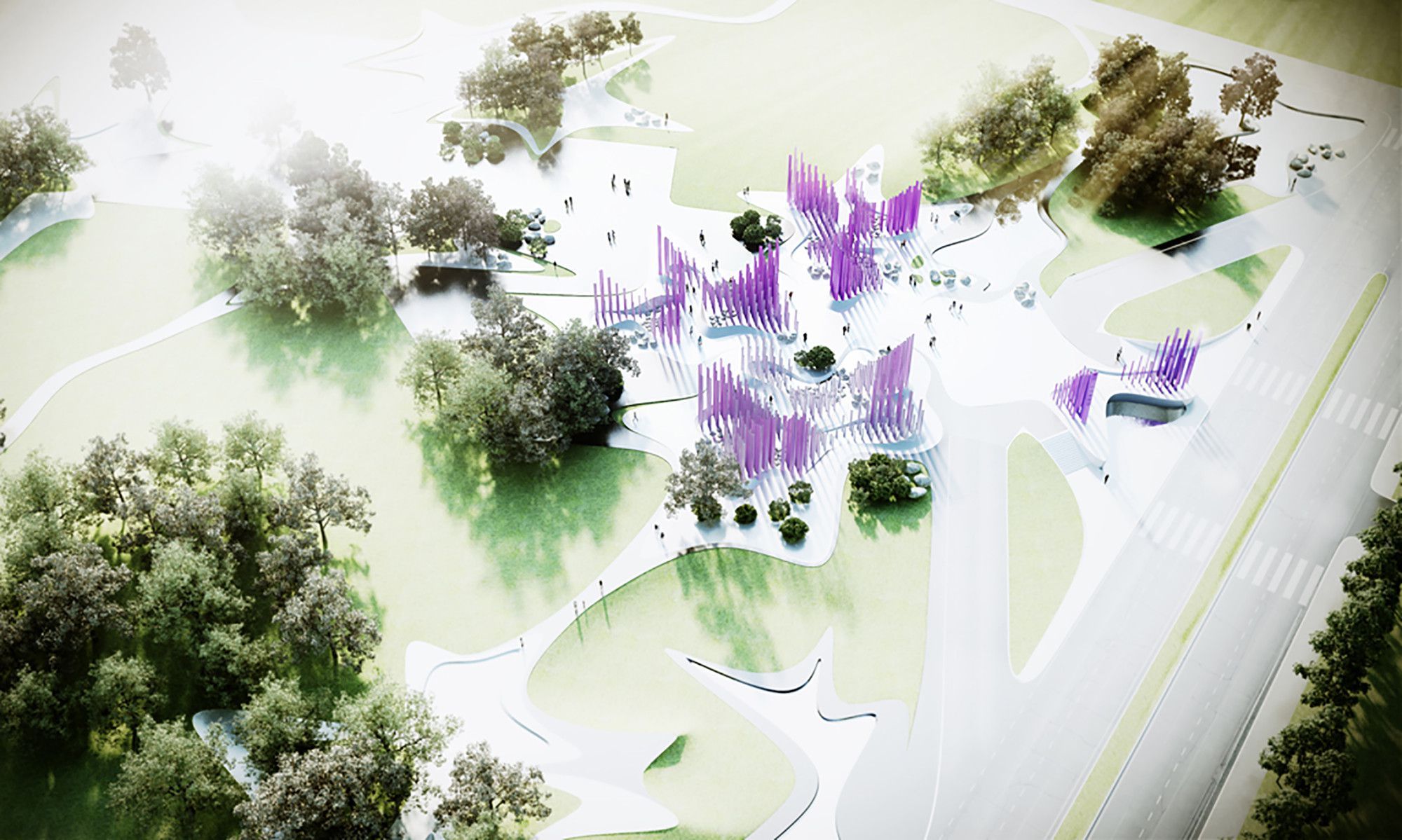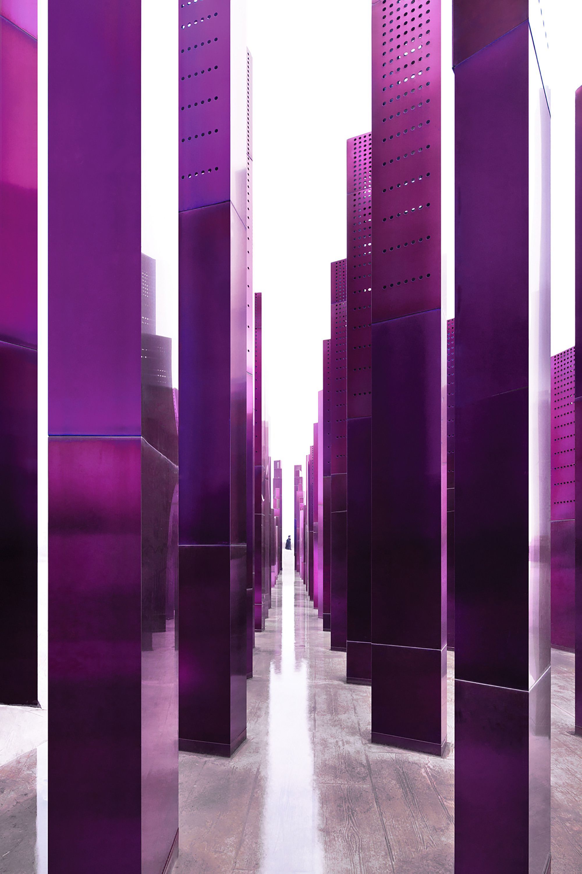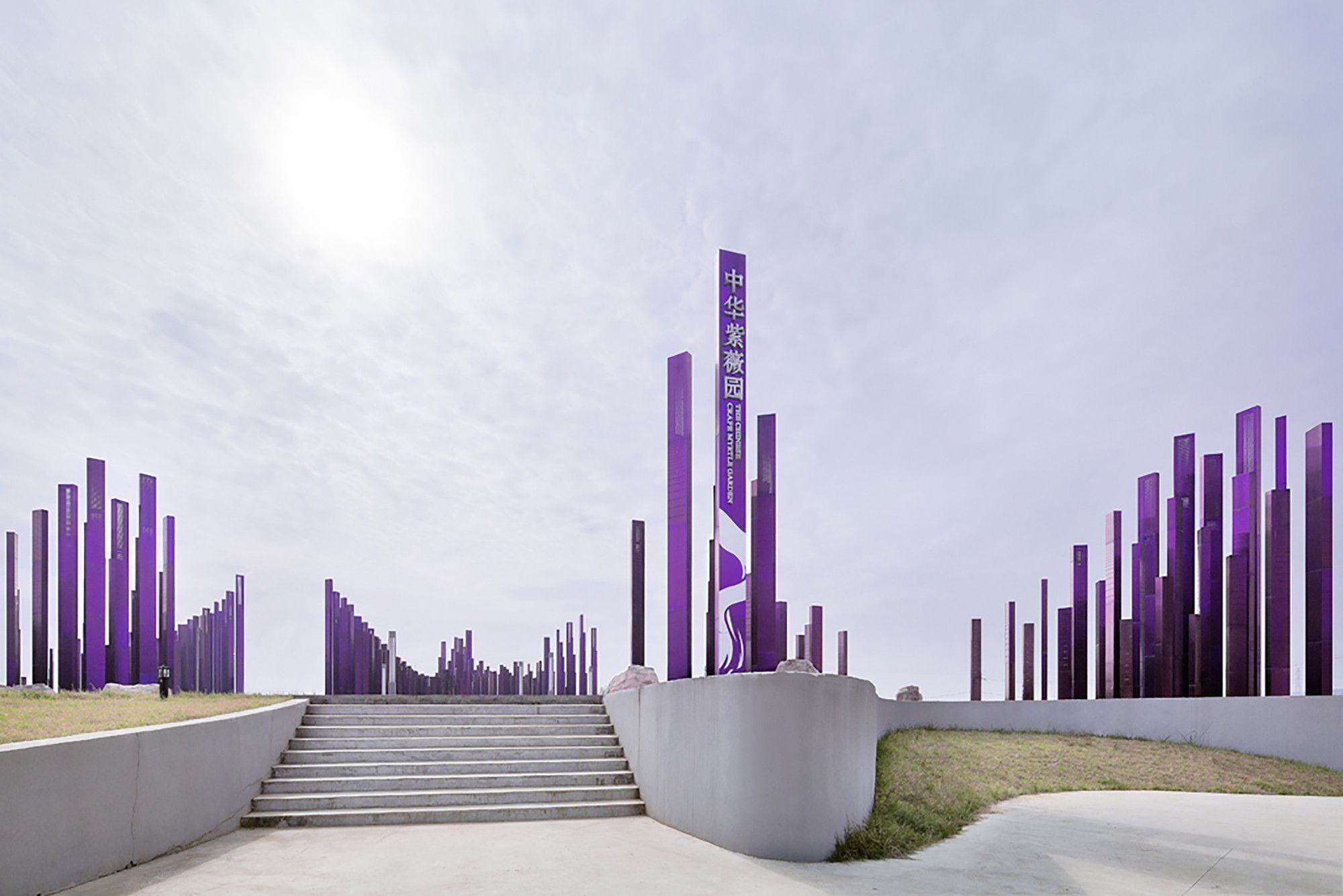 Located in Xiangyang, in the province of Hubei in China, at the entrance of the great Myrtle Tree Garden, it is an installation made up of over 500 perforated steel fins, of different heights and four shades of purple, the color of the millennial trees of myrtle that surround it.