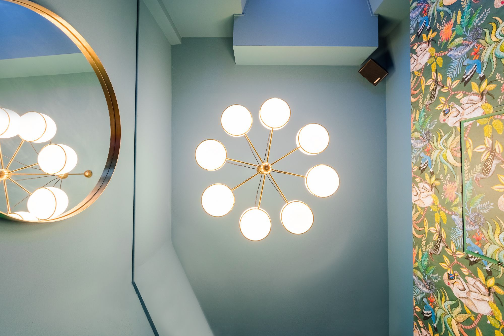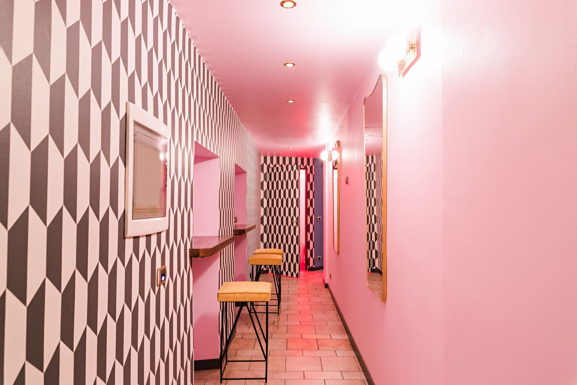 The interior designer Valentina Lubiano had created an elegant space, wrapped in the color of the wallpapers, ethnic and pop, in harmony with furniture that mixes modern design with a refined vintage. The counter dominates the entrance, also in the bronze color, combined with the gold of hand-woven wallpaper, which exploits the visual power of the chromatic effects created by the intertwining of the fibers. A refuge for relaxation and tranquility, could not renounce to the Japanese atmosphere, evoked by the design of the Ginko Biloba leaves on the wallpaper. A luminous and fascinating kaleidoscope.