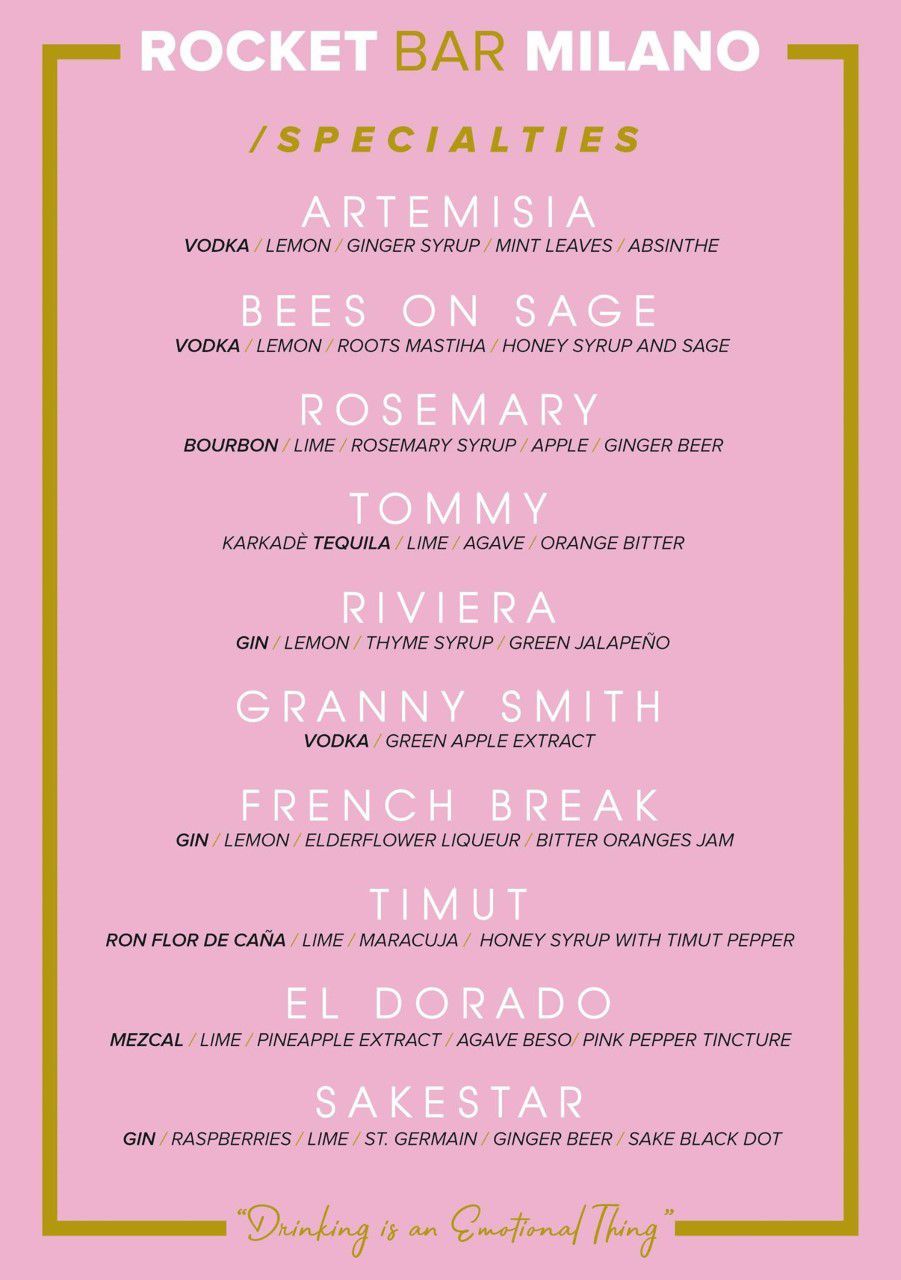 Rocket Bar is not just an art space and a mix of creativity. The cocktail offer is excellent, 10 proposals selected by Mattia Mizzi, who once again follow the concept of the journey, in this case, sensory, which goes from sake to Jalapeno, from rosemary to pepper of Timut. It is completed with the musical proposal, researched as from the Rocket's DNA, the link with the club, positioned on the opposite side of the Naviglio.
