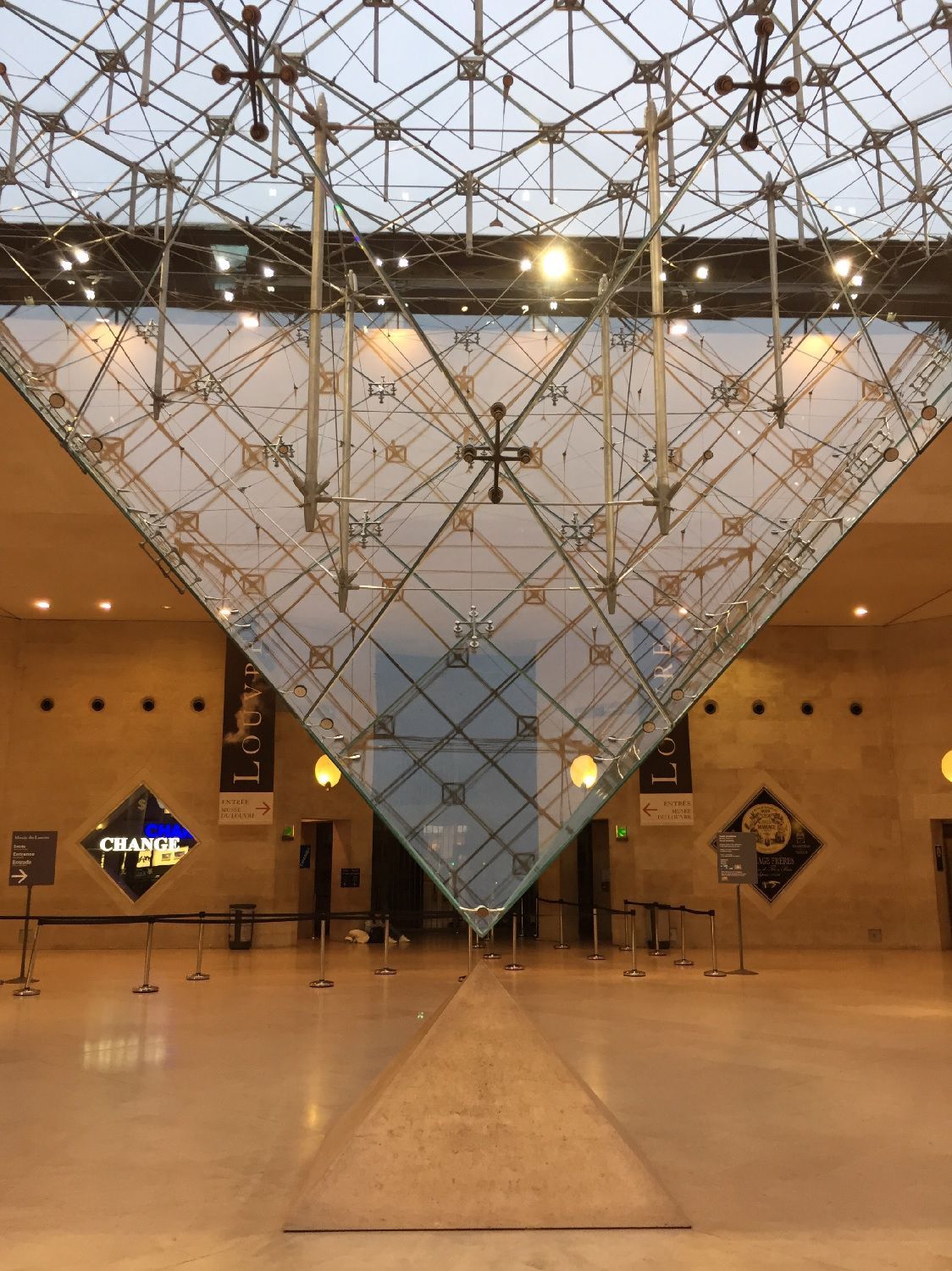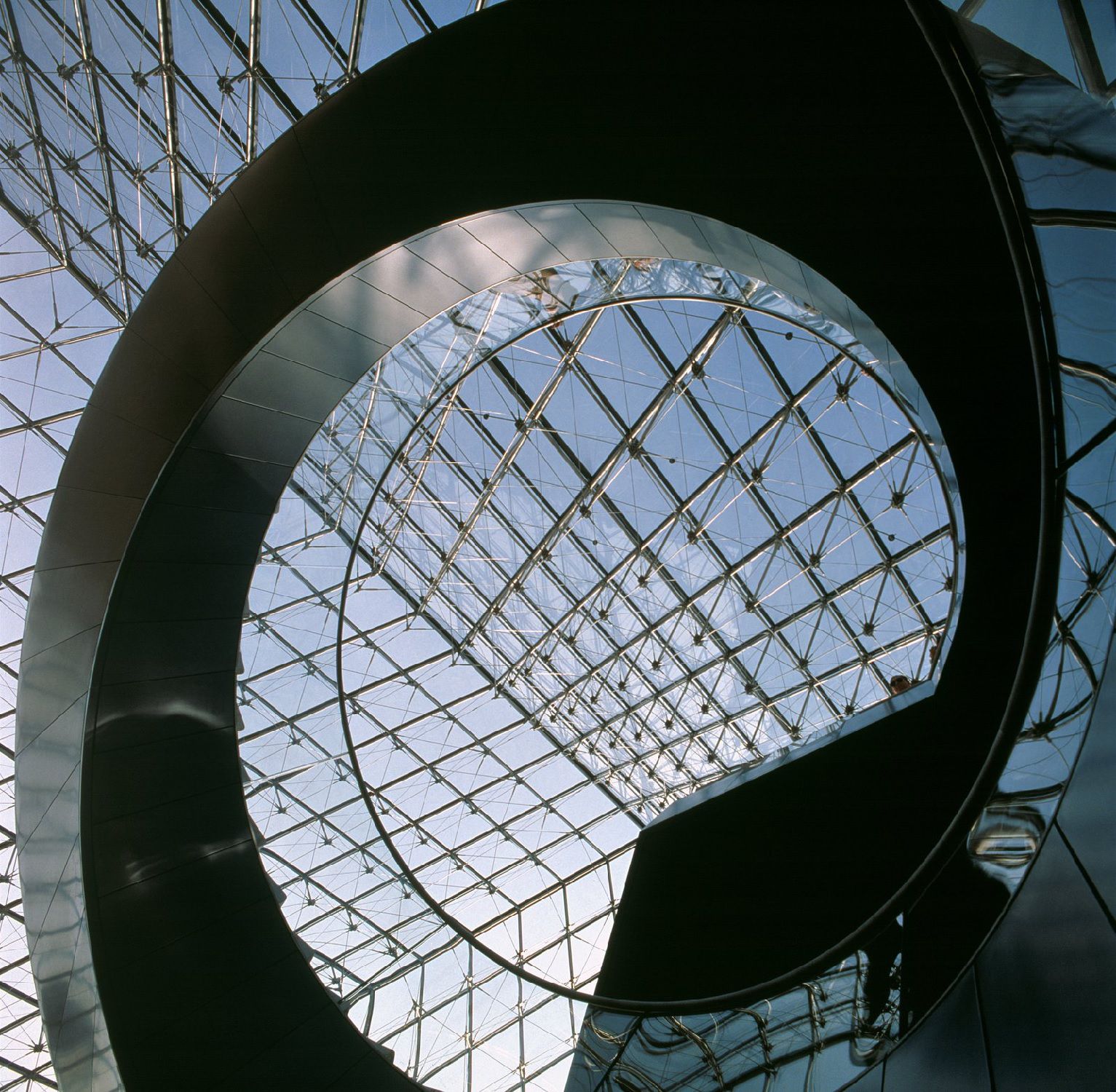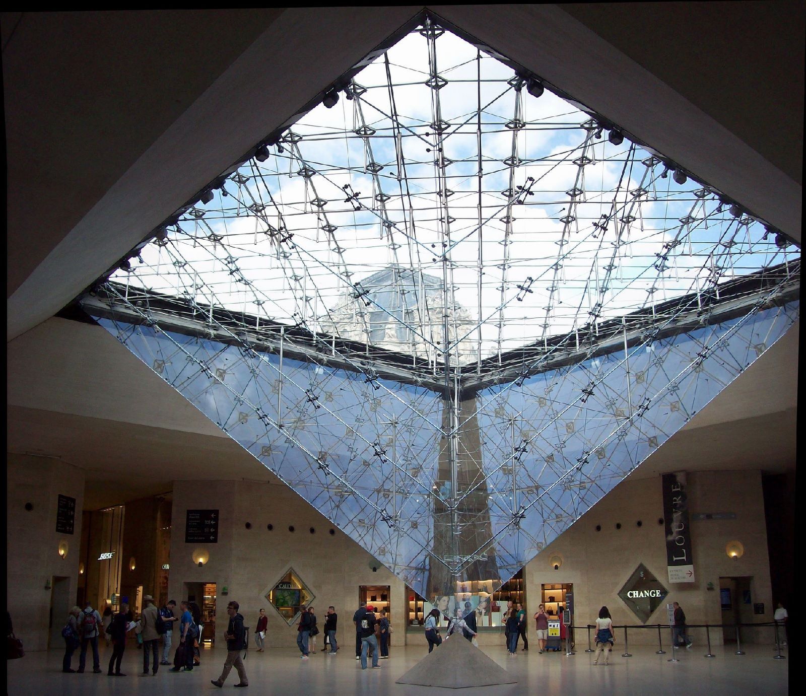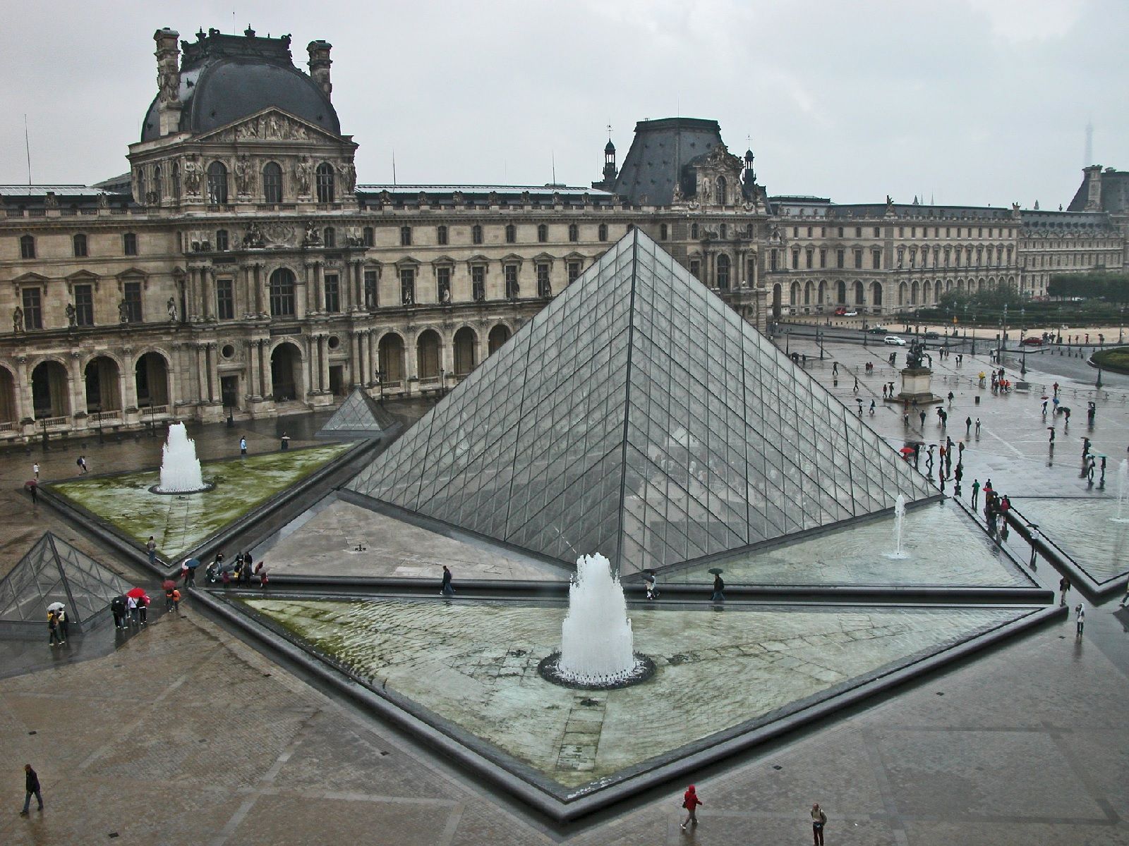 The actual project consisted in revisiting the inner courtyard of the Louvre by placing in the Cour Napoléon, instead of the two large existing tree-lined flowerbeds, a glass and metal pyramid surrounded by fountains with large flat triangular basins, arranged in such a way as to form a square. The 22-metre-high structure, with a 35-metre base, consisted of 70 triangular and 603 diamond-shaped glass panes supported by a 200-tonne aluminium and stainless steel frame. In order to complete and amplify the scenic effect, Pei had planned another three smaller copies of the five metre height around the main pyramid; while the interior would have housed an upside-down 7 metre high pyramid and a square plan with a 16 metre side that descended like a convex body almost reaching another rocky structure of the same geometric form.