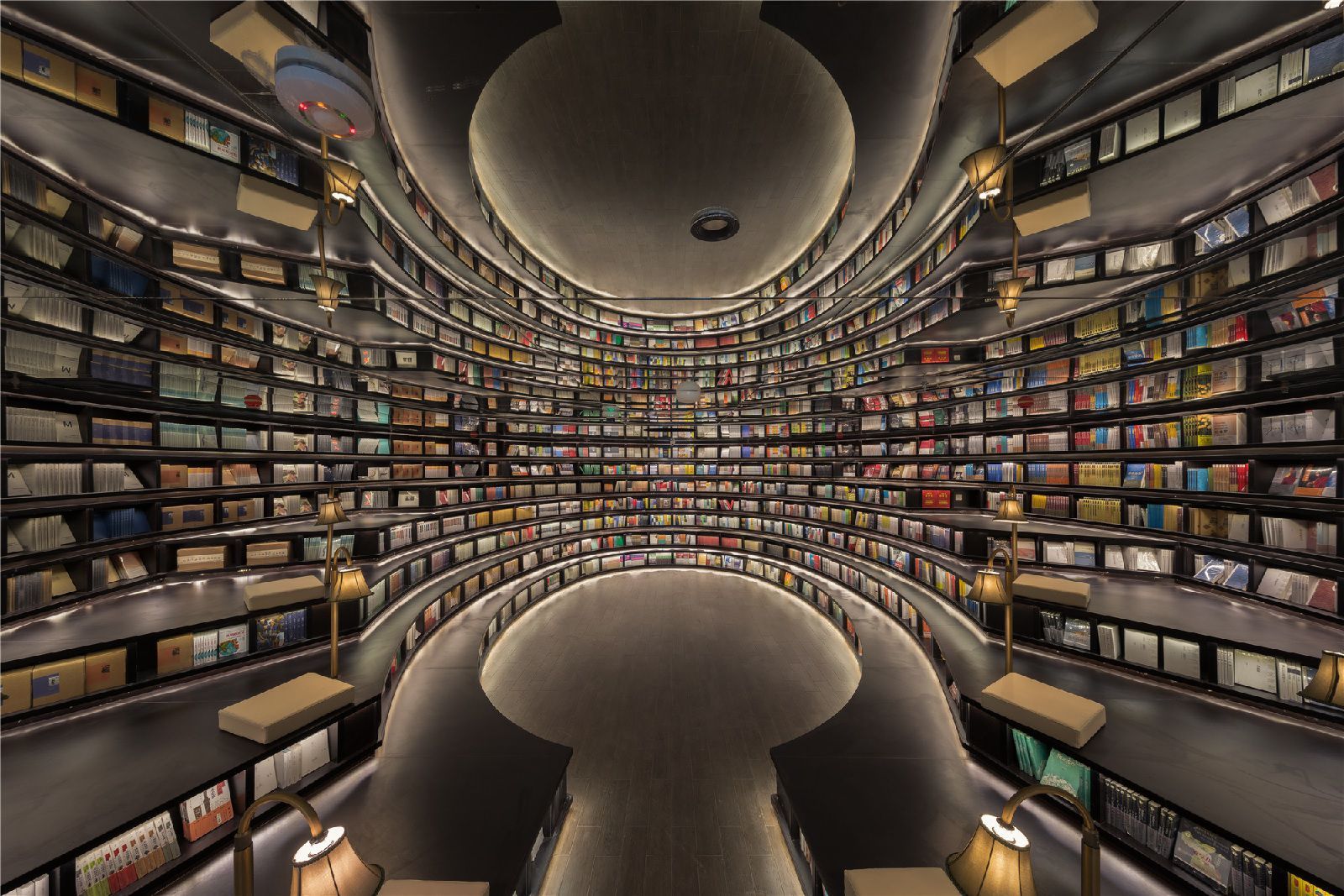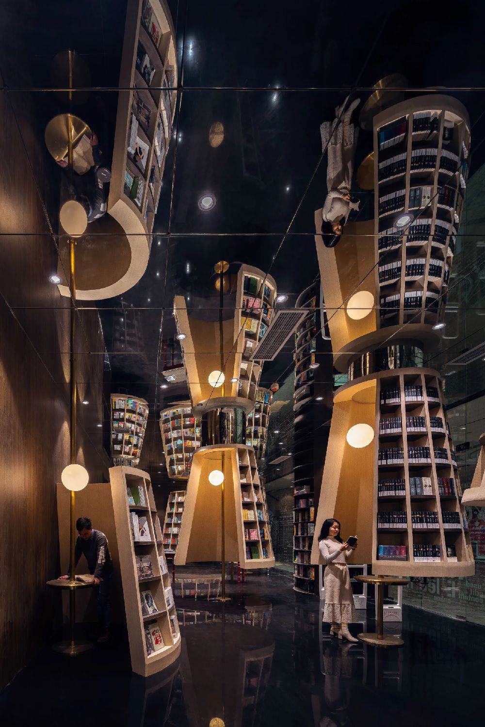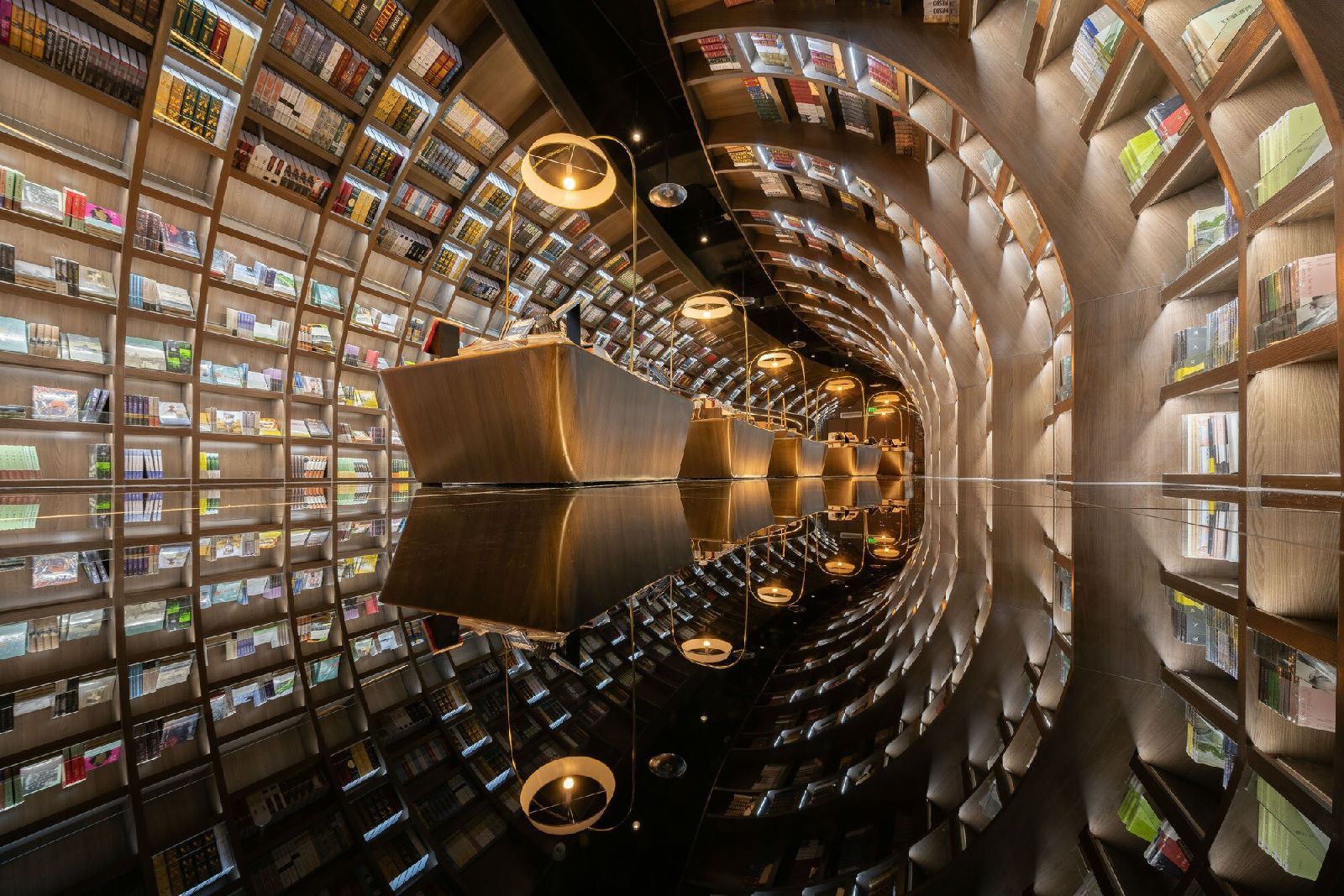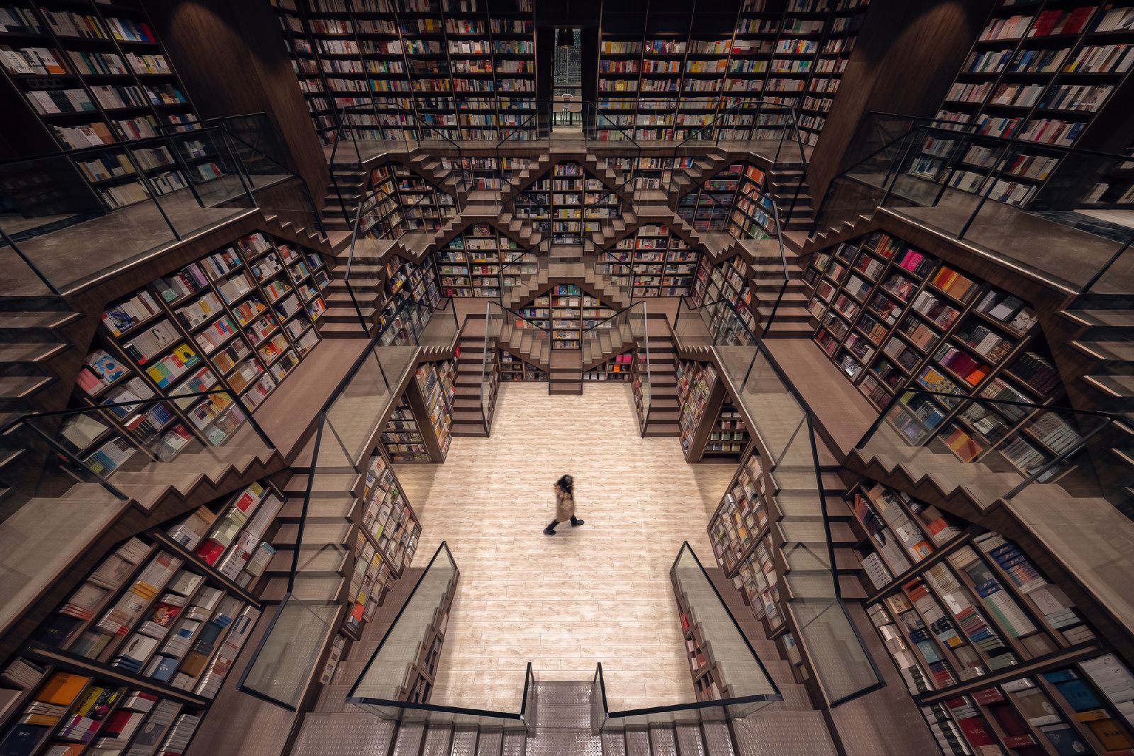 China continues to amaze with its unique architecture. This time we are impressed by a beautiful and unusual bookshop located in Chongqing, a city in the southwest of the country, located at the confluence of the Blue and Jialing rivers, which is considered the largest metropolis in the world. Here, on the third and fourth floors of the Zodi Plaza, the X+Living studio has built a unique space that seems to have come out of the creative genius of MC Escher. The team of architects recreated the same impossible perspectives, made up of stairs, shelves and mirrors that give the optical illusion of an infinite labyrinth. A series of mirrors positioned ad hoc and an entrance hall designed as a single double-height environment guarantee, in fact, the hypnotizing and surreal multiplication of a multitude of stairs and shelves, all made in warm tones of wood, where the only stains of color are given by the thousands of books on display. Beyond these elements, all the other furnishing accessories are made of transparent glass. Another peculiarity of this bookstore are the "lampshade shaped shelves" that are scattered throughout the lobby. These are cabins where visitors can gather with friends to enjoy reading and enjoying their free time. In a corner of the lobby is a children's reading room full of colourful shelves depicting landscapes, buildings and transport in Chongqing. The Chongqing Zhongshuge welcomes visitors with an atmosphere reminiscent of the set of a science fiction film in which a tunnel of books seem to lead to knowledge, including fantasy stories, mathematical theorems, philosophical treatises and all the knowledge enclosed within the walls of this extraordinary building.