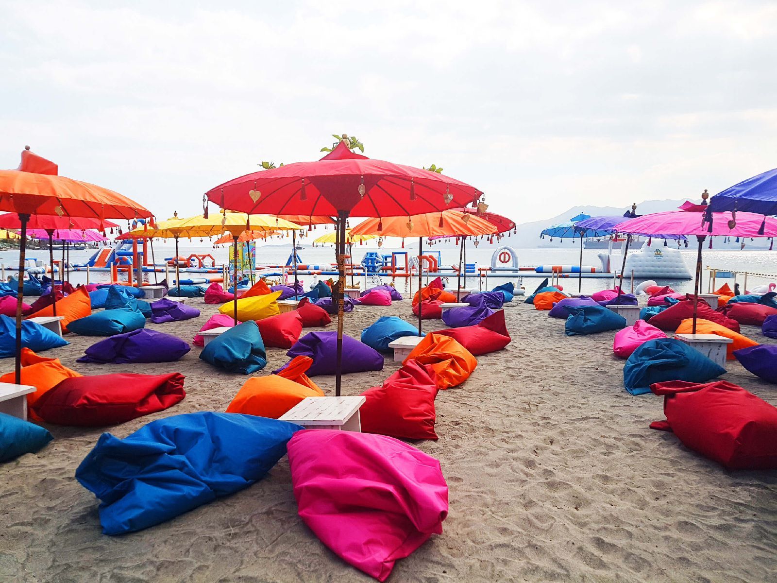 In addition to the water fun, the island offers the Bali Lounge, a huge beach with giant sunflower shaped parasols and inflatable poufs in yellow, turquoise, pink and purple, where you can relax, sunbathe, cool down with drinks and eat.
