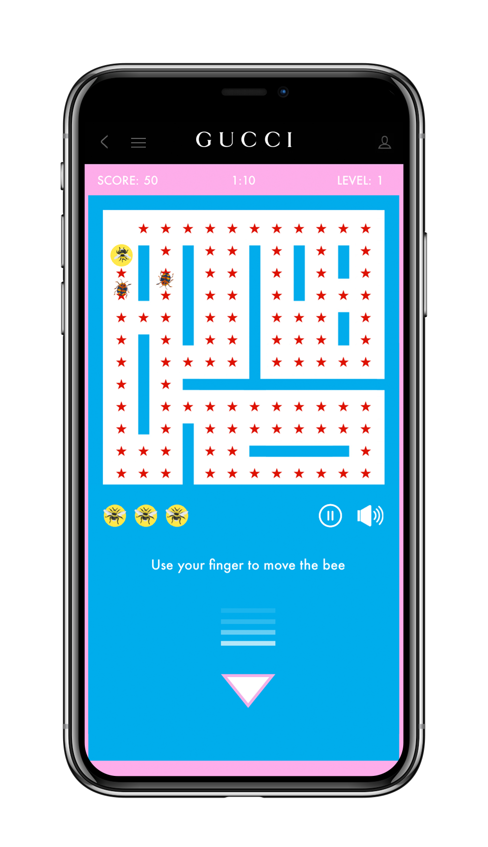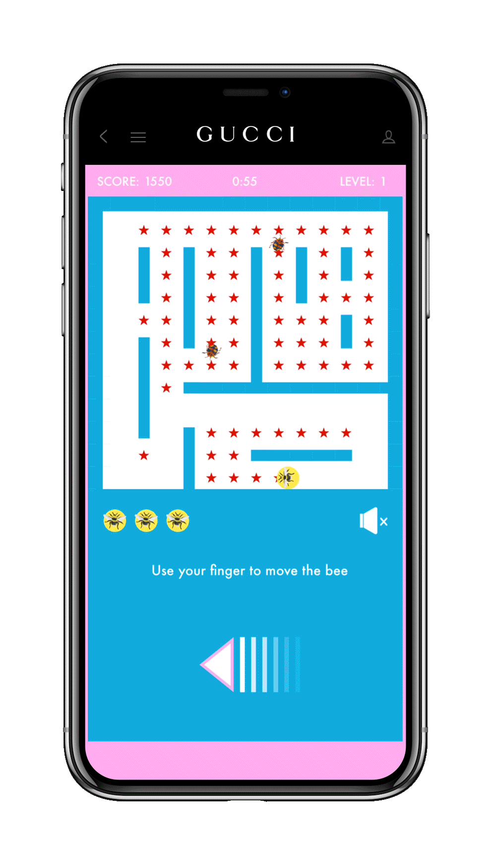 Gucci Bee centres on a bee - an icon in the aesthetic of the Maison - that is trapped in a maze. Players must pilot the bee through three levels of increasing difficulty, collecting badges and discovering special elements to score extra points.