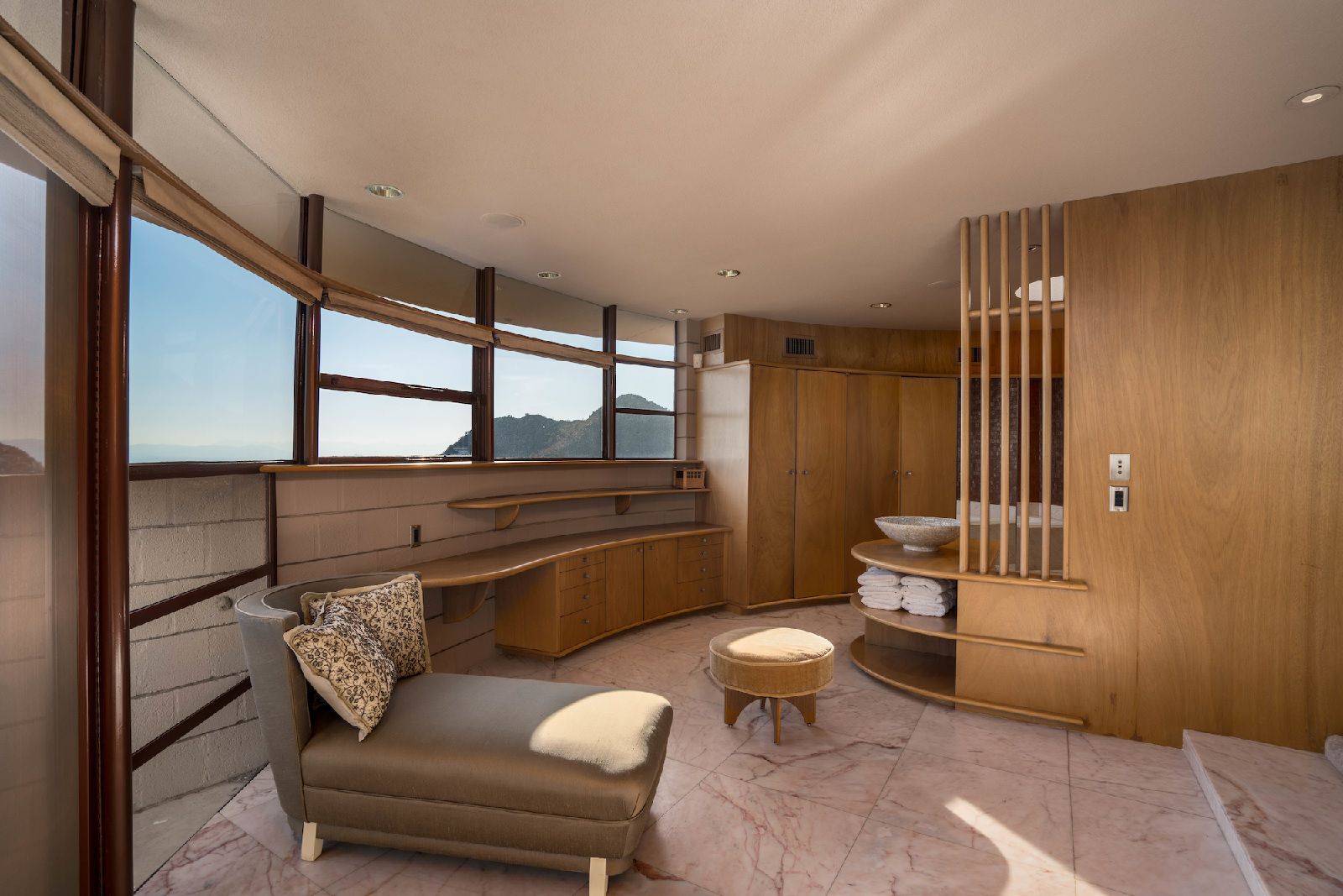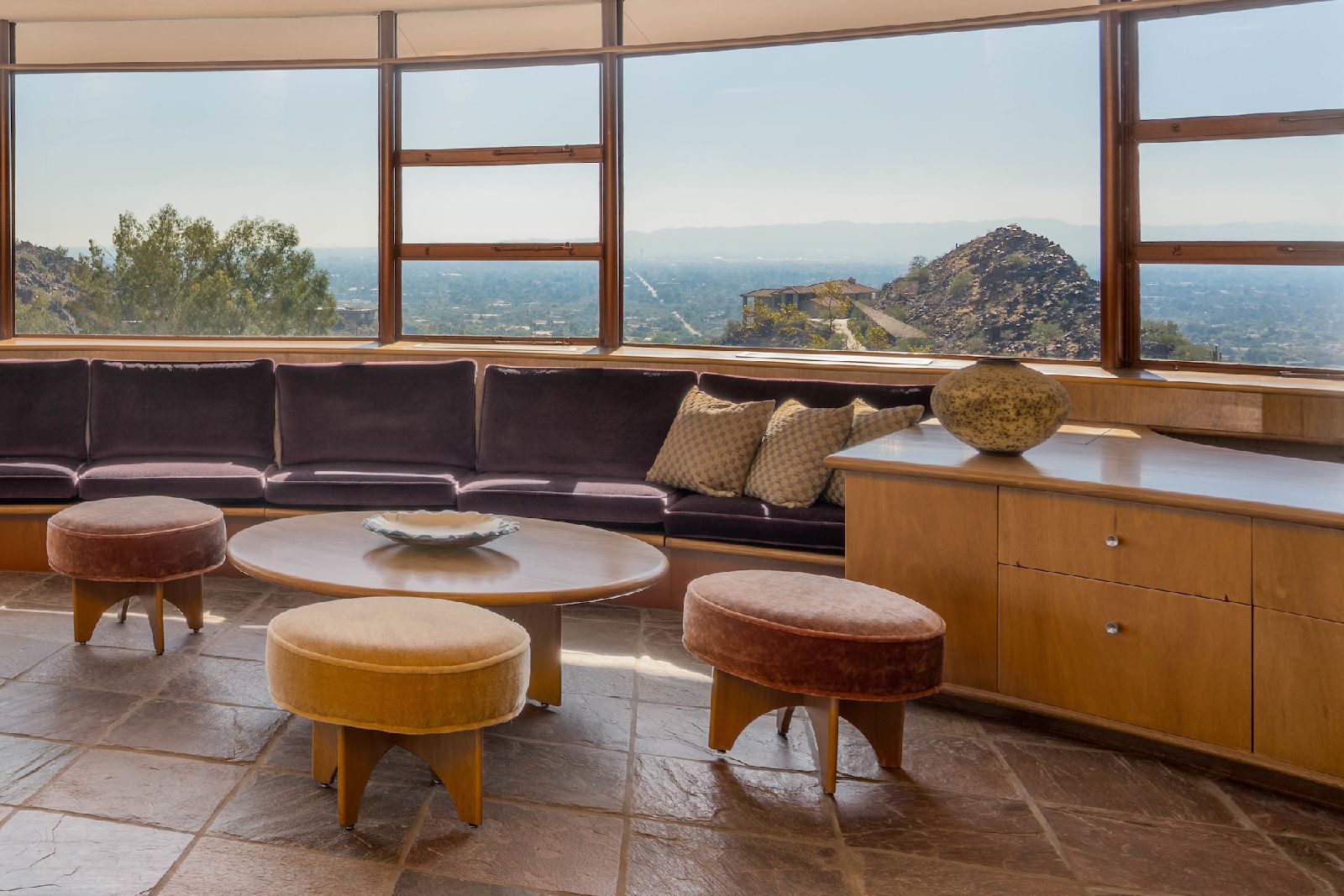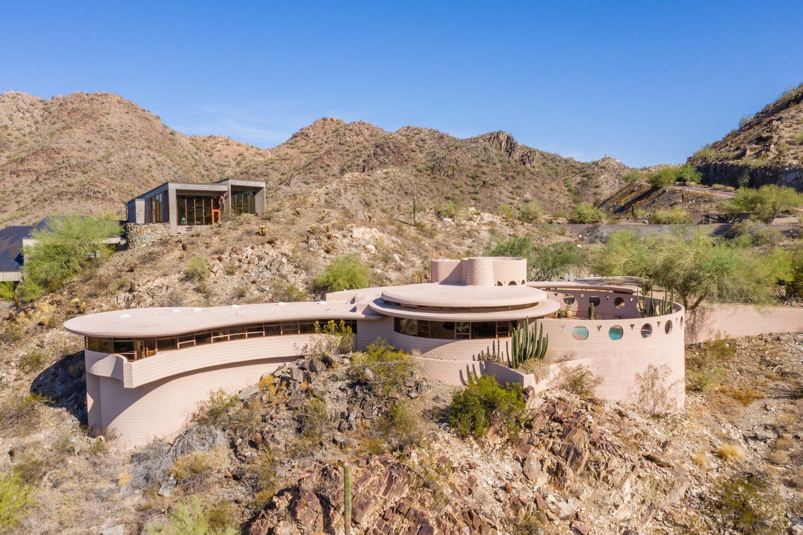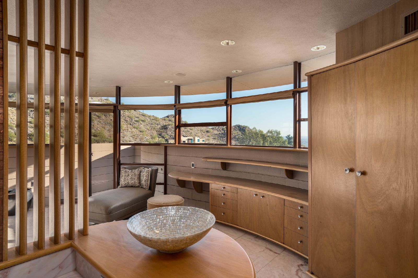 The sun always shines on Paradise Valley, a desert oasis nestled between Camelback Mountain, McDowell Mountains and Phoenix Mountain Preserve. Right here, set between the canyons of Arizona, is the latest work by Frank Lloyd Wright. Known as Norman Lykes House or Circular Sun House, the residence is characterized by its shape composed of a series of circular elements that fit perfectly into the topography of the landscape. Wright designed it in 1959, a few months before his death in April of the same year. Built in 1967, it was later renovated by his apprentice, John Rattenbury, in 1994. The original project, a repetition of arches and circles, featured a structure of colored concrete blocks shaped in this way to merge with the rocks that surround it and to emphasize the impression that the mountain embraces the house. The building's eye-catching futuristic design has an area of approximately 3000 square meters, a space that includes 3 bedrooms, 3 bathrooms, a private office on the second floor with a 360-degree view and a garden terrace with a swimming pool covered in mother-of-pearl. The second owner of the building has made some changes to the archistar's concept such as, for example, reconfiguring the bedrooms, cutting the number of bedrooms from five to three, transforming the workshop into a media room with a home theater and reducing the dark wood interior cladding of the walls. The furniture remains entirely handmade in Filippino mahogany. The most important element, in addition to its architecture, which makes the villa unique, is the breathtaking view of the canyon.