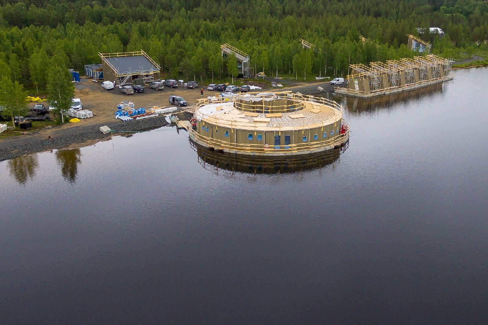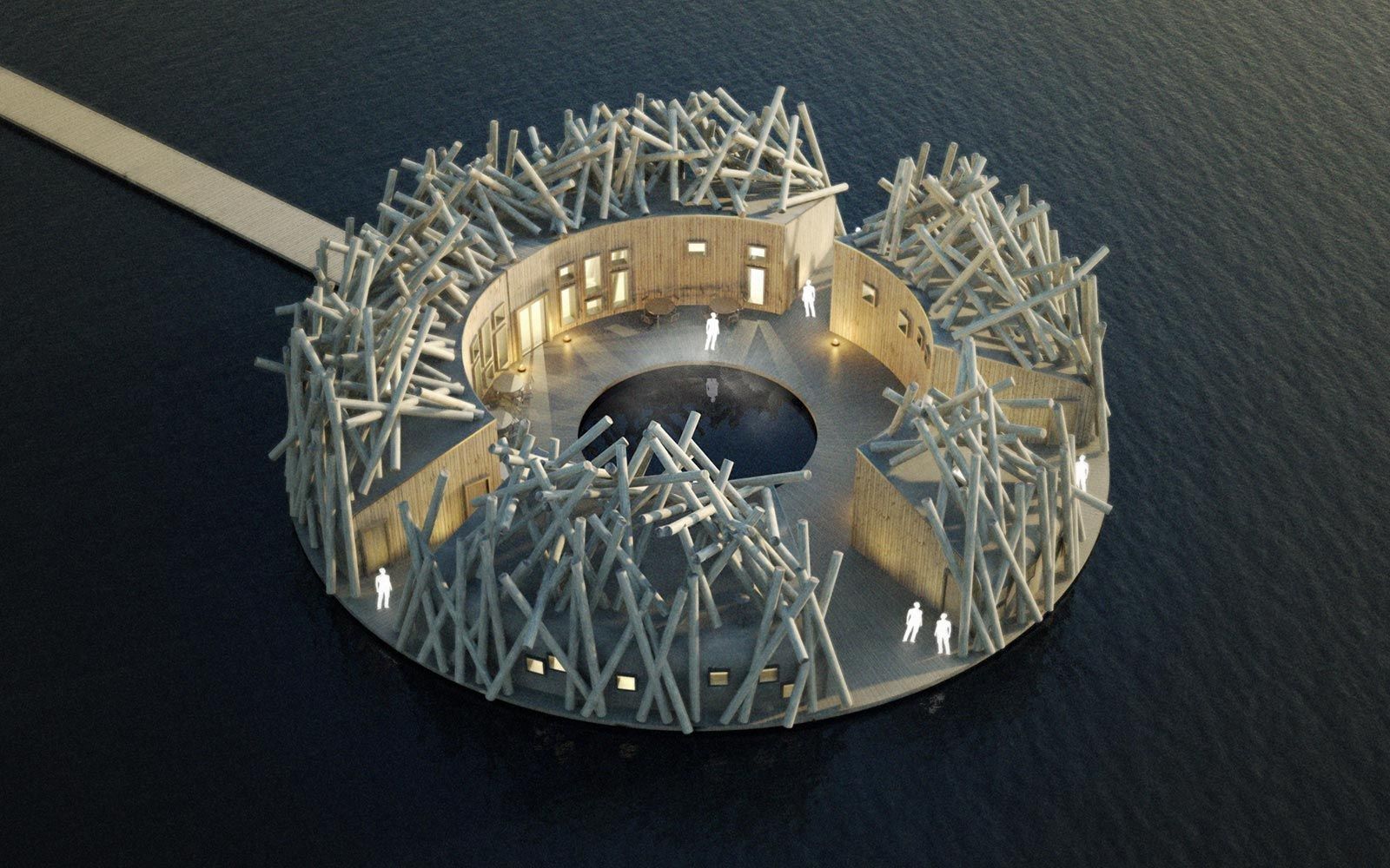 Christmas holidays are getting closer and among the most beautiful destinations where you can spend a few days, immersed in the silence of nature, there is Swedish Lapland. Here, nearby Harads (the nearest airport is Luleå), architects Bertil Harström, Johan Kauppi and Annkathrin Lundqvist designed the Arctic Bath Hotel, a resort inspired by floating logs that, after cutting down trees in the forest, were transported along the river. In fact, it is a circular structure covered with tangled trunks that floats in the center of the Lule River in summer, while in winter, set in the ice, it seems almost a contemporary art sculpture. Its 500 square meters include a spa, sauna, bar, restaurant, six exclusive suites connected to the mainland by a walkway and six other small huts along the river bank. A total of twelve rooms made of wood and eco-friendly materials, each with its own fireplace and furnished in the typical minimalist Scandinavian style. The real design feature is hidden in the center of the resort: an open space with a 39 degree Fahrenheit water pool, perfect for the typical Swedish Arctic bath.