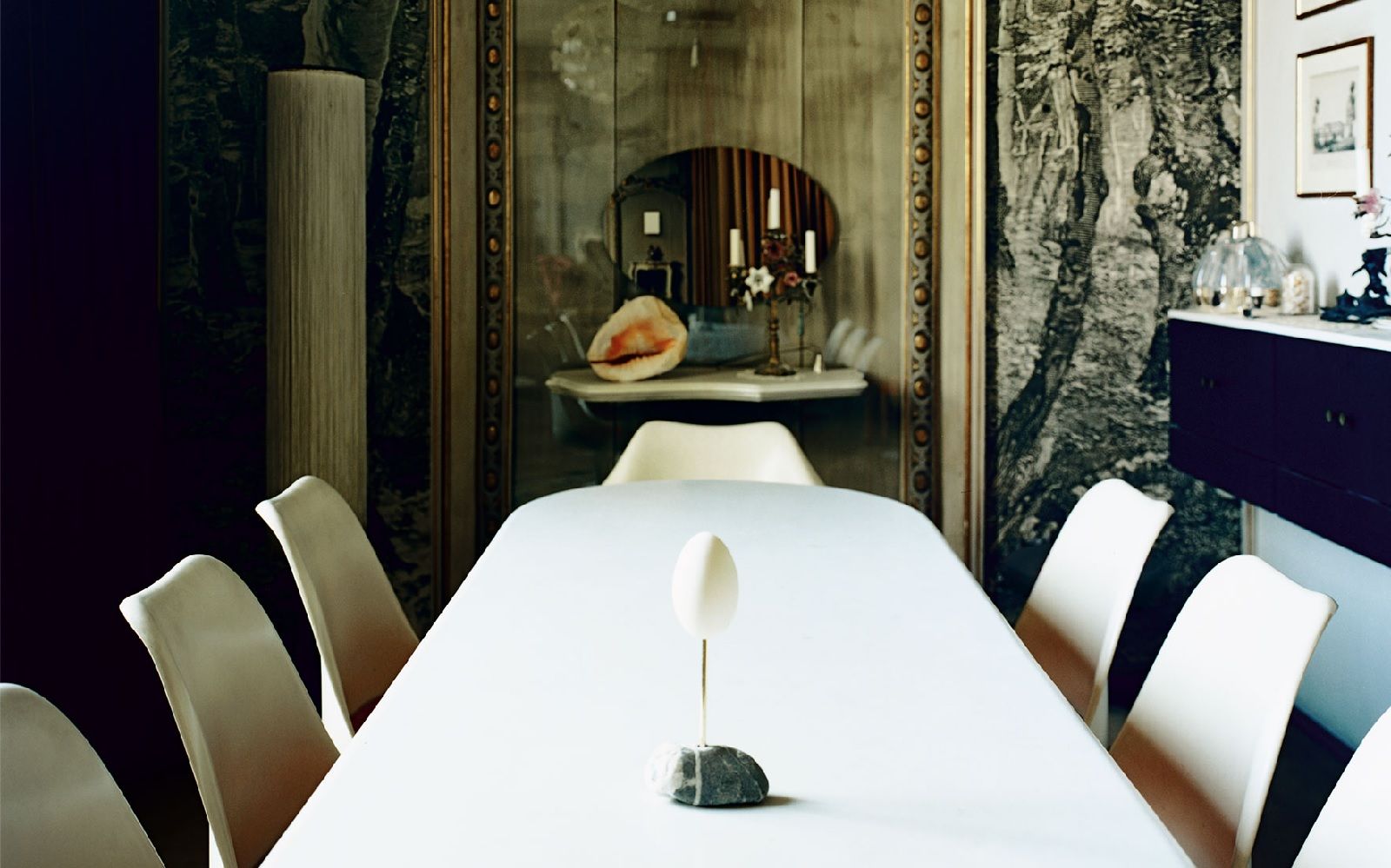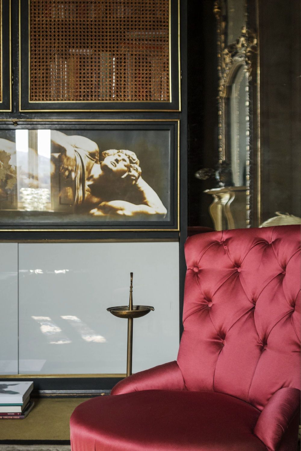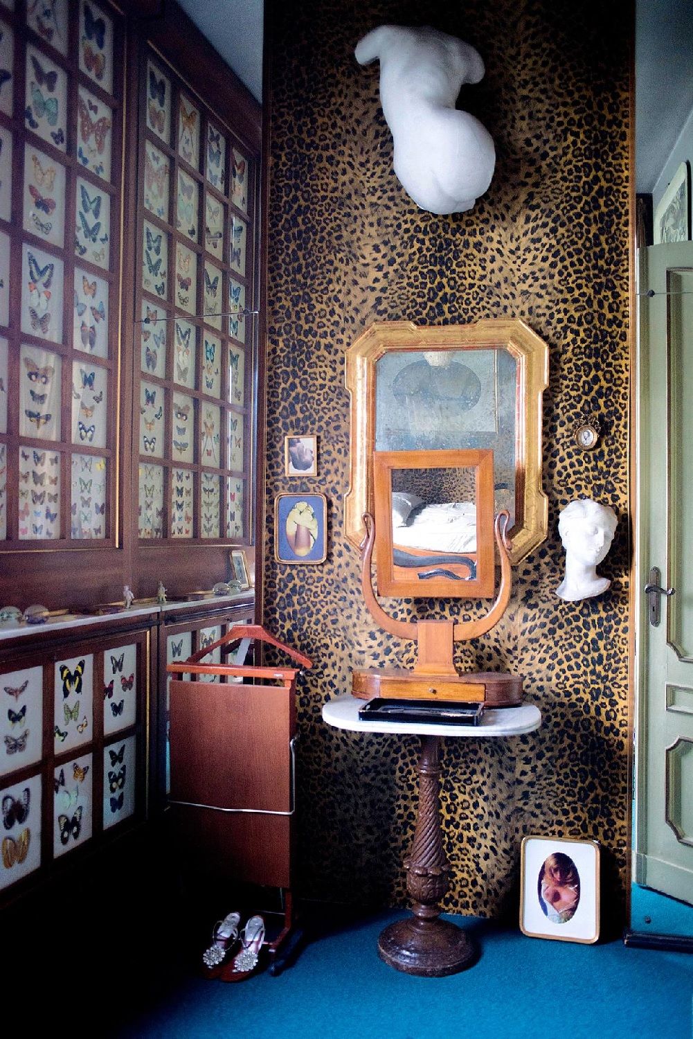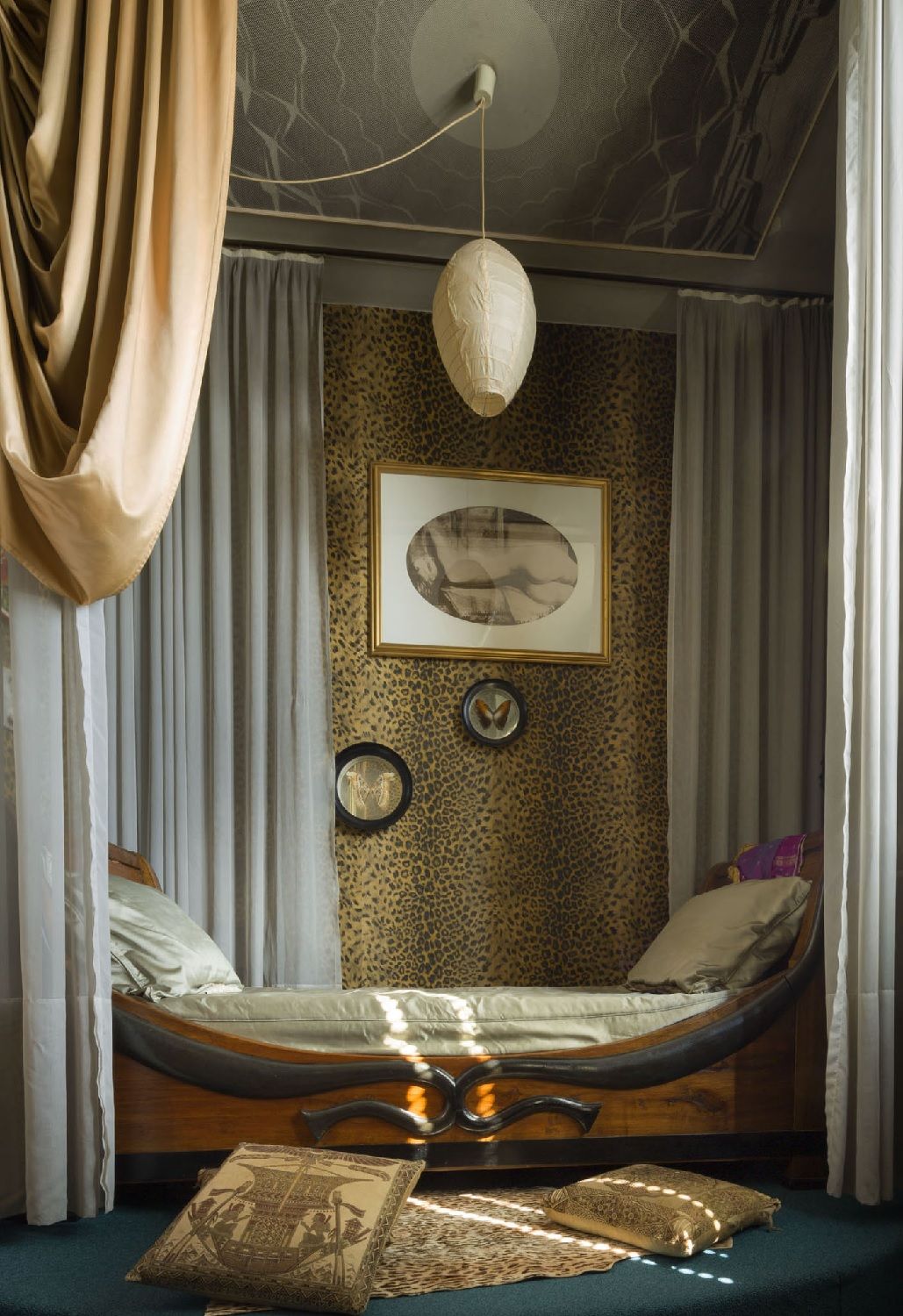 The eclectic artist lived all his life in the family home in Rivoli, but on the death of his father, he inherited a small apartment in the center of Turin, in a small villa of the late nineteenth century. Here, in this house in Via Napione 2, between Piazza Vittorio Veneto and the Po, he staged his private pyramid. It seems, in fact, that between 1960 and 1968 he spent time designing every detail, inspired by the tomb that the Egyptian architect Kha, in the service of the pharaoh Amenhotep III, had built in the fourteenth century BC for himself and his wife Merit. It is a secret refuge, unknown even to his closest friends like Carol Rama who lived on the same street, populated by artifacts of all kinds. The rooms are full of a mix'n match that resembles more a bric-à-brac shop than a house. So it's no coincidence that Mollino hasn't spent a single night here (it's said that he hasn't even opened the windows). In this labyrinthine wunderkammer coexist leopard walls, arabesque majolica, zebra carpets, mirrored and reflective surfaces, sculptures and chairs inspired by the female body, damask fabrics and curtains, fireplaces, wood-themed wallpaper, red satin armchairs, black sofas, a modern dining room yet with Tulip chairs and ancient chaise-longue. There are many occult symbolic references to the ancient Egyptians: from the nineteenth-century boat-shaped bed to the oval table that recalls a funerary monument, to the wall covered with colorful butterflies, a symbol of women and rebirth after death.