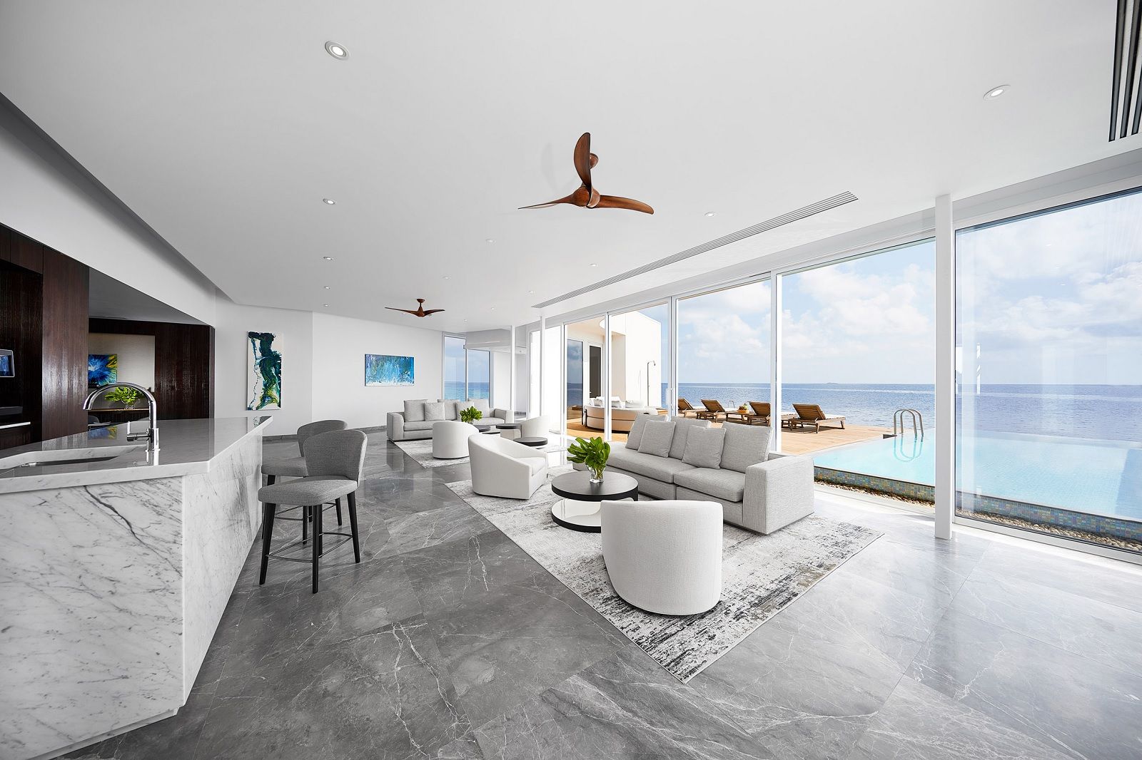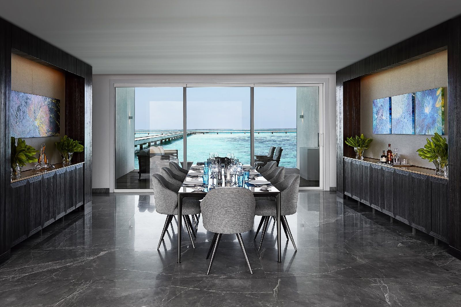 The Muraka, which means "coral" in Dhivehi, the local language, has an equally exclusive upper floor. Here you find an additional king-size bedroom, an indoor swimming pool, a double bedroom, a bathroom, a service bathroom, a gym, butler accommodation, a private security area, a living room, a kitchen, a bar and a dining area. For those who prefer to enjoy the outdoor views, an upstairs west-facing bridge is perfect to watch the sunset, while on the opposite side of the residence has been built an east-facing bridge for sunbathing, complete with an infinity pool.