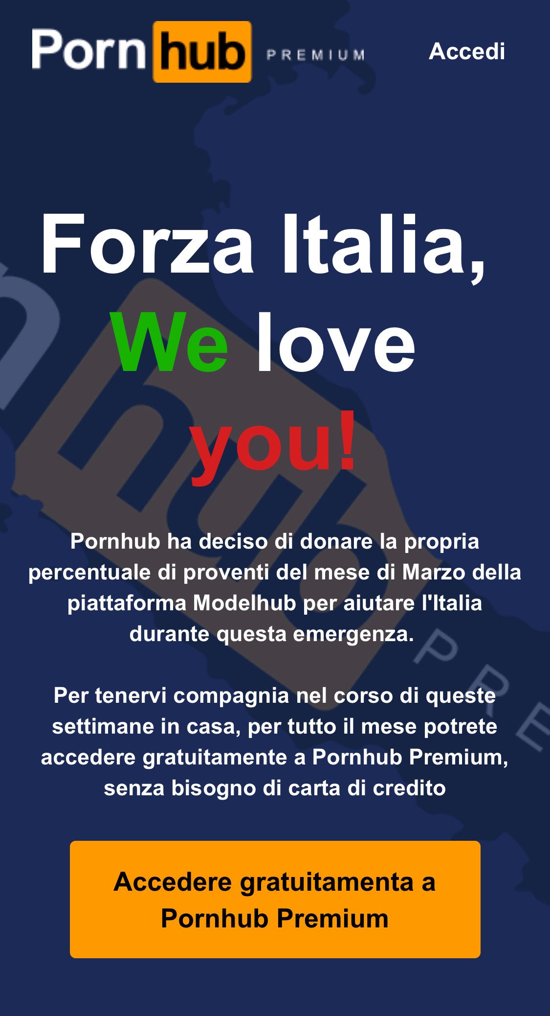 To be specific, the most famous hard video sharing website in the World will be giving for free to all the Italian citizens its upgrade Pornhub Premium. It will be enough to subscribe at this link and there will be no request for any payment information. Furthermore, Pornhub will devolve part of its March Modelhub's incomes to help the sanitary facilities in Italy.