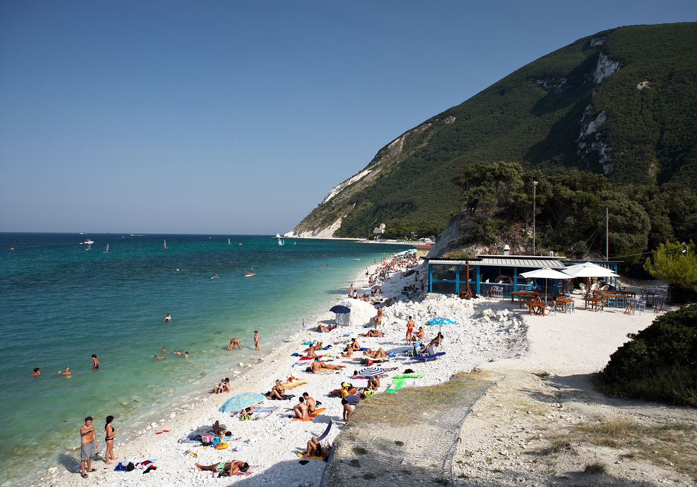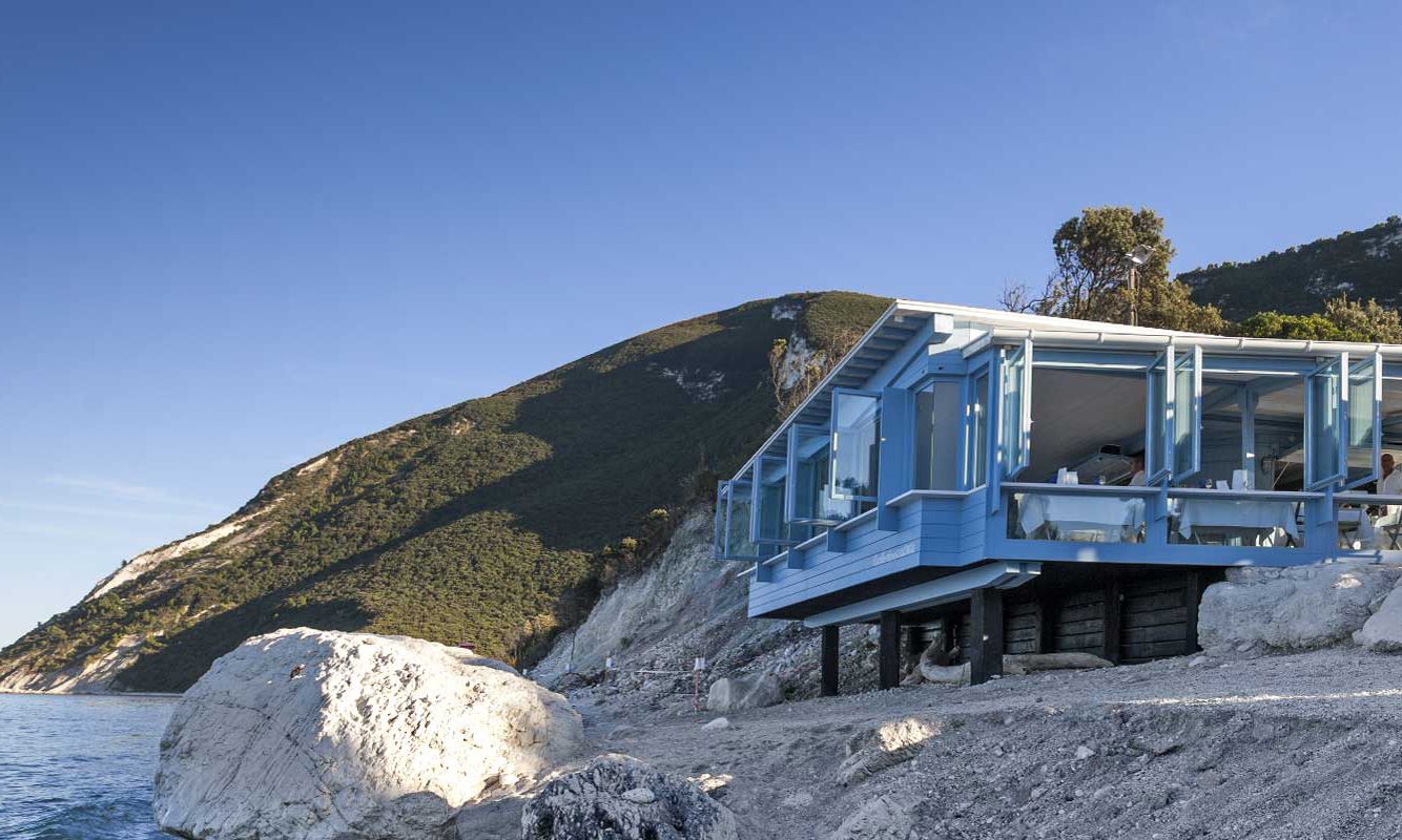 At the foot of Monte Conèro, in the bay of Portonovo, on a pristine beach stands the Clandestino susci bar by Moreno Cedroni, a stilt house inside the bay that bears the colors of the sky and the sea. Founded in 2000 and inspired by the notes of the Manu Chao song of the same name, every year the restaurant offers an always new themed menu. Its most famous dish is a free reinterpretation of sushi, which has become susci. The prices are not prohibitive: an octopus or swordfish salad costs 12€ and for the aperitif there is no shortage of gourmet pizzas.