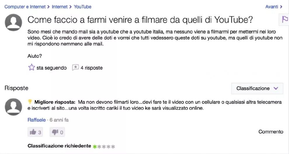 On May 4th Yahoo! Answers will close forever: starting April 20, the site will enter read mode while in early May the switch off will arrive. The official causes of the closure are the obsolescence of the platform and the difficulty of moderation of the content on it, which has become a kind of immense Library of Alexandria of online trash. But it is also true that in its 15 years of history (the service began in 2005 but arrived in Italy in 2006), Yahoo! Answers was one of the first global internet phenomena to which the entire community contributed, as well as one of the cradles of cringe and online trolling. The site became famous around 2010 for the amount of outlandish questions posted anonymously on the most varied topics: from teenagers using it for clarification on uncomfortable topics such as sex or drugs to mothers exposing the most dysfunctional dynamics of their family; from ignorant questions ("Why aren't the stars seen by the telescope five-pointed?") to translations of the Greek and Latin versions.