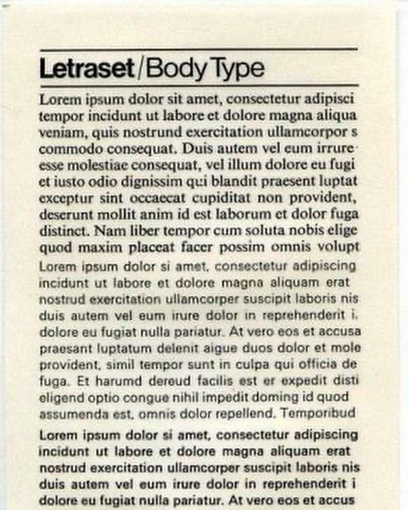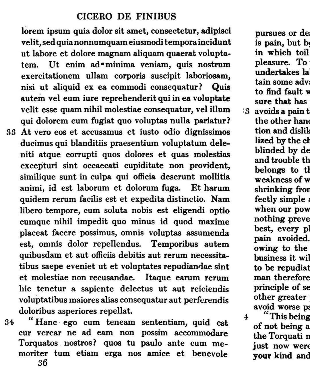 At this point, however, we must understand how we went from the sentence of Cicero to the string of semi-senseless text that today is known as Lorem Ipsum. The solution, however, is more banal than it seems: anyone who originally took the text from the Latin work has probably used the 1914 edition of the Loeb Classical Library, an English series of classical works quite famous in its time, in which, on page 34, the beginning of the sentence breaks so "Neque porro quisquam est quisquam qui do-" and resumes on page 36 from where it left off and therefore with "-lorem ipsum ...". In the gallery above you will find both the example of the mock-up of Latraset of the 60s and page 36 of the edition of Cicero with the cut text. The only mystery, however, remains from where Letraset has recovered the modified and senseless version of the text, which according to McClintock dates back to the '500 but no hard evidence of it has survived.