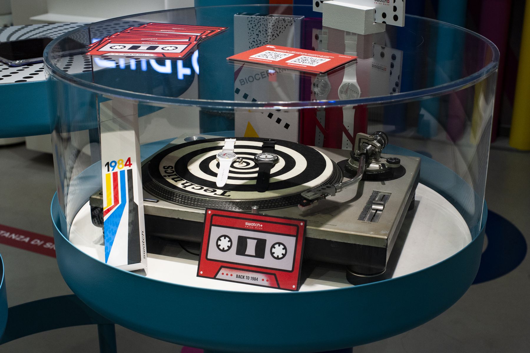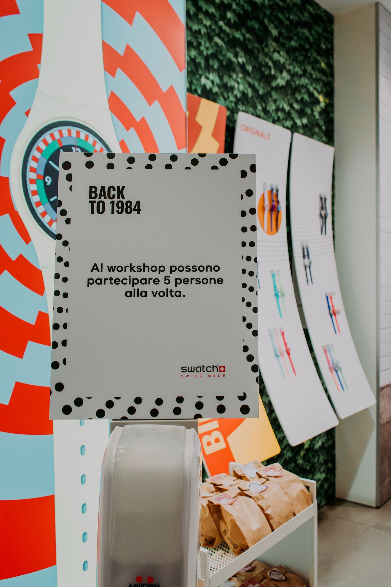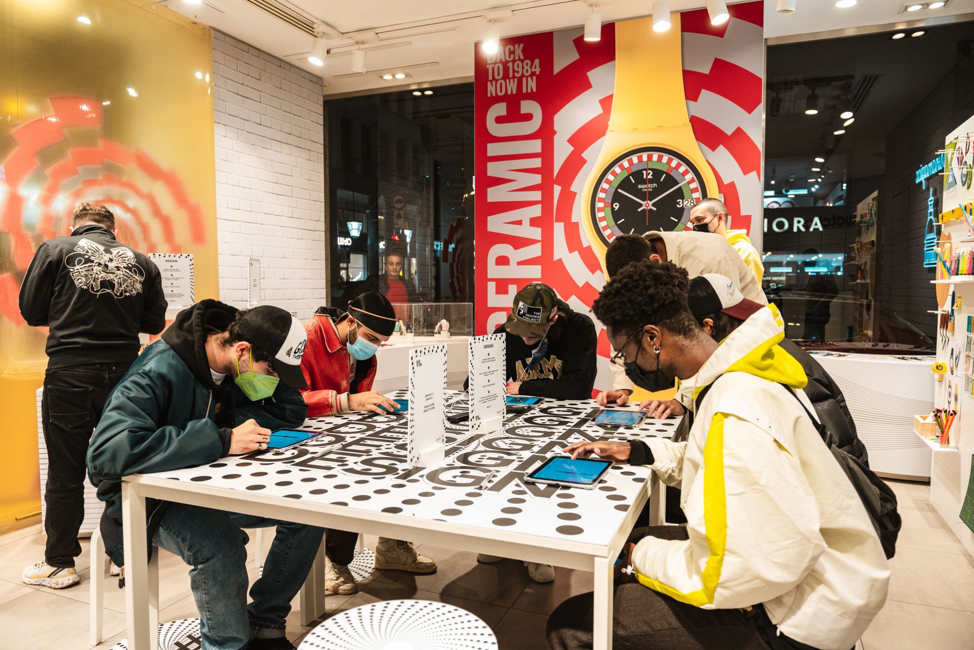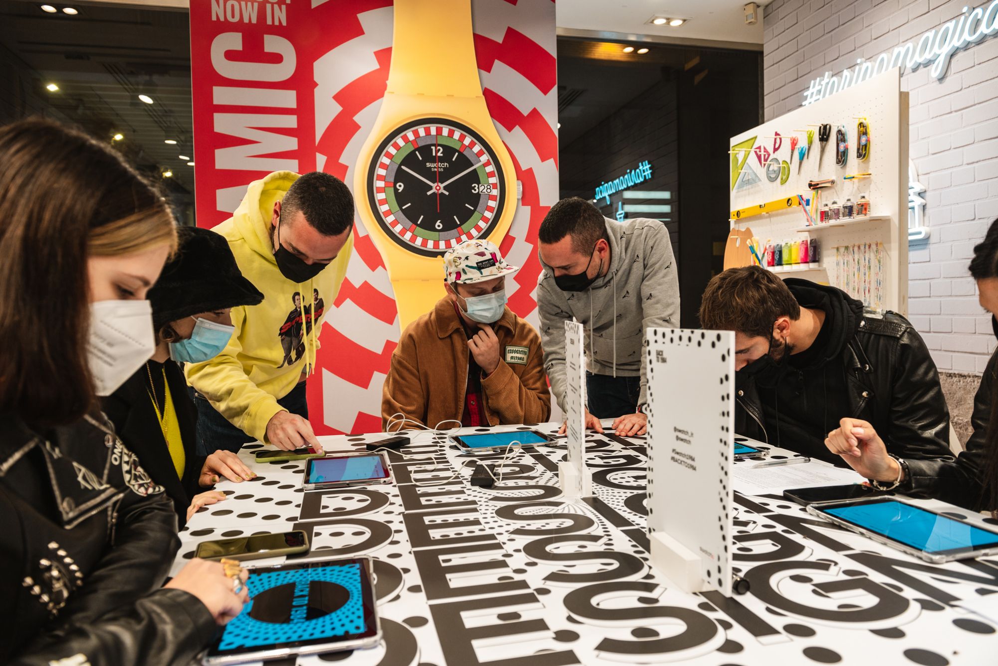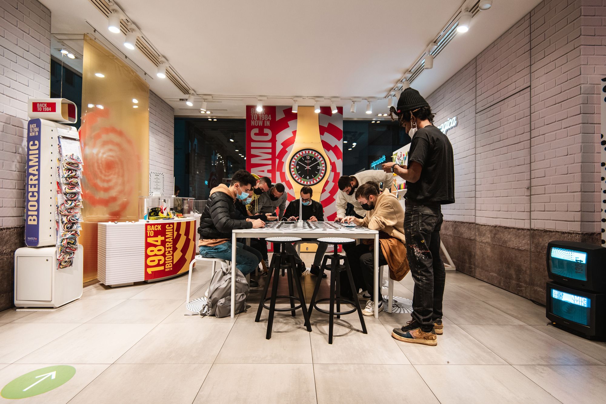 For the launch of its new 1984 Reloaded collection, Swatch organized three unique events around Italy. The Swatch Stores in Rome, Turin and Milan were the locations activated for the three workshops: a couple of creators from each city took on the role of host, giving guests the opportunity to interact with Swatch 1984 watches and relive the atmosphere of the '80s by engaging in a series of themed activities created for the occasion.