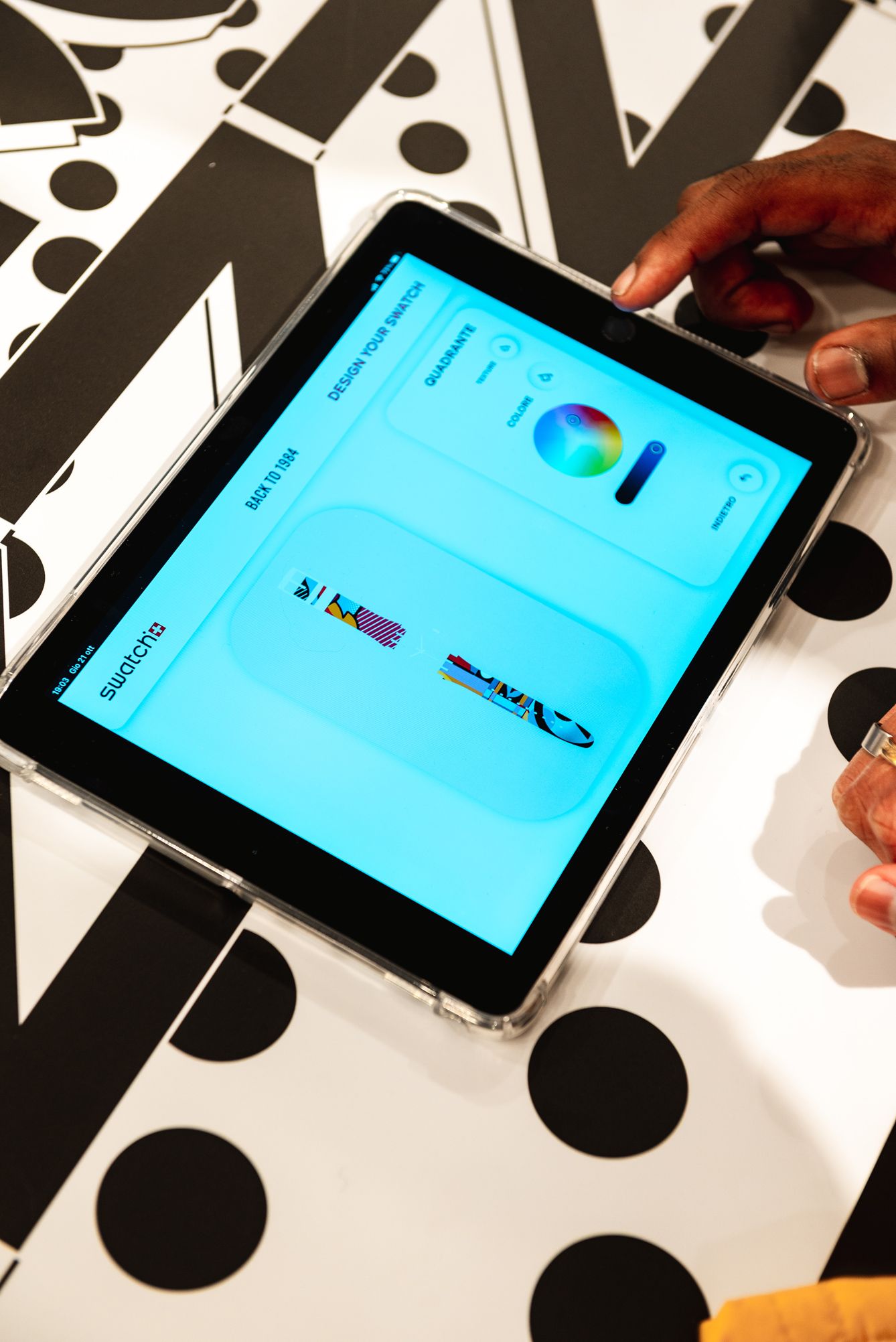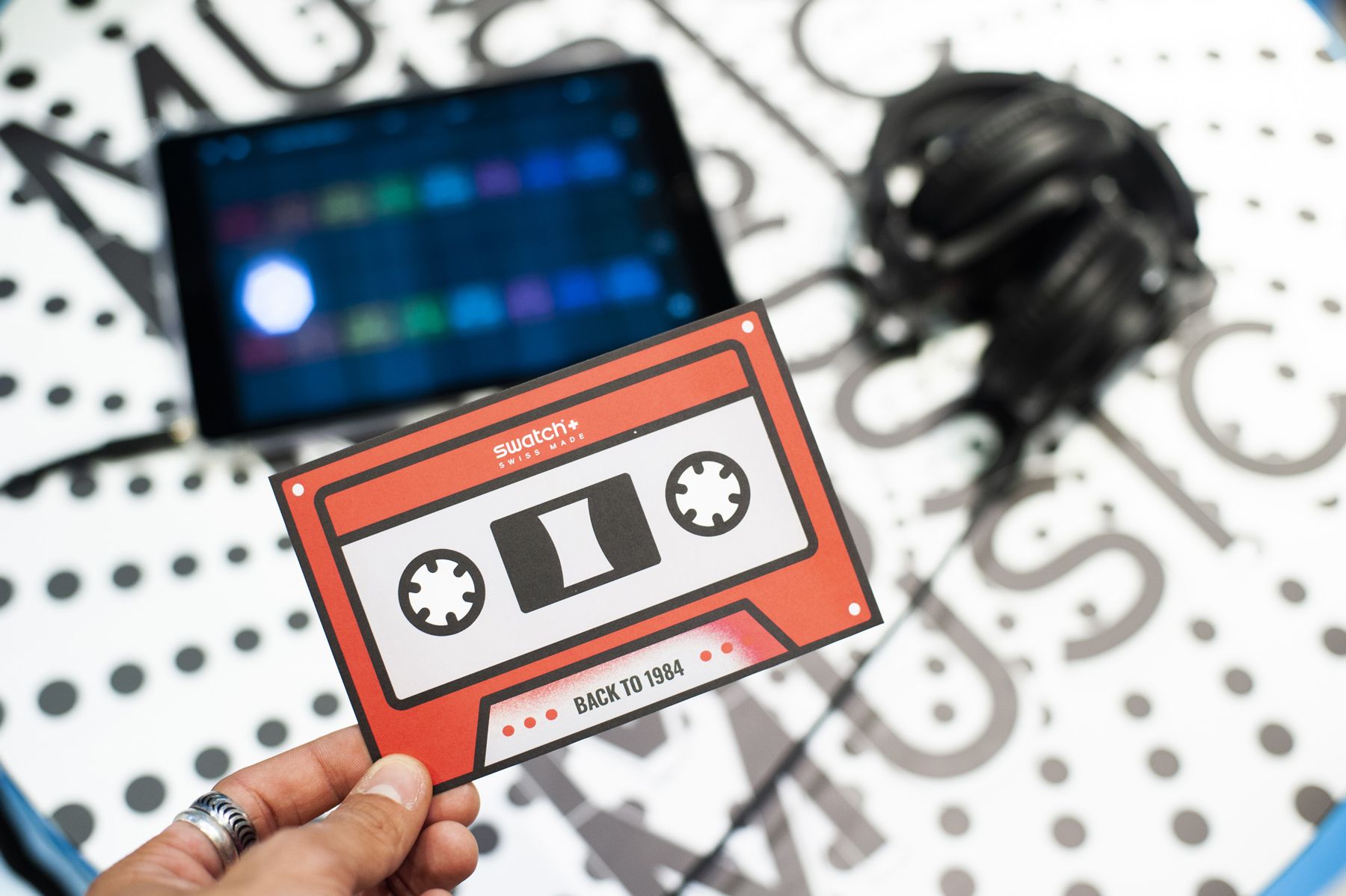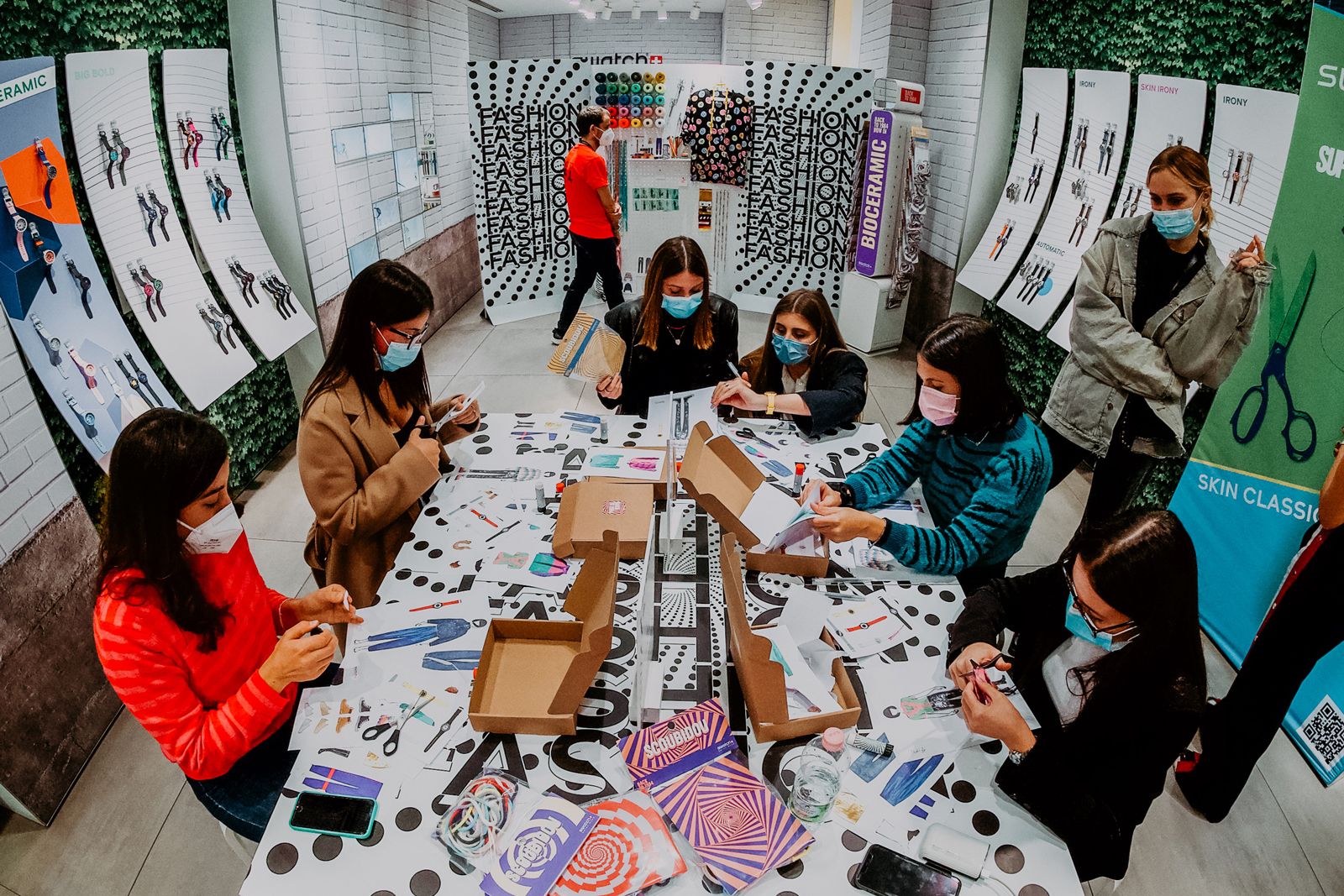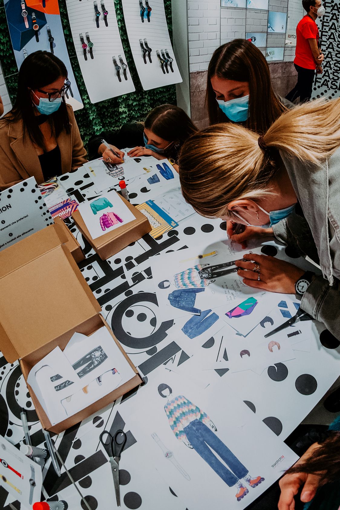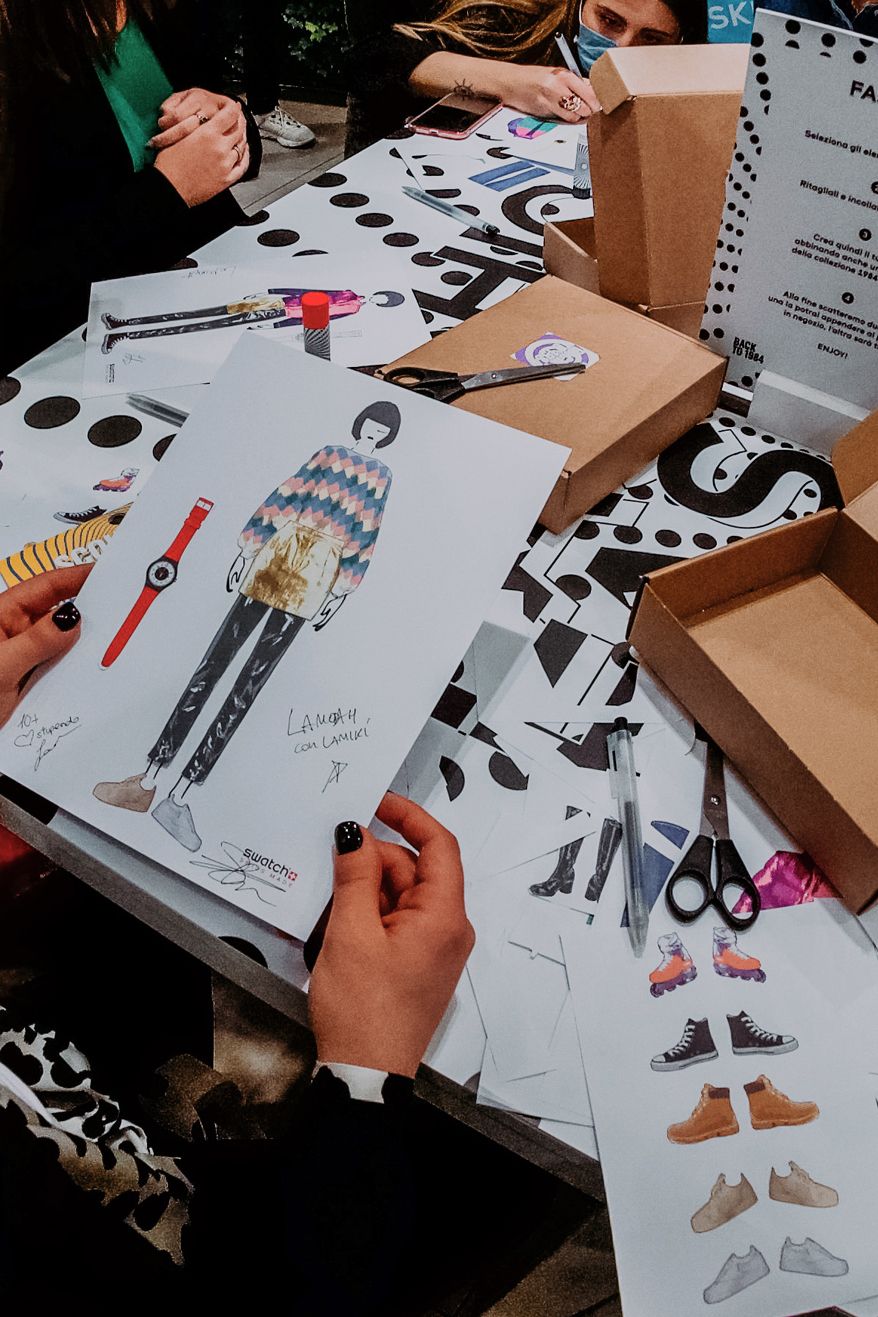 In Rome the theme was Fashion, so the participants together with stylists Michela D'Angelo and Giada Zappa immersed themselves in the 80s, cutting, pasting and creating looks inspired by those years. The visual artists Red and the Van Orton brothers were the protagonists of the Turin event dedicated to Design, guiding the guests in the use of an exclusive tablet app to customize the silhouette of the Swatch watch with colors and patterns designed ad hoc. In the last event in Milan, the guests had the opportunity to mix a series of 80s-themed music loops made especially for the occasion by Crookers and Sgamo during the Music workshop.