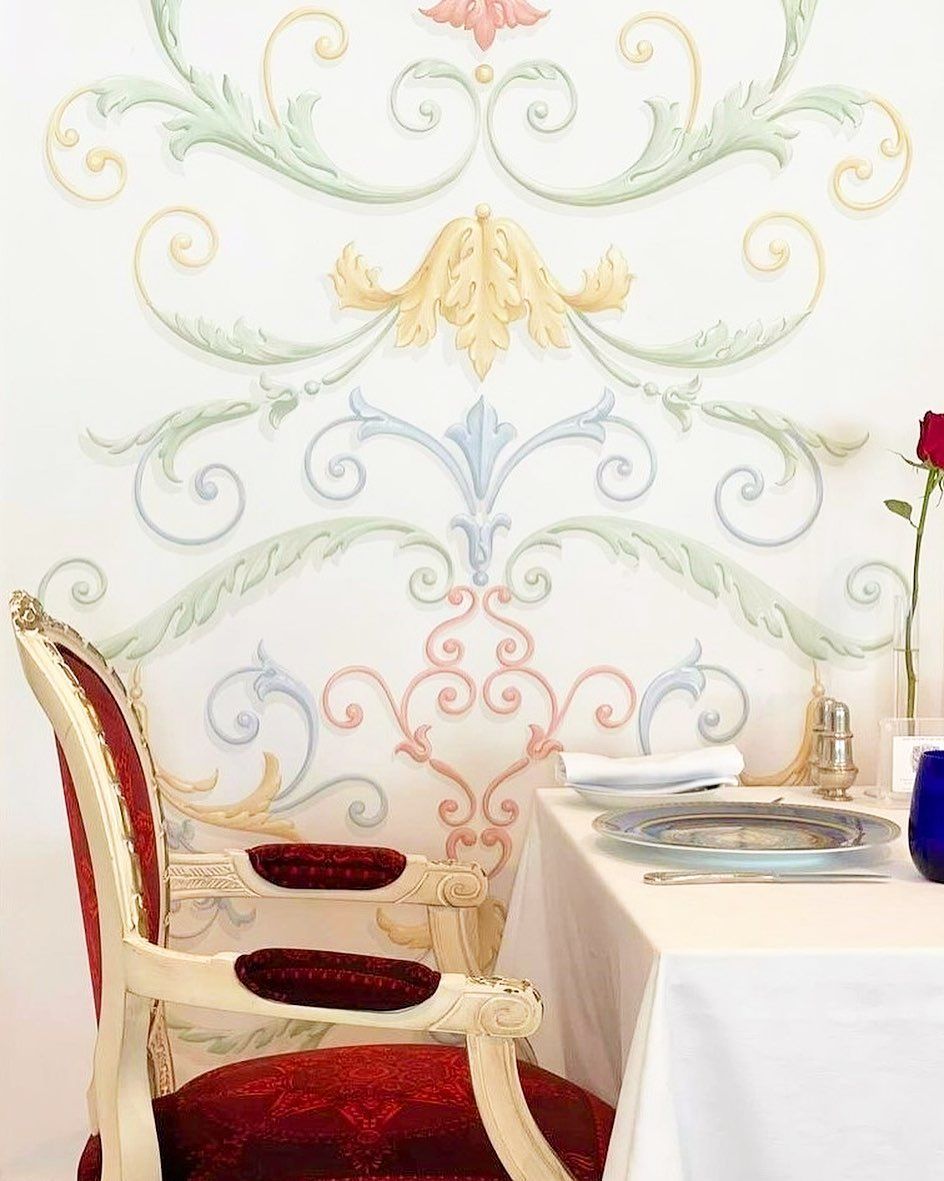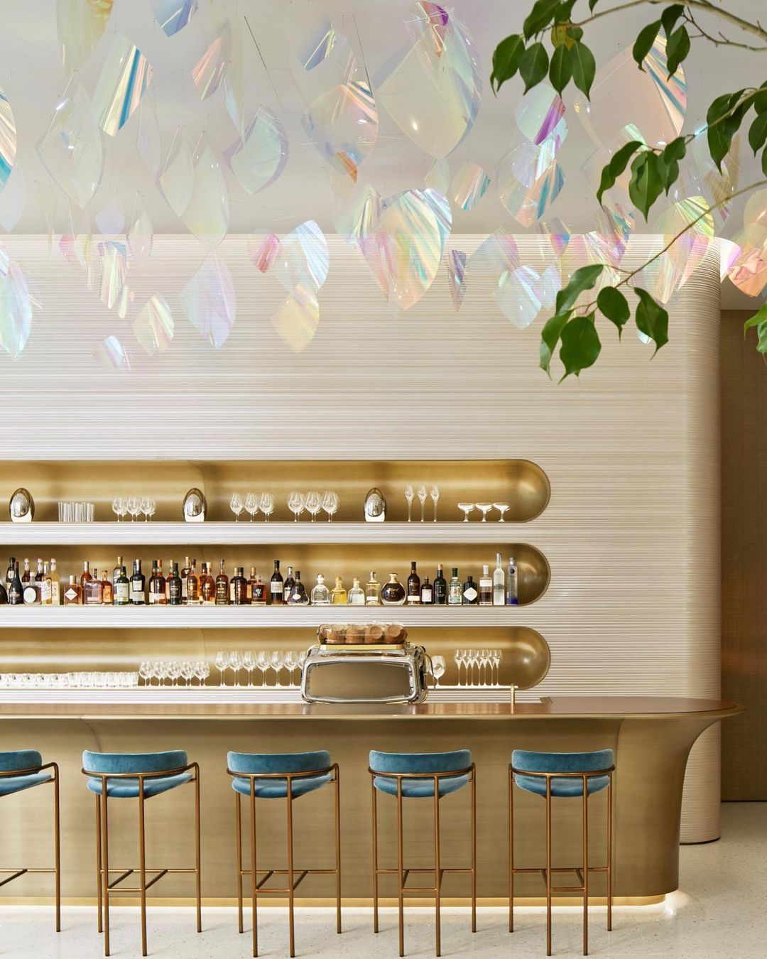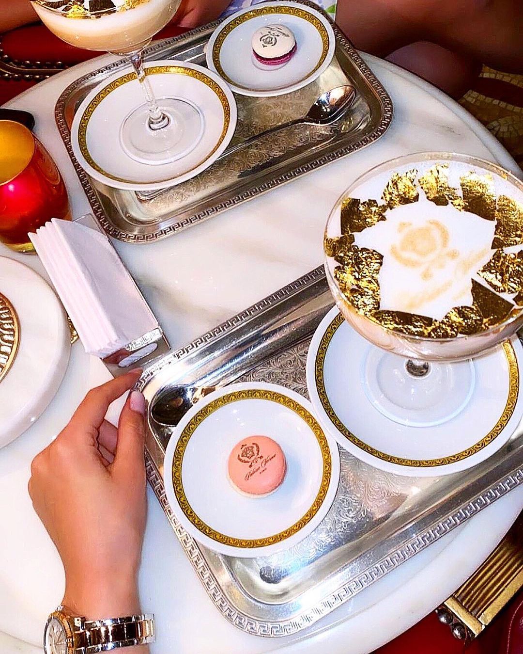 An obvious but often underrated design consideration is the actual food served at the brands restaurant. From what courses are offered to how they are prepared, to the cocktails, wine, and even coffee selection, every culinary detail counts. Brands decide what tastes like luxury according to their unique and discerning clients. At Versace, excess, ornate hardware, porcelain and the brand’s addiction to gold extends beyond the Versace designed serveware, glassware, and flatware, like in Dubai at the Versace hotel where you can get a 24k gold flecked cappuccino, finished with a cocoa-sprinkled medusa, flanked by macarons dyed in the brands signature colors of course.