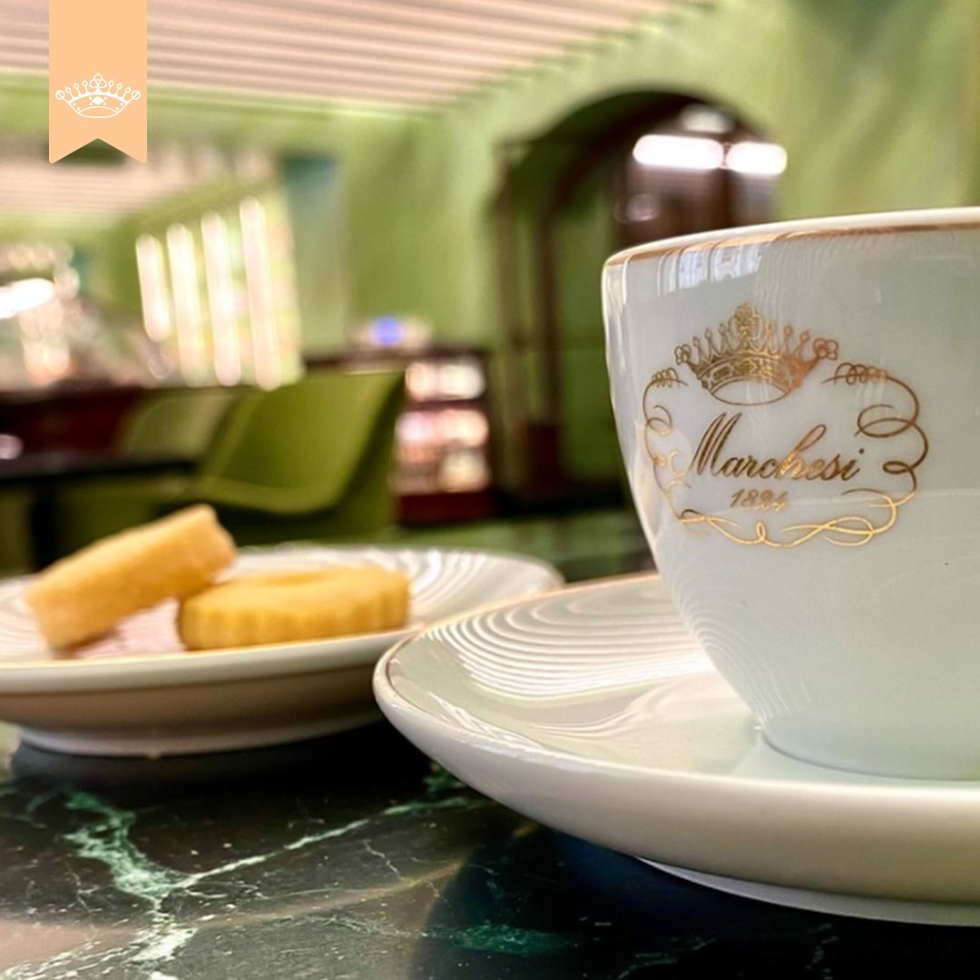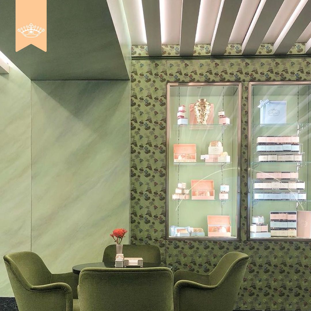 The pastry shop Pasticceria Marchesi was founded by Gualitiero Marchesi, then purchased by the brand and while the recipes are Marchesi’s, the mood is unmistakably Prada. Bright candy colors and civilized small plates and sandwiches in cases and jars seem to pop out against the brand’s signature green shade that coats the two shops in Milan, from wall to ceiling. Classic sophistication expresses itself around wrapped sandwiches, with tiered plates of small bites, and of course coffee, offered with an extensive list of options for a civilized Milanese coffee.