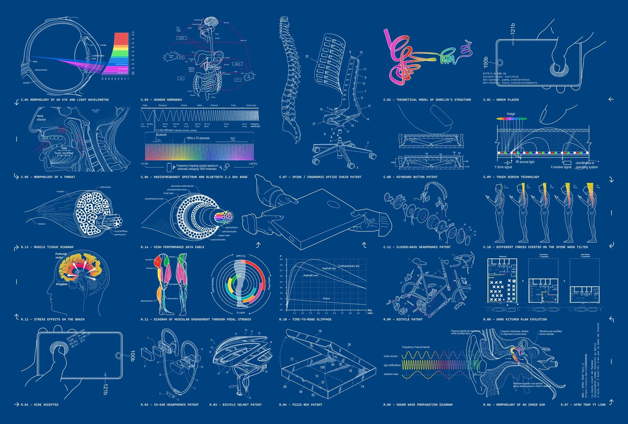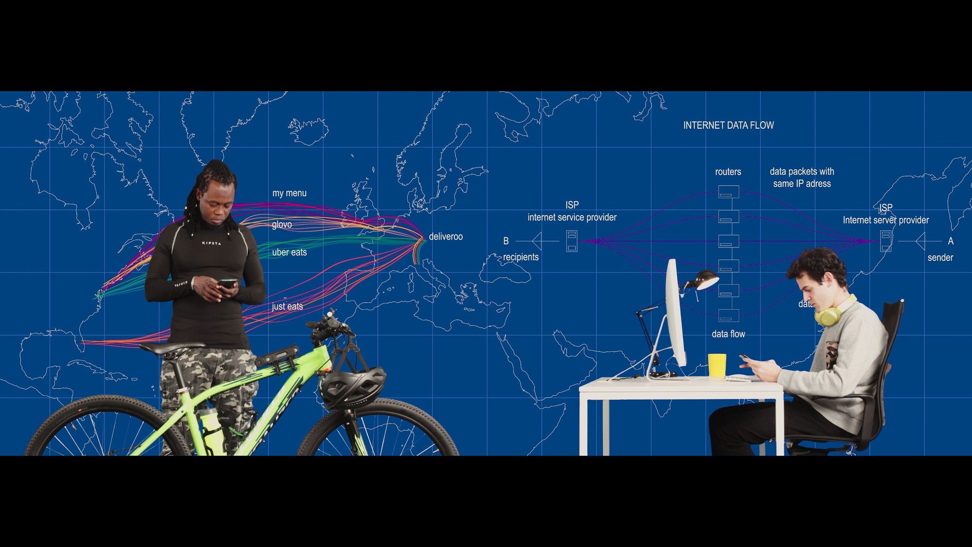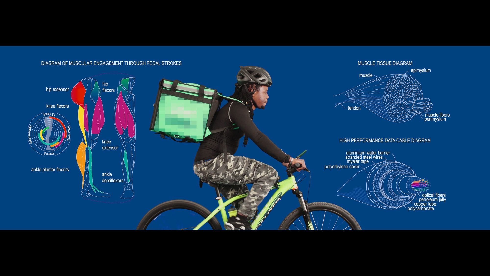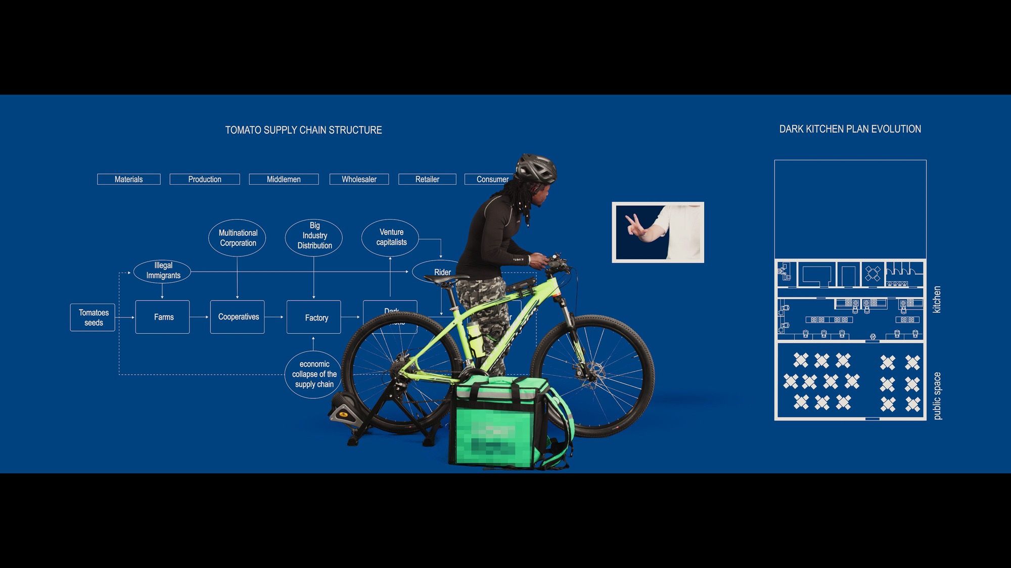 The simple tap on the screen of your smartphone, the notification of the order withdrawn by the rider and finally the delivery. A process that is now familiar to those who live in cities and that the pandemic has institutionalized but which hides a series of data movements, algorithms and human beings that are slowly changing many aspects - aesthetic and cultural - of contemporary society. The short "Riders not Heroes: Anatomy of a Delivery" - by the interdisciplinary study 2050+ in collaboration with -orama - dissects the multiple realities that collide throughout the duration of a food delivery: a complex system where bodily, chemical, and synthetic regimes are entangled in a short time frame, collapsing the acts of ordering and delivering. Two apparently frictionless gestures mark the extremes of a hidden anatomy, mirrored in the social separation and yet shared condition between customers and riders. Both are precarious, exhausted bodies. Both are cogs in the greater delivery industry.