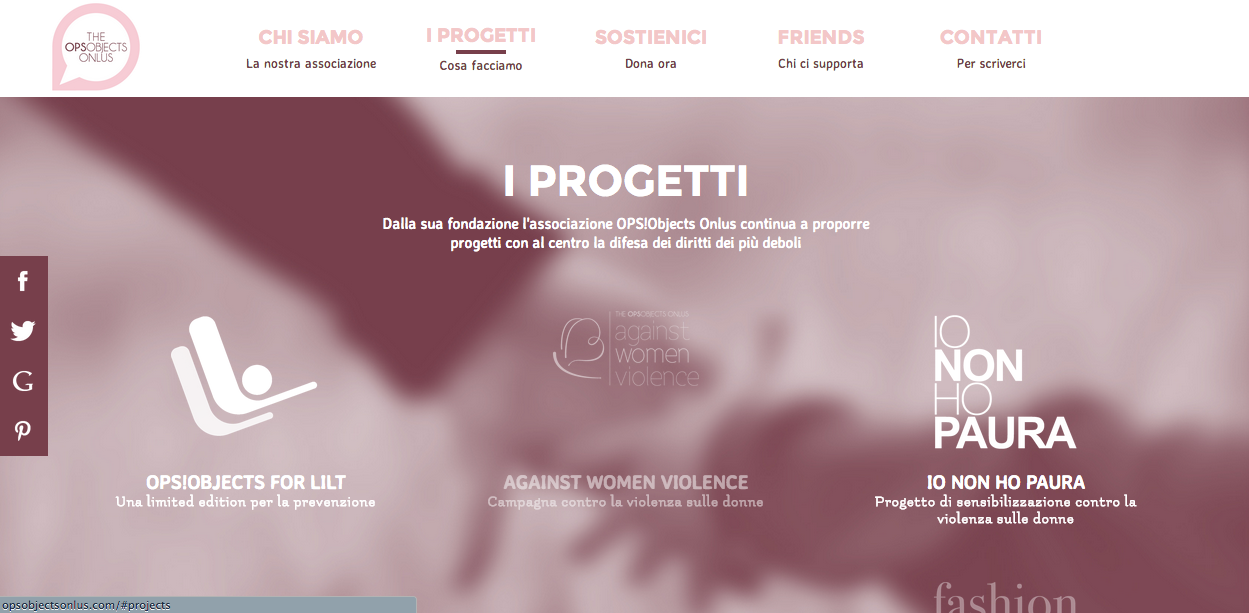 OPSOBJECTS, modern brand of accessories and always sensitive to social responsibilities towards the environment in which it operates , is launching OPSOBJECTS Onlus - a non-profit organization , in fact, that has as its objective the creation of projects to raise public awareness , to support and assist those less fortunate and to prevent atrocities through social education . The goal is undoubtedly inform so as to have a greater consciousness and awareness of their gestures and their actions to each individual, not forgetting that sometimes happiness is hidden just behind a smile and a thank you received said with eyes. That is why the first awareness campaign is aimed at combating violence against women. In fact, on the occasion of the International Day against Violence against Women, 25 November next , presenting the campaign - I'm not Scared - where the primary goal is to make conscious participant and each of us a serious matter , through the emotional Spot 30 ' and the documentary that tells the story of three women who have suffered violence.