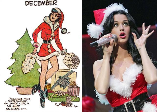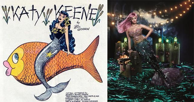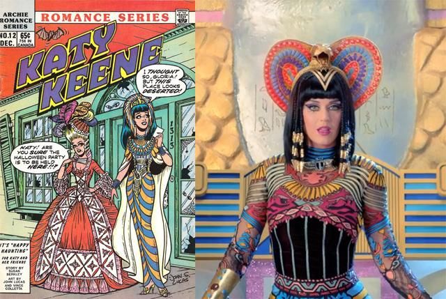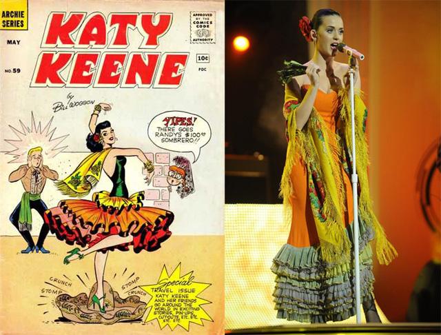 Katy Keene is a comic book character created by Bill Woggon and published since 1945 by Archie Comics. Katy is a model, actress and singer known as the "Queen of Pin-Up and Fashion." You may wonder why you're talking about this comic, well there is a reason. I do not find any similarity with pop star Katy Perry? The outfits reminiscent clearly the various outfits that Perry has worn in his career. Do not dwell on it too much and there are some images below.