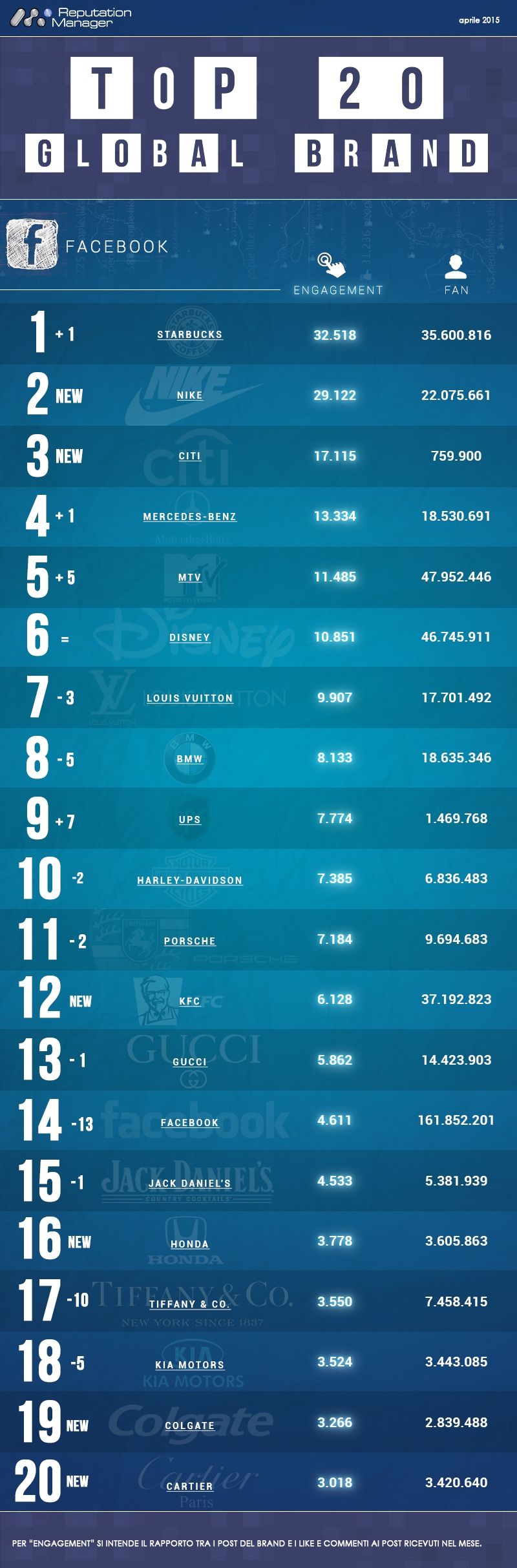 As for Facebook, there are five new entries in the top 20: Nike in second place, KFC in twelfth, Honda in sixteenth, Colgate in the nineteenth and Cartier twentieth.