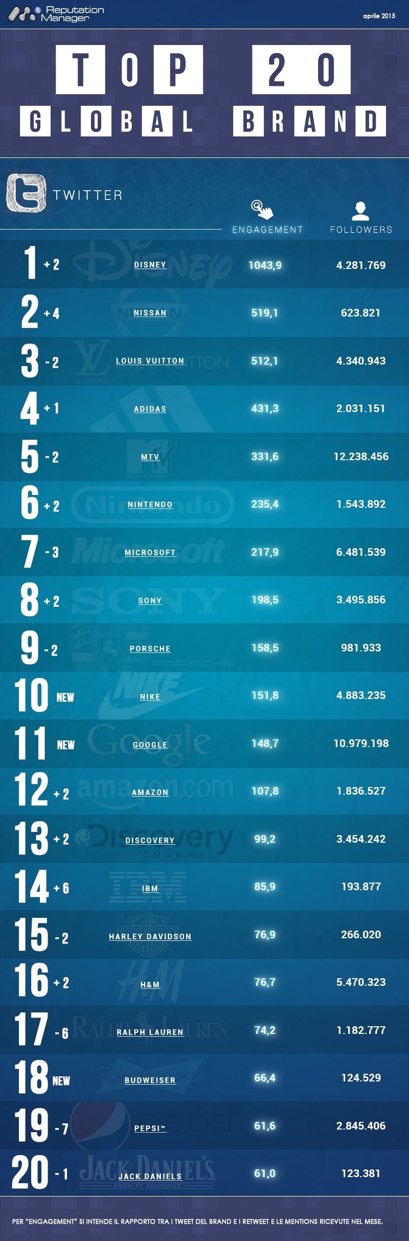 Reputation Manager, the first Italian institute of analysis and measurement of online reputation of companies and prominent public figures, monitored the official account of Twitter and Facebook of 100 global brands in the Interbrand ranking...