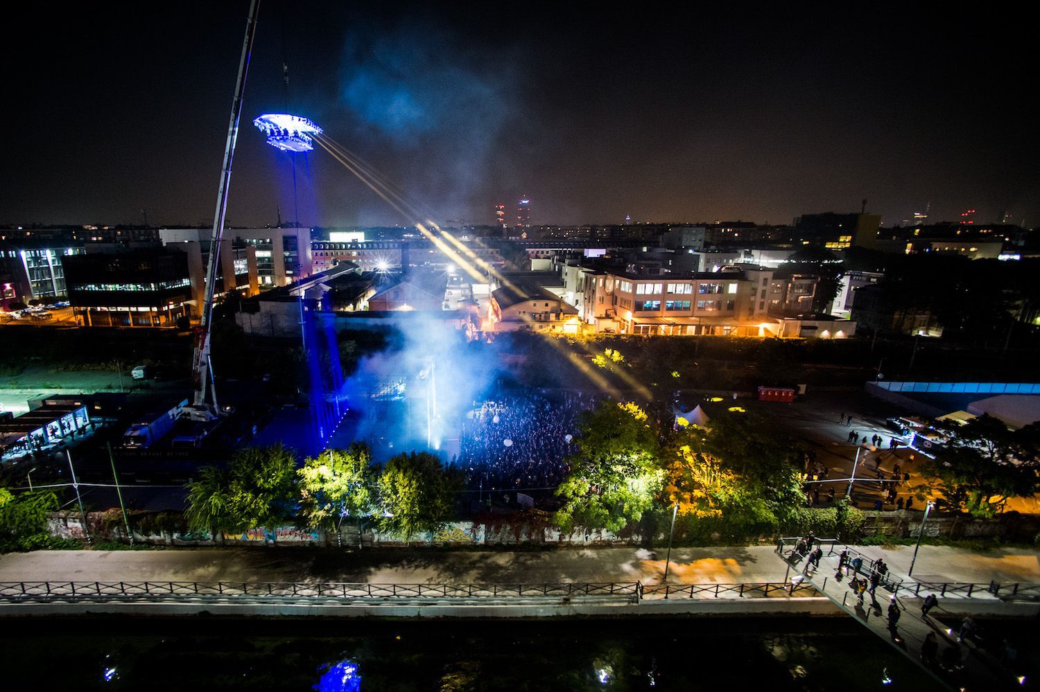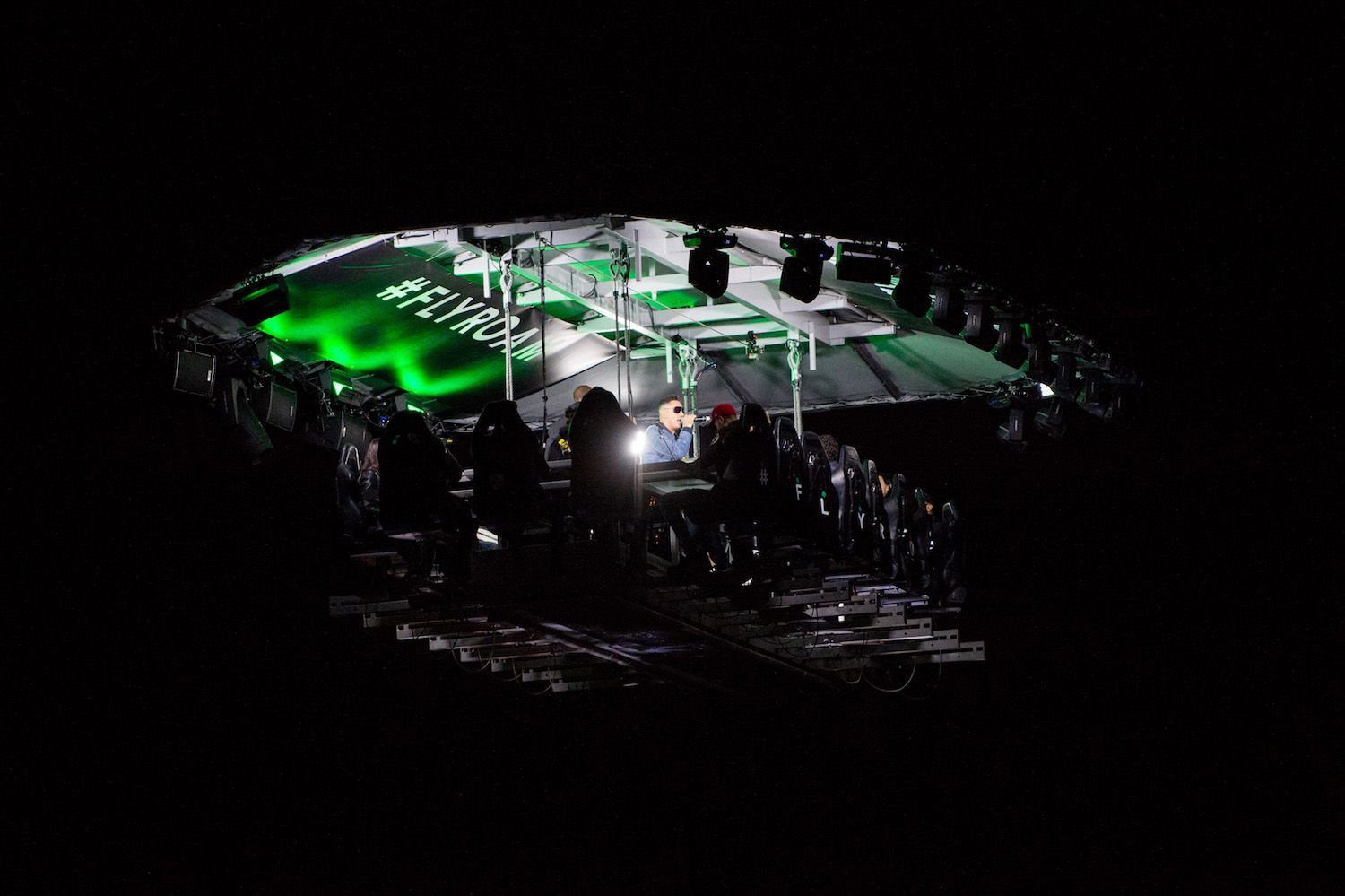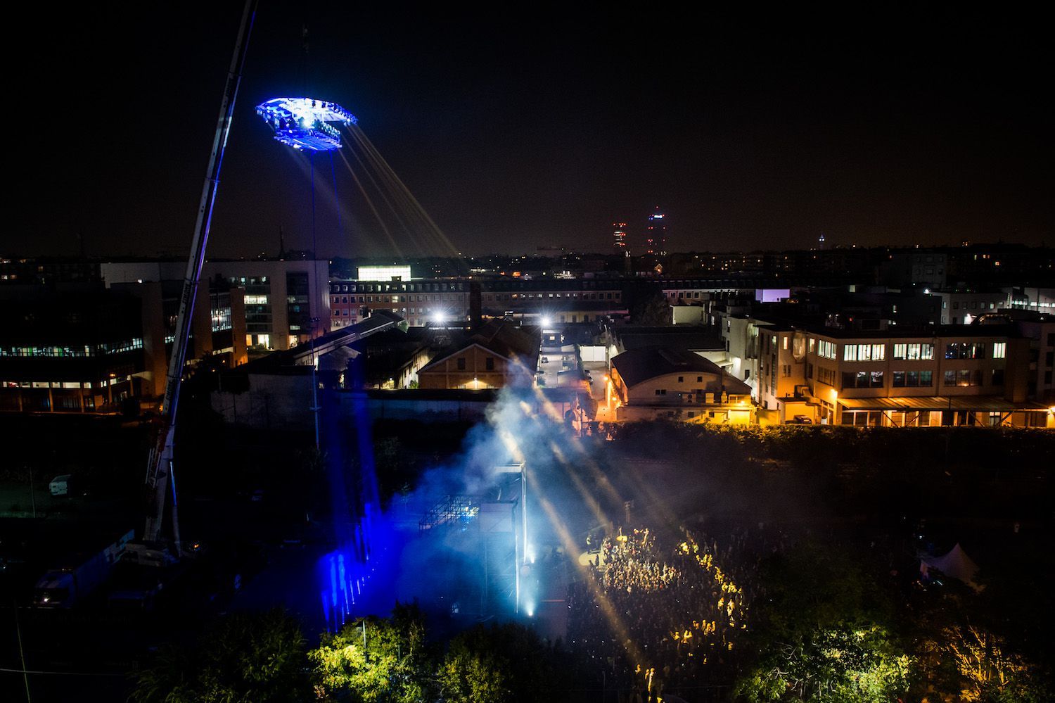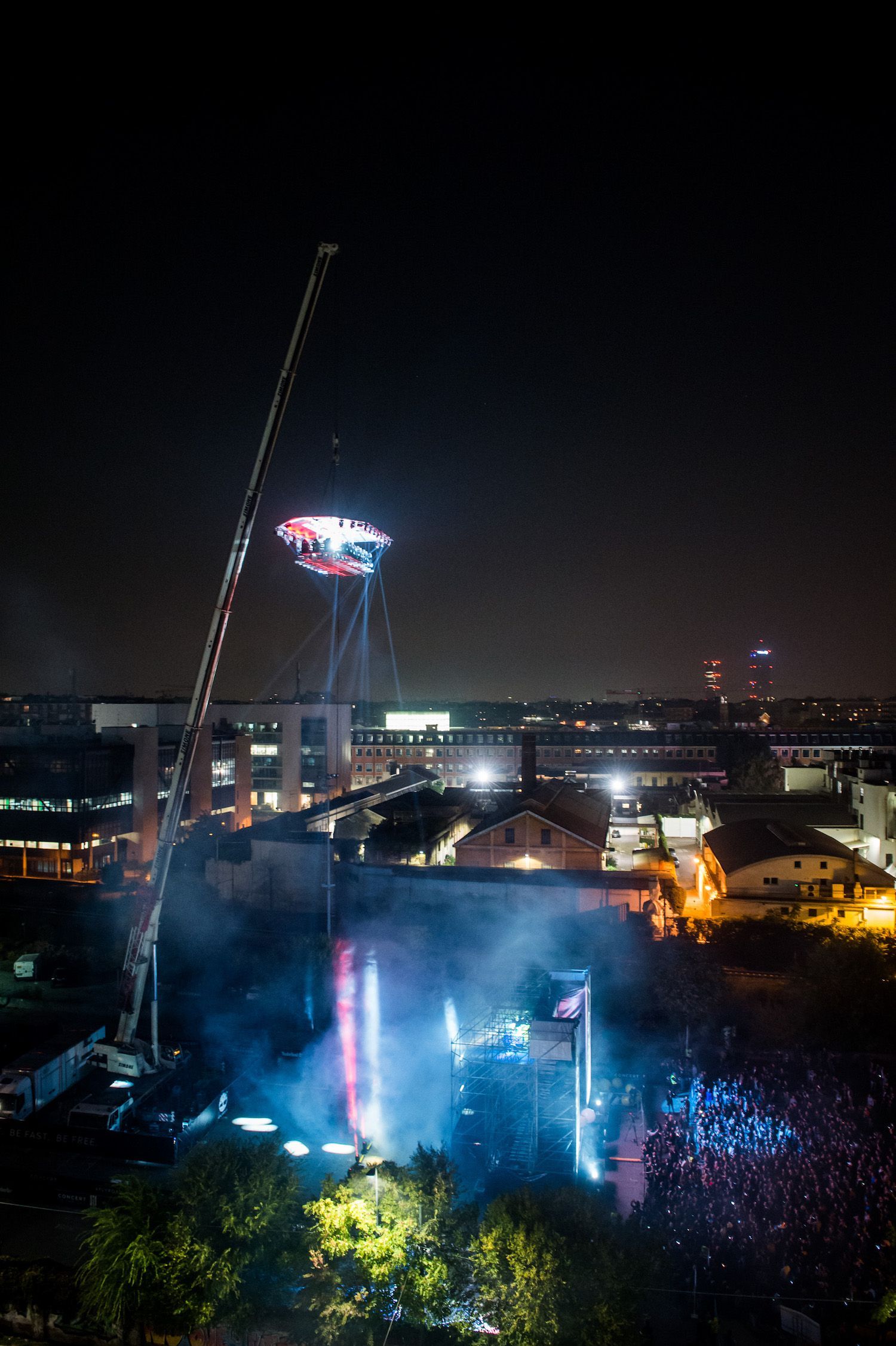 Among guest stars, producer Shablo, rap stars Sfera Ebbasta, Cizco, radio speaker Andrea Rock and many others sitting on a platform suspended in void while under them over 2000 people have enjoyed the breathtaking and engaging show by the King of Rap that challenged the height, moving smoothly inside the flying platform.