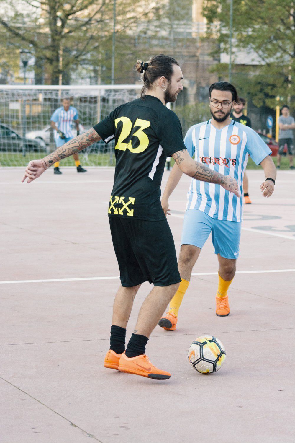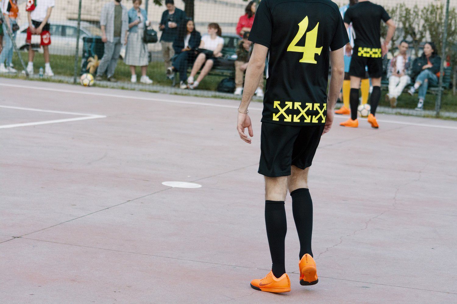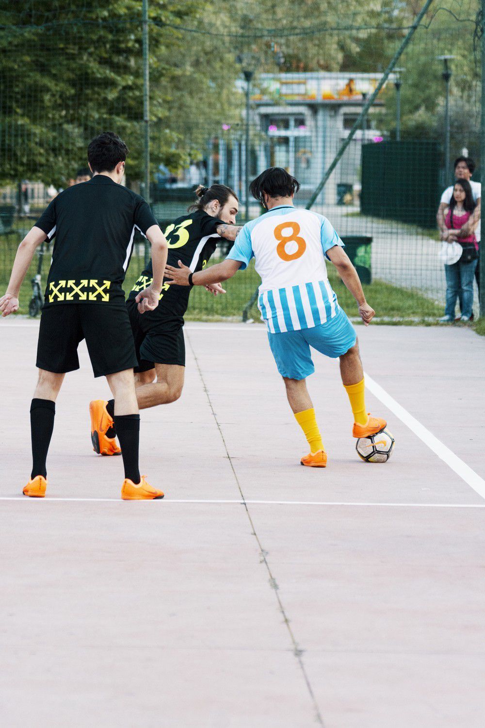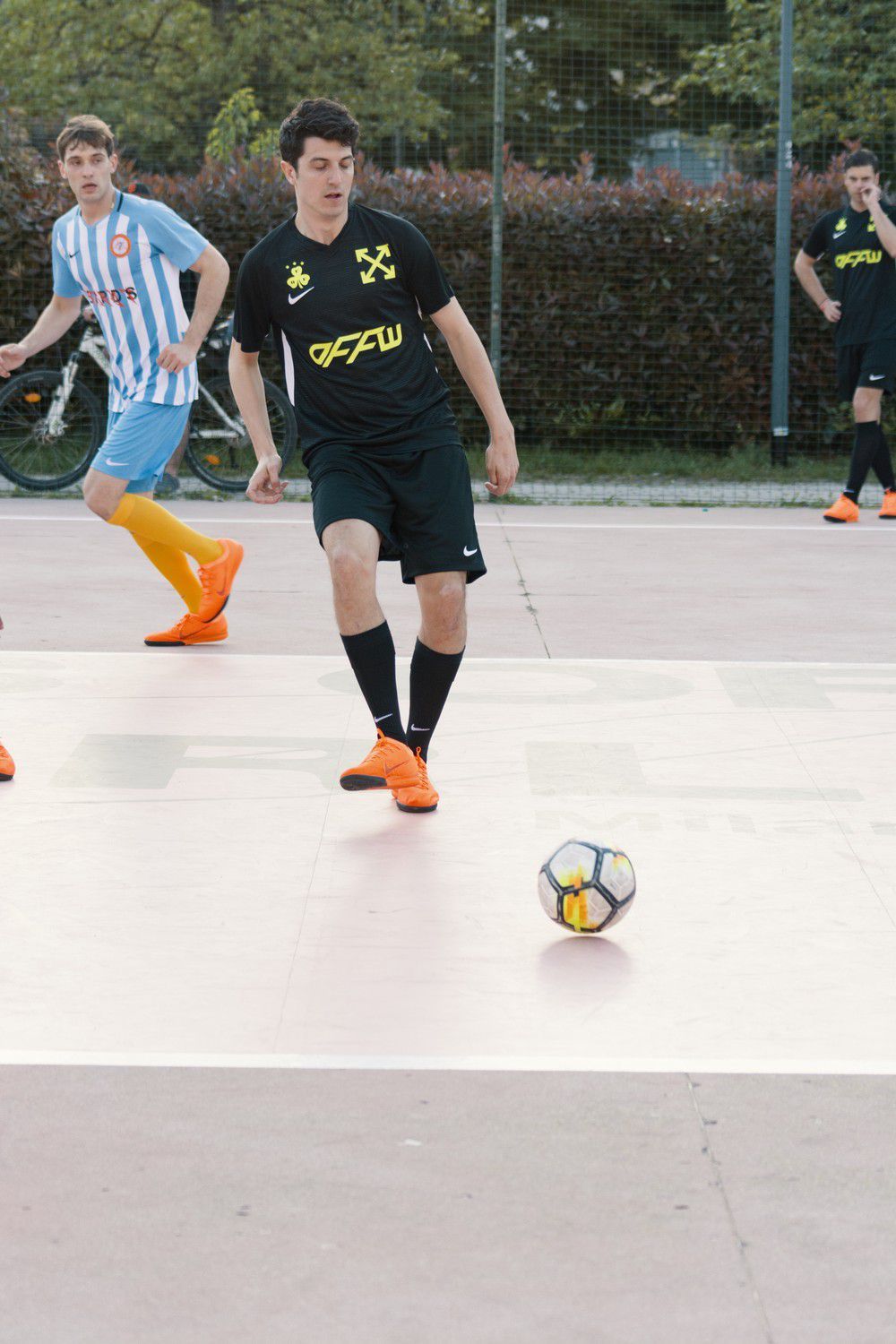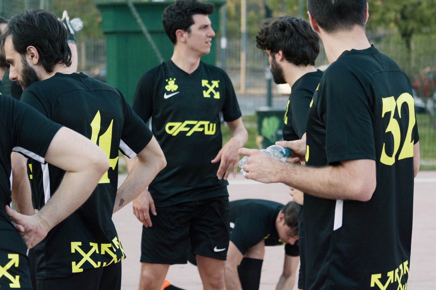 Both teams took to the field with a custom jersey made during the workshops organized by Nike at Spazio Maiocchi: blue and white for the Heron Preston team, Nike with fluo details for OFF-WHITE. The match was very tough, it ended 8 to 7 for the team of the brand founded by Virgil Abloh.