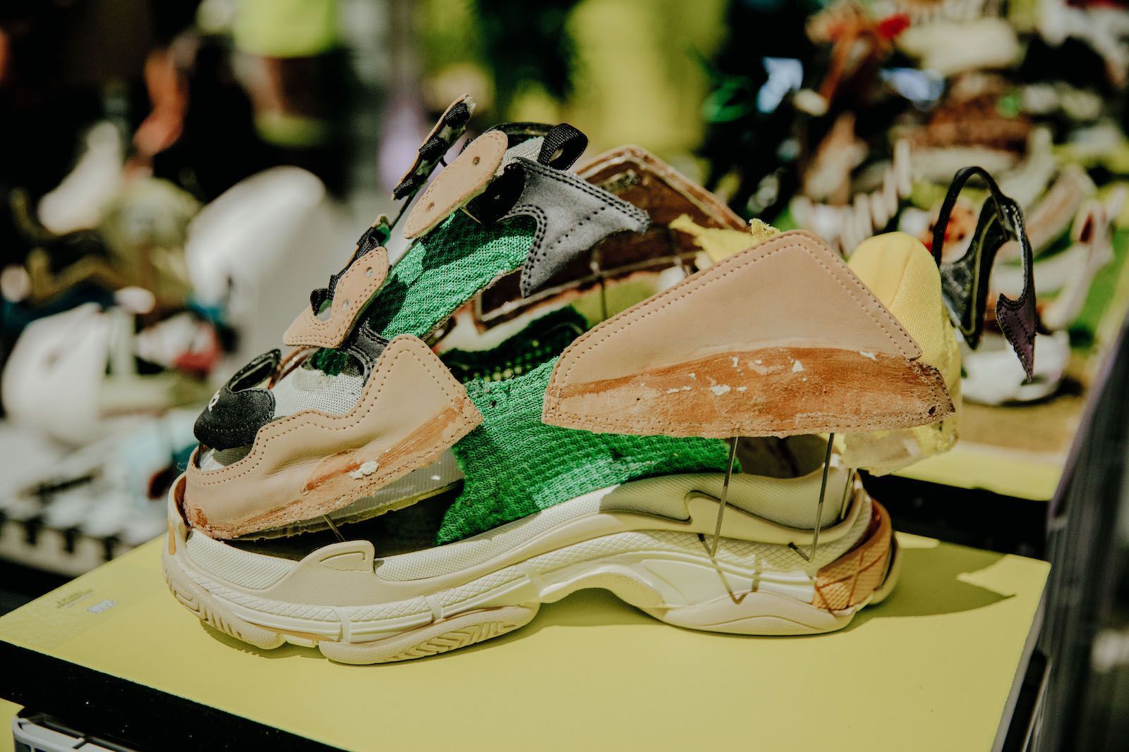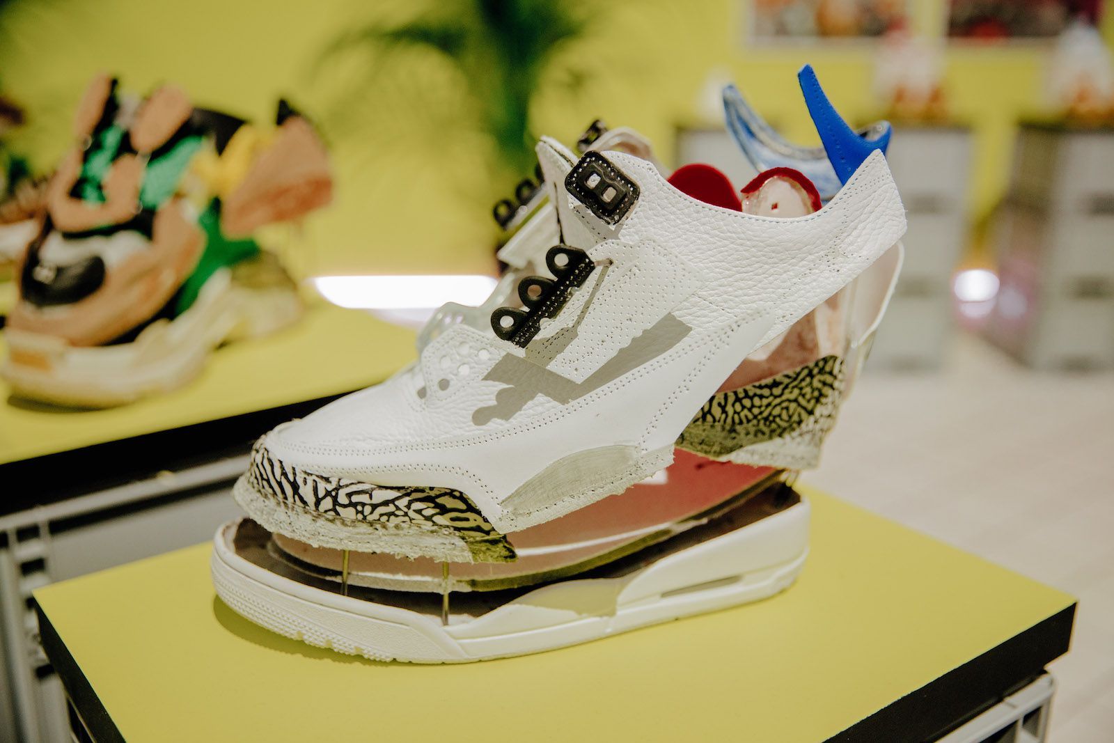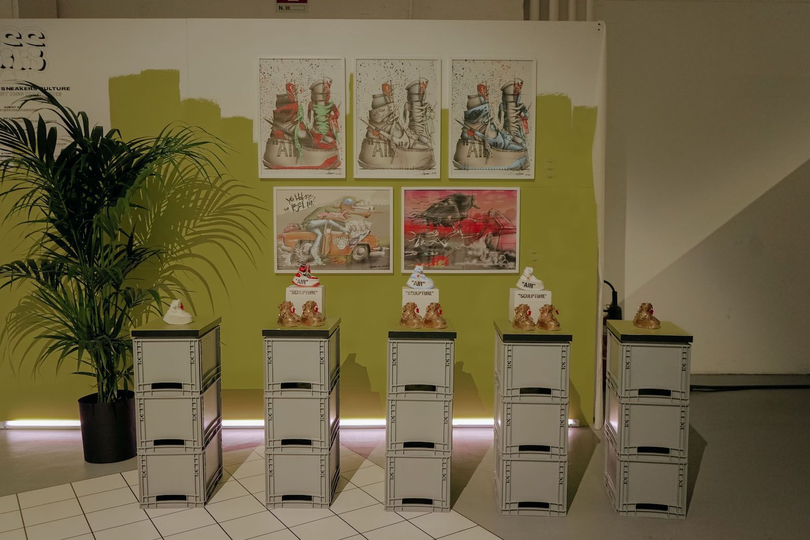 Over the weekend the second edition of White Street Market took place in Milan gathering the many aspects of street culture under one roof. A key element thereof has always been sneakers and for this edition nss set up a specially designated nss kicks corner to showcase some talented artists within the field and also provide visitors with the chance to participate in a workshop led by DCJ Snkrs. The artists included Agent 33 from France who showcased five hybrid models he designed by disassembling and then sticking different sneakers parts. The result is a Frankenstein sneaker made of different models. The second artist was Rudy Lim who came from Korea to show off his incredible deconstructed sneakers, his creations anatomize sneakers, he unsticks them, reveals their different layers and materials and, as if they were stuffed bugs, he separates the different parts into display cases resulting in a 'natural museum' effect. Working with some of the most hyped silhouettes, among them Sean Wotherspoon’s, Balenciaga's and Air Jordan’s. The final artist was none other than the internet sensation Stomper Haus who’s been blowing up on Instagram with his sneaker caricature illustrations. Pushing his aesthetic forward Stomper Haus has now started making sculptures of his designs to give a 3D manifestation of his work. The nss kicks area blossomed into a creative hub during the 3 days where visitors, artists, and heads all gathered in their love for sneaker culture.