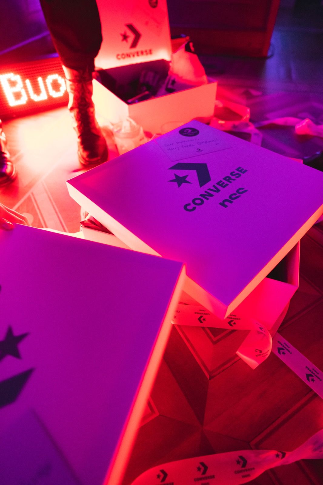 The arrival of the dessert marked the most awaited moment of every Christmas dinner, the gift giving monent. In each box the guests found a Converse Pro Leather high in a white and navy colorway, nss tie-dye socks and a ball for the Christmas tree as a souvenir of the evening.