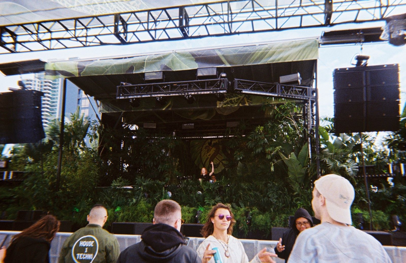 The Palms stage, artfully shrouded in palms and shrubbery, is one of three music stages and served as a perfect ocular sensory while the performing DJ’s played varied House music laden sets that kept the crowd dancing through a Saturday full of scattered sun-showers and a Sunday full of sun. Miane spun an amazing set, giving the festival attendees who were just beginning to enter an immediate immersion into that festival feel. Maxinne set The Palms aflame with a set as fiery as her intensely hued, perfectly styled bob. Clearly considerate of details, she wore an Off-White c/o Virgil Abloh t-shirt with shrubbery surrounding the intersecting arrow logo to match the set design. Dan Shake, with a fleecy look and funky sound, amped the crowd up with a soulful and fun selection of mixes. After his set we danced with the crowd for a bit and chatted about how Americans love to wear t-shirts with random slogans on them like FUCK, or random unironic quotes from celebrities. (I definitely used to own a What If We Fucked At This Vogue Party? shirt from Ye’s The Life of Pablo era). ABSOLUTE, with an impeccably dyed neon green hairstyle, spun an electrifying DJ set. Full of energy himself, he and the crowd were both bouncing around as the sound carried us into the sunset.