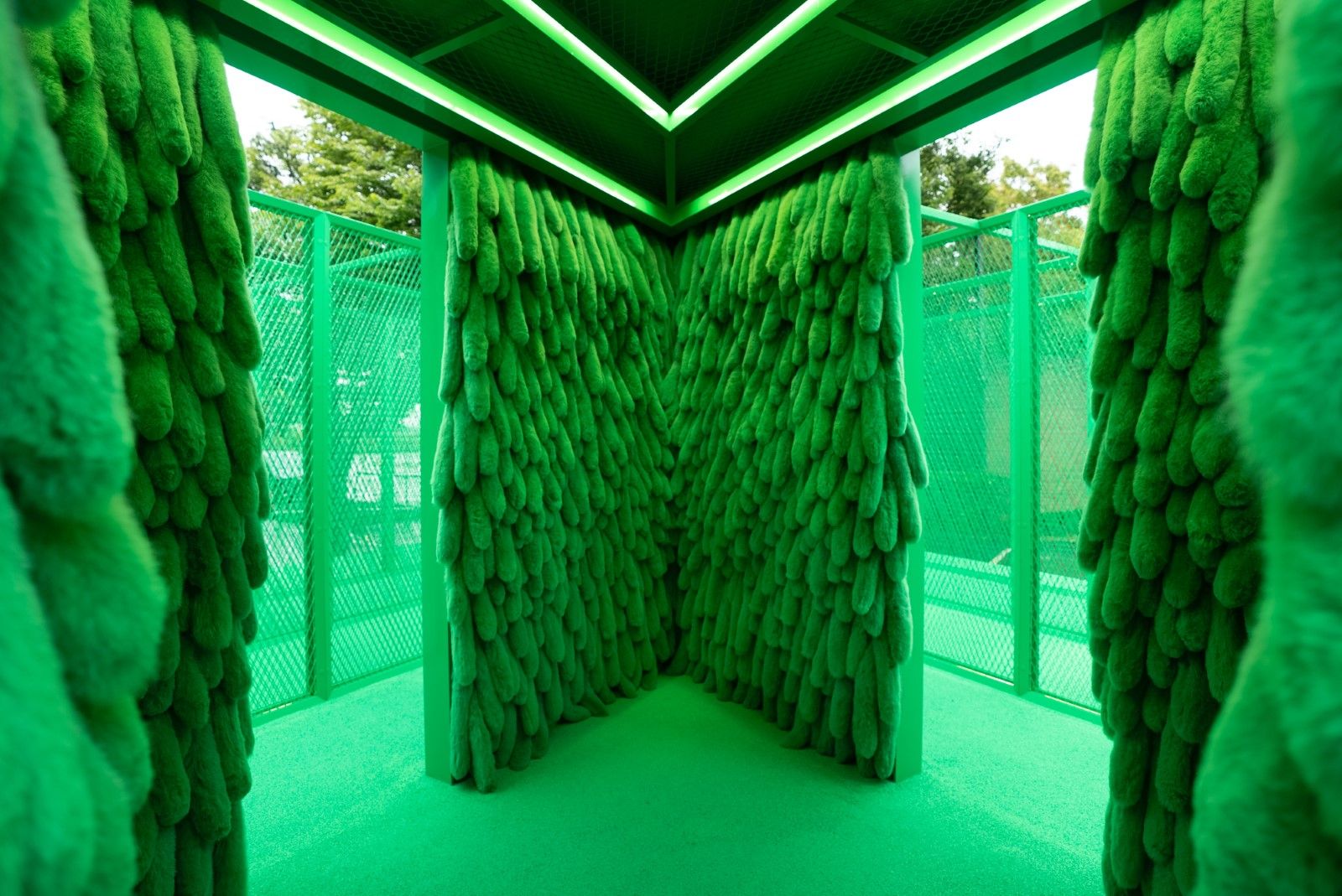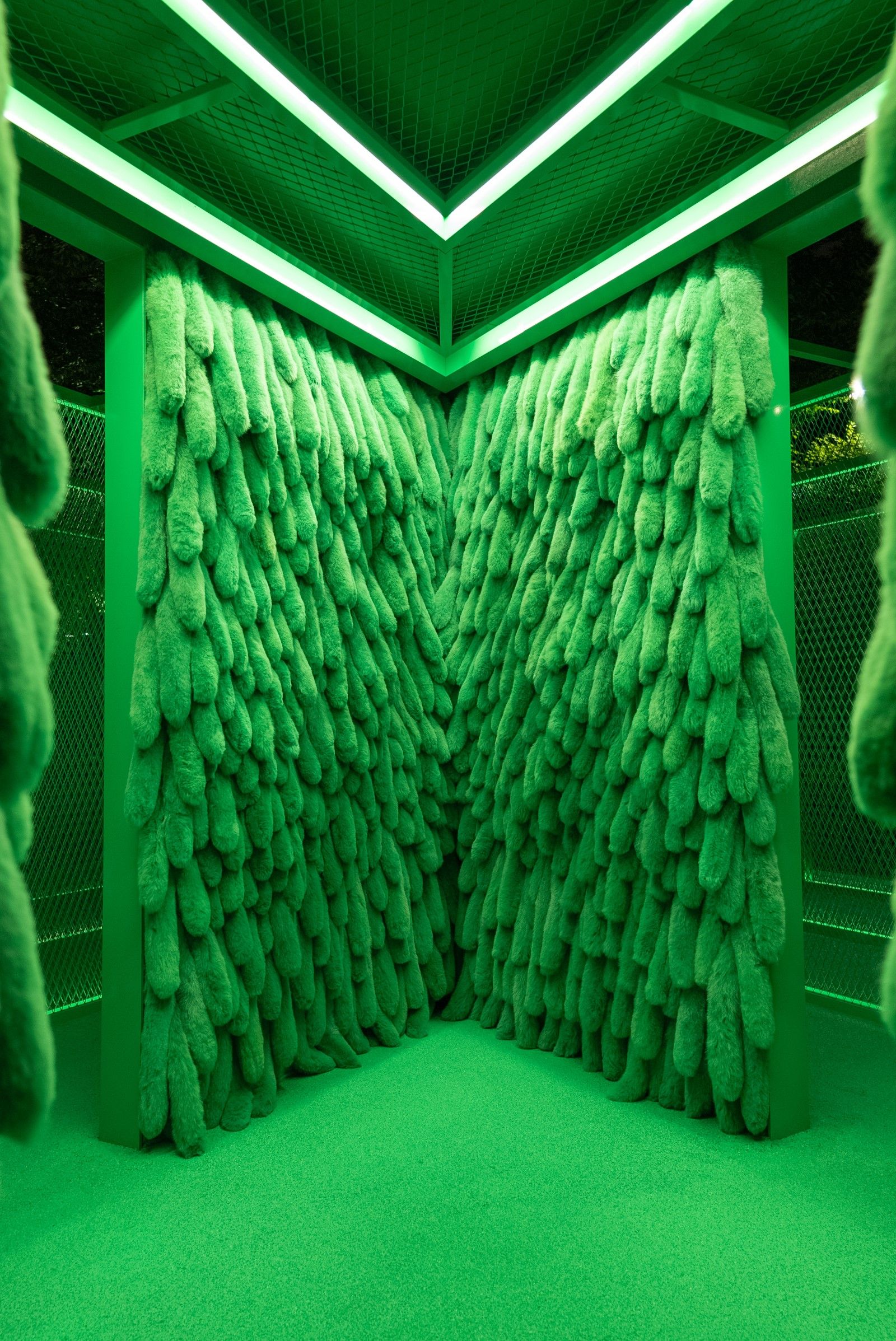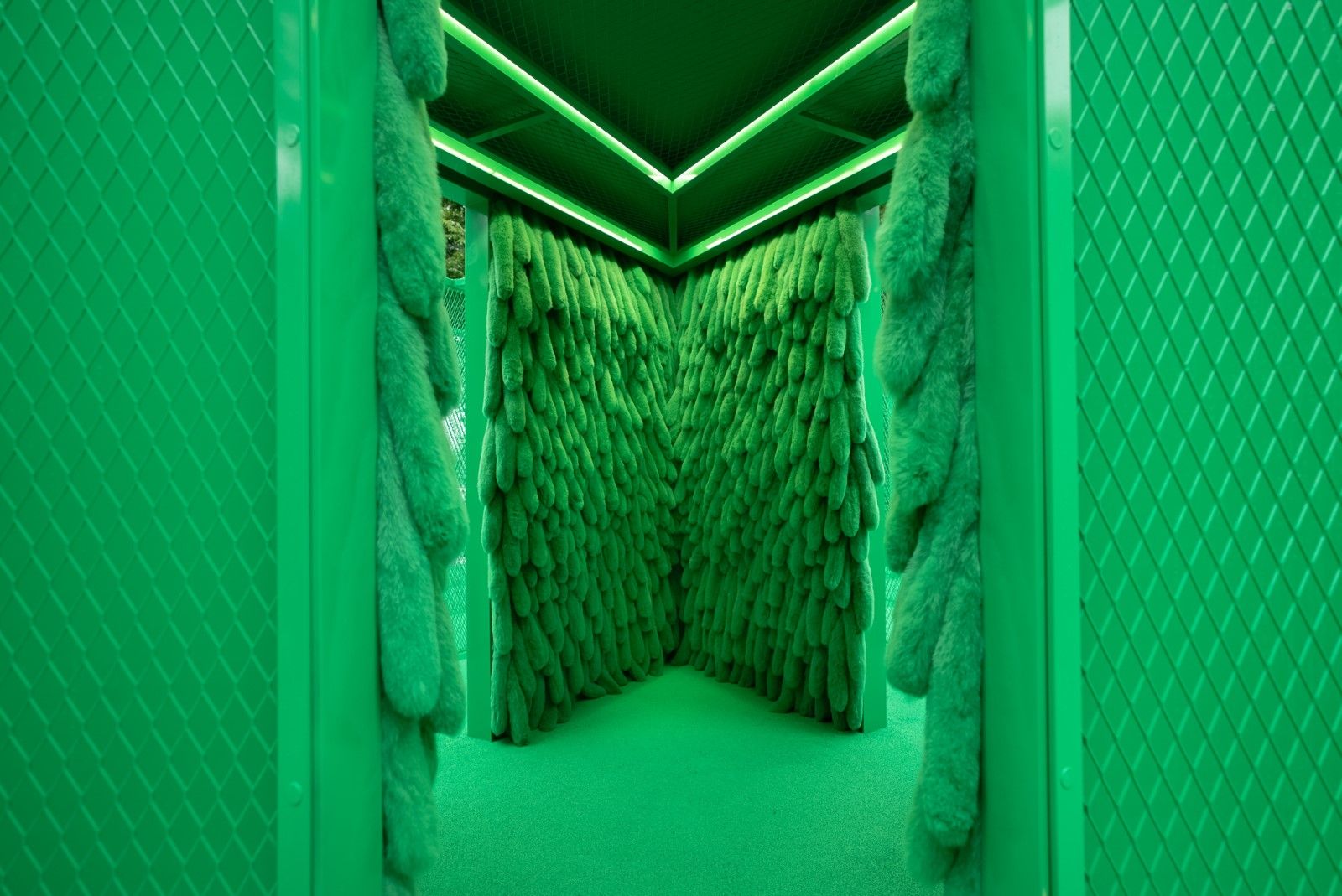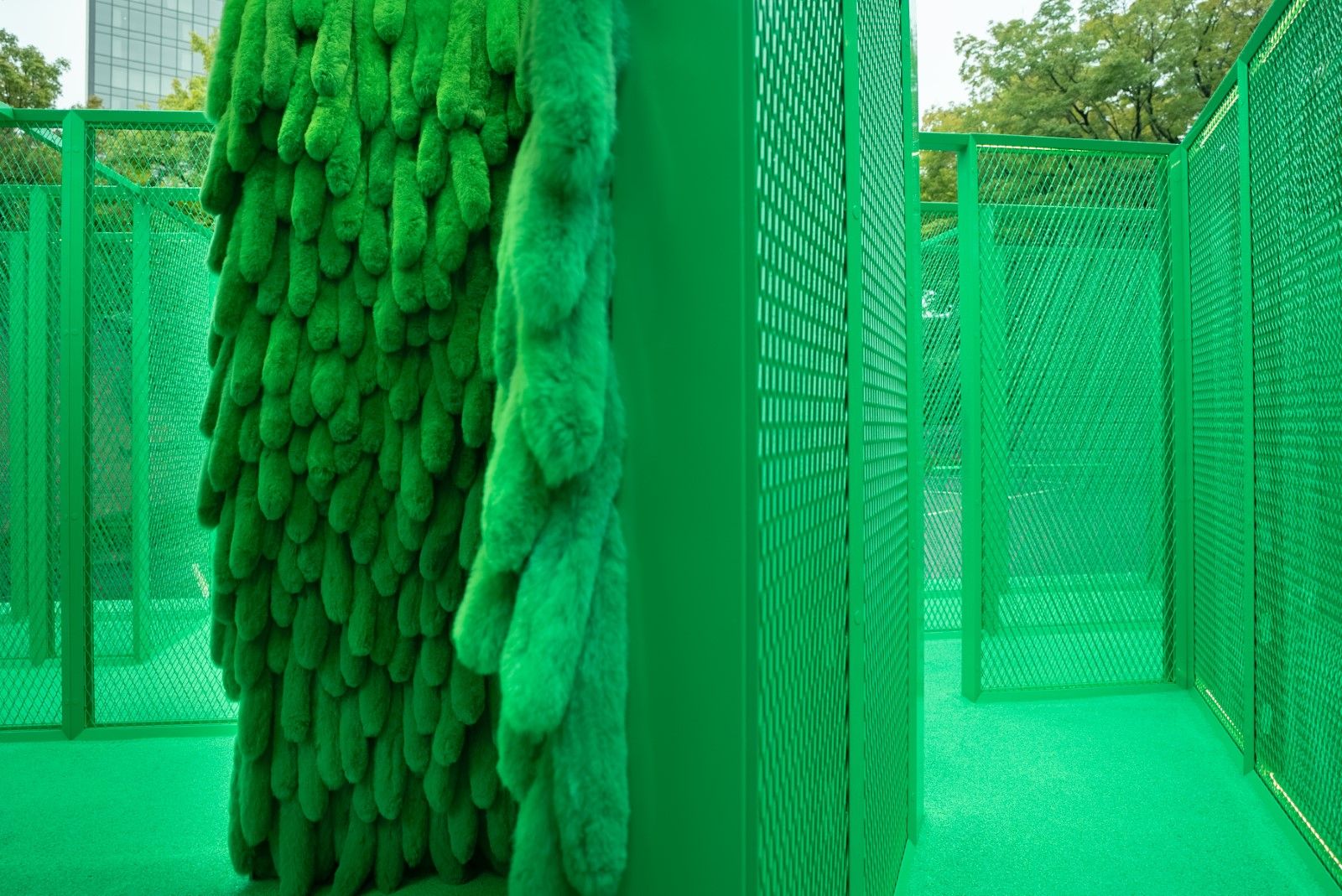 La scorsa settimana, Bottega Veneta ha presentato a Seoul la sua nuova e misteriosa installazione chiamata The Maze. L’installazione si trova davanti al Grand Hyatt Seoul e non contiene alcun prodotto: in pieno stile Daniel Lee, infatti, il labirinto si dipana per sedici metri con una struttura metallica interamente dipinta del Parakeet Green diventato da qualche anno una delle signature del brand, e una stanza centrale interna ricoperta da code di volpe sintetiche dello stesso colore che riecheggiano alcuni dei look visti durante Salon 02, ovvero la collezione FW21 del brand presentata a Berlino lo scorso aprile.