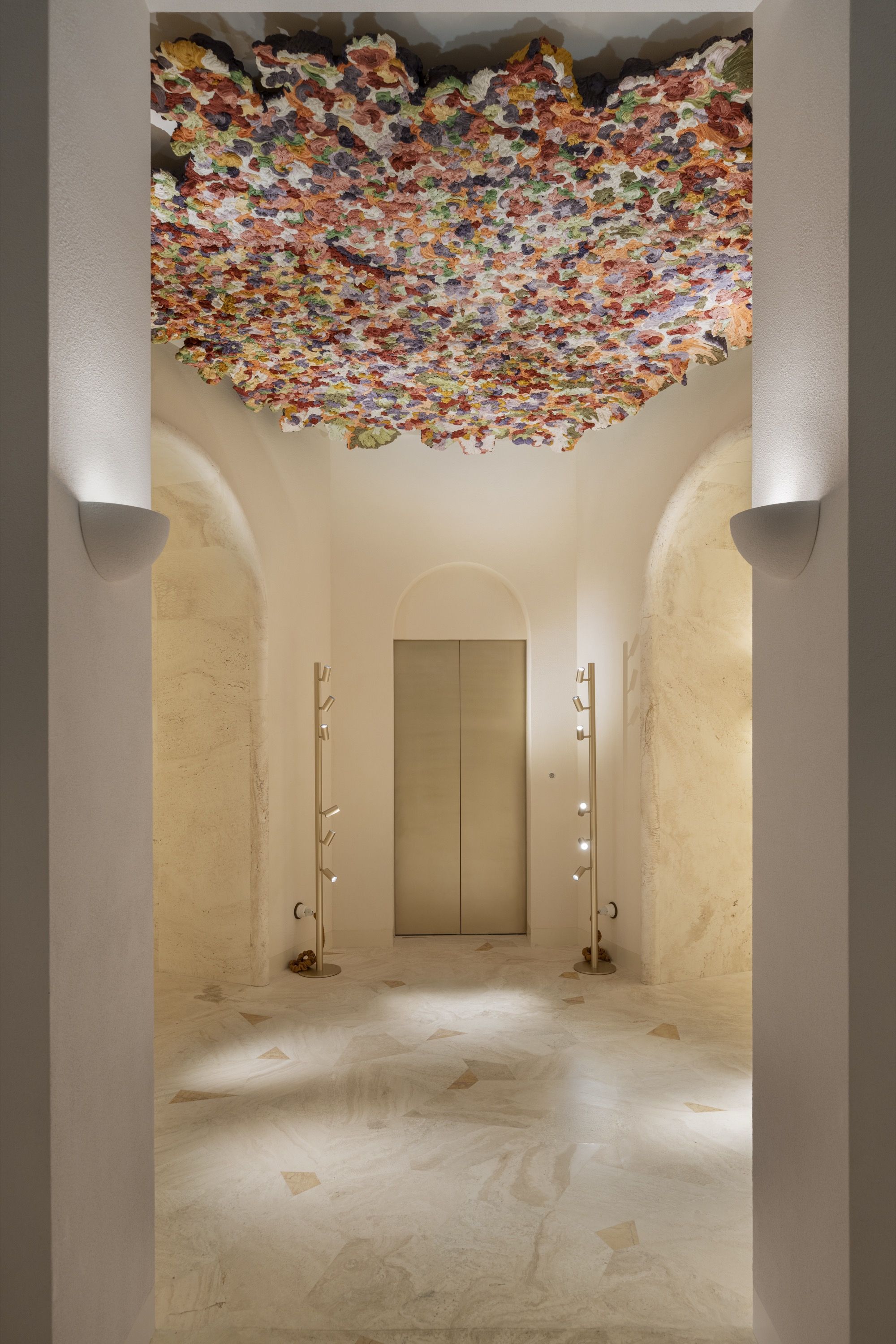 La boutique è costruita come un percorso, ma più che un itinerario è un’esperienza di ascolto dello spazio. Ogni piano è una variazione di tono: una modulazione più che una separazione, dove la materia si trasforma, ma non tradisce mai la sua origine. C’è un senso di continuità che accompagna lo sguardo e che trova il suo punto più intenso nella scala centrale. È qui che entra in scena Edoardo Piermattei, con un intervento pittorico e scultoreo che non si limita a decorare, ma trasforma il movimento in esperienza estetica. Le pareti si tingono di rosa polverosi, di terracotta e di blu improvvisi, come frammenti di cielo catturati nella pietra. È un racconto senza parole, dove il colore si deposita come un ricordo.