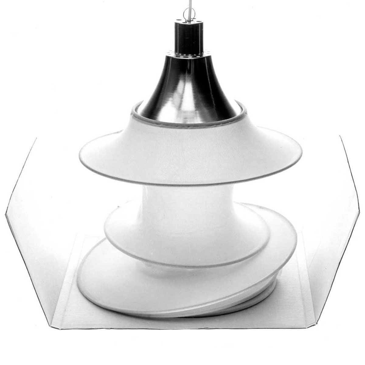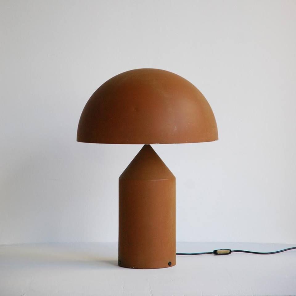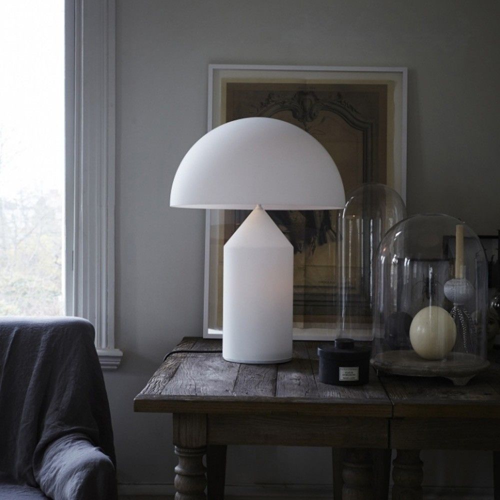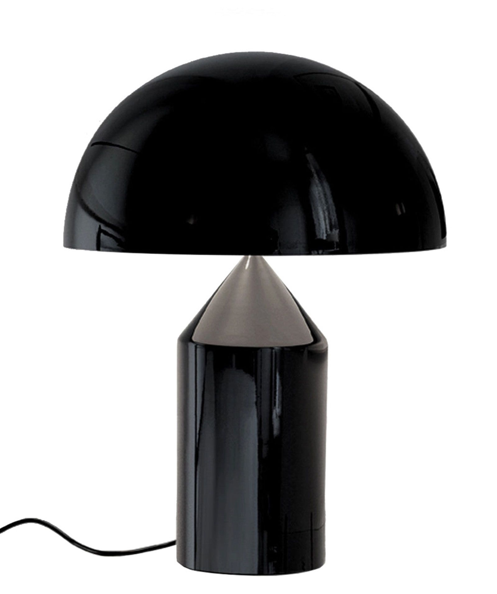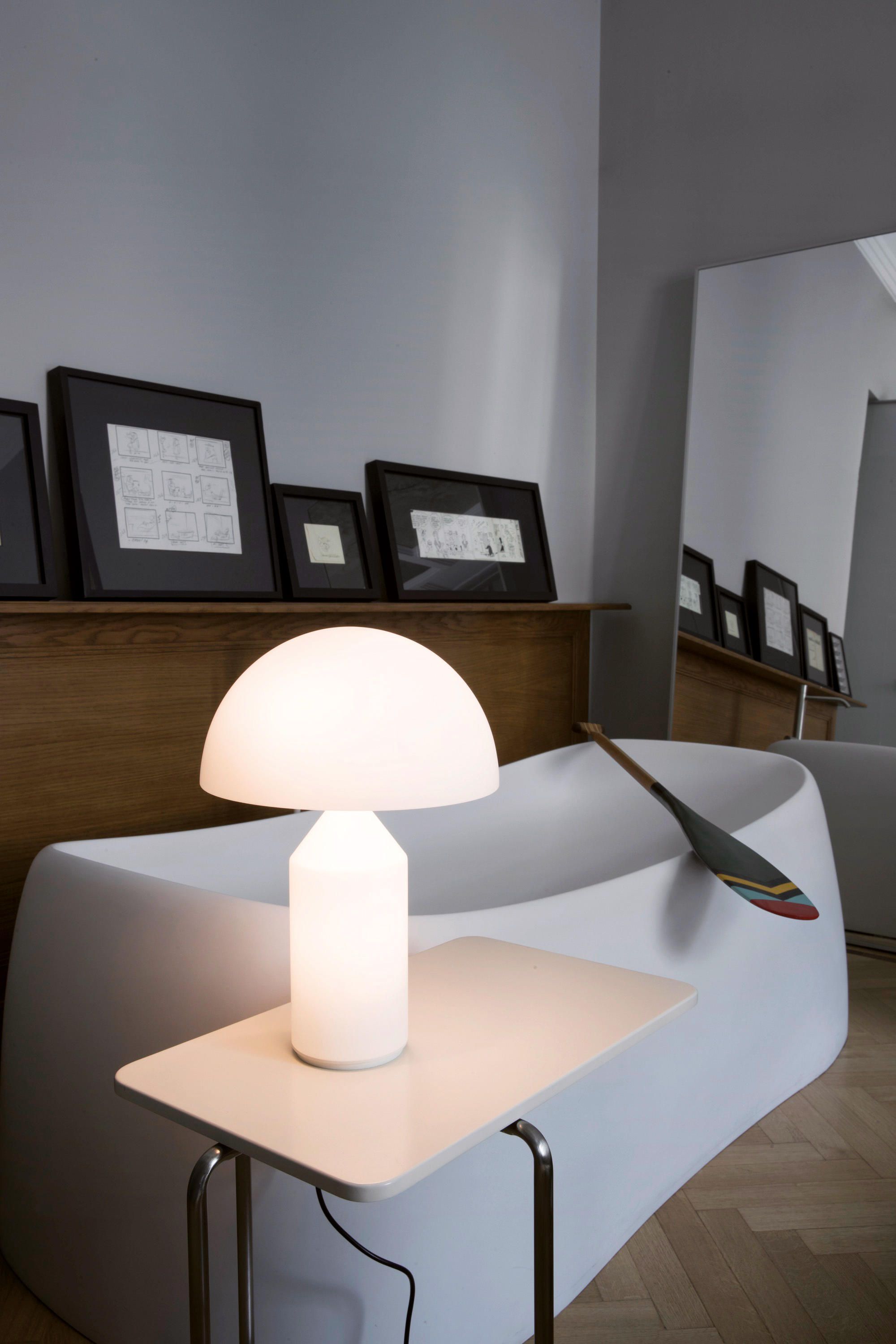 Sorte de rencontre entre les géométries pures de Gio Ponti et l'élégance nostalgique de Gae Aulenti, Atollo de Magistretti représente l'une des plus belles abstractions de l'abat-jour quotidien. Si Ponti avait réduit la lampe classique à un cône et une sphère, Magistretti place le cône sur un cylindre et coupe la sphère en deux, créant presque l'illusion que la partie supérieure est juste suspendue au-dessus de la base.