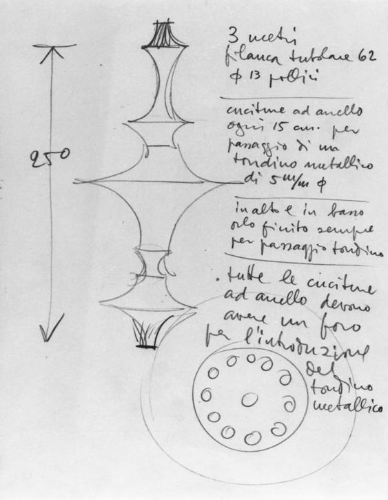 De nombreuses lampes Art Déco du siècle précédent avaient tenté d'incorporer des éléments de l'art japonais dans leur conception. Mais c'est Bruno Munari qui a réinterprété la tradition des lanternes en papier de la manière la plus révolutionnaire. L'inspiration du dessin est assez claire, même si ce n'est pas immédiat, mais c'est la recherche des matériaux qui a donné le tournant décisif au processus de création. Le papier étant fragile et jauni avec le temps, Munari a pensé pouvoir le remplacer avec du tissu. En utilisant la filanca, un tissu utilisé pour fabriquer des bas, et en le structurant à l'aide de cerceaux en acier, Munari a obtenu une structure tubulaire à la fois grande et facile à transporter et à assembler. Et c’est ce qui fait encore l'un des objets de design les plus imités du siècle.