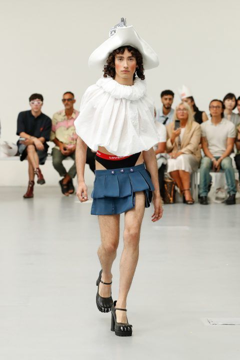 Pour Etro, Marco de Vincenzo a poussé un peu plus loin les limites de la grande expérience de la marque dans le domaine des motifs et des dessins, en essayant de jouer avec les sources d'inspiration et les couleurs. S'inspirant d'un livre d'illustrations du XVIIIe siècle trouvé dans une vieille librairie de Messine, de Vincenzo a conçu des tops remplis d'images allégoriques sur la Tempérance, la Ténacité, l'Éternité et la Luxure, dont le créateur a expliqué à Vogue Runway qu'elles lui rappelaient «TikTok, les mèmes et les GIF, qui sont notre façon non verbale de communiquer par le biais d'images». Toujours chez Charles Jeffrey Loverboy, l'histoire est une inspiration qui a joué un rôle central dans la collection ; intitulée The New Caroleans, les soldats du roi Charles XI, toute la ligne a joué avec le concept d'ancien et de nouveau en faisant appel à l'intelligence artificielle. Les hauts ont pris ici un sens encore plus surréaliste et enfantin, reflété par les chemises à carreaux et leurs cols d'écolier en dentelle. Last but not least, les propositions de JW Anderson, qui pour l'été prochain a décidé d'amener les grands classiques sur le podium revisités dans une tonalité humoristique : la chemise Oxford portait un gag, la chemise milleraies diminuait ses rayures et les trompait, se pliant en double boutonnage comme une veste.