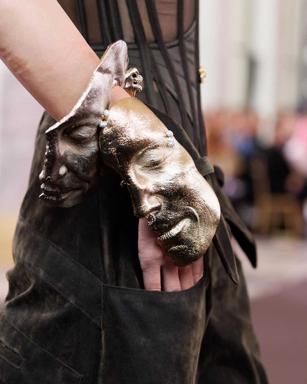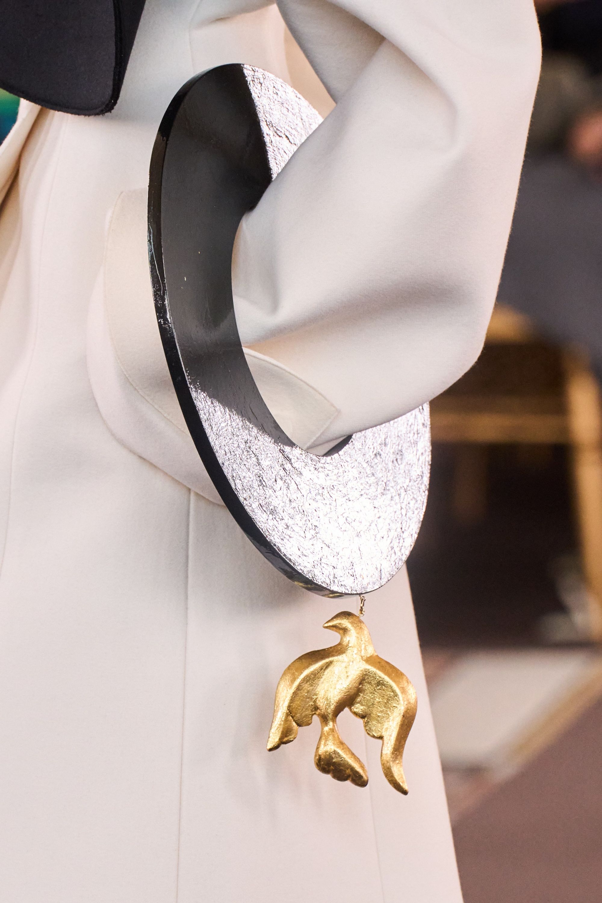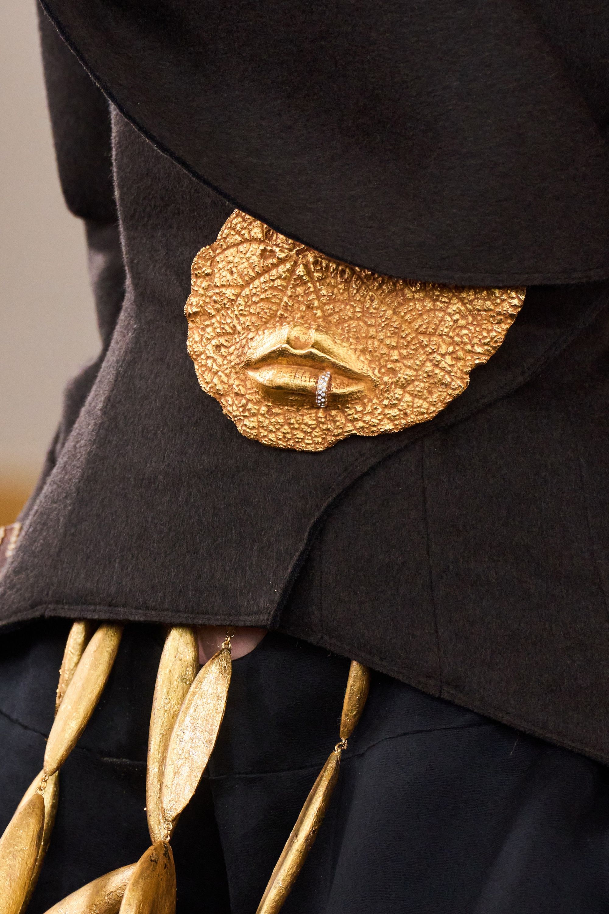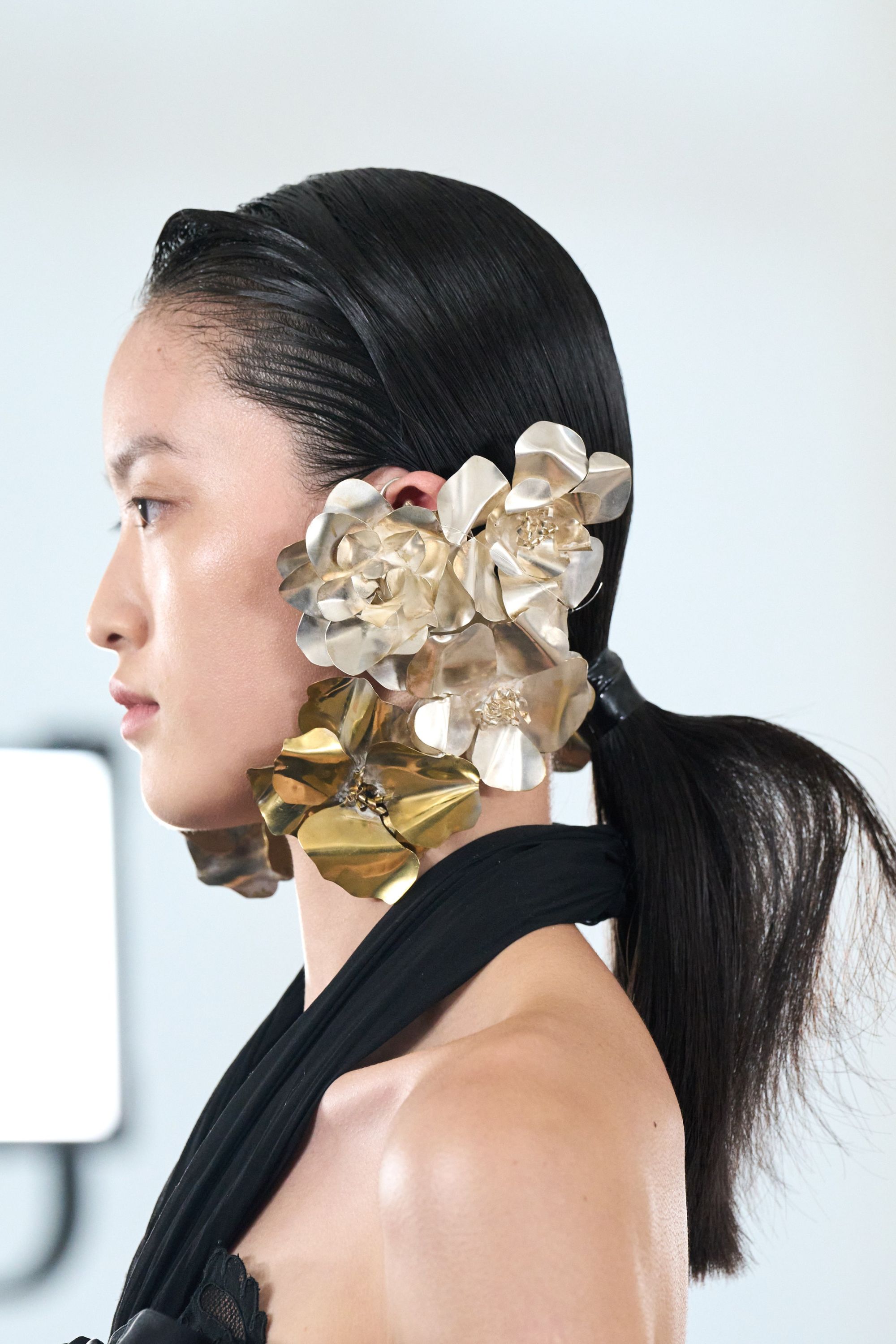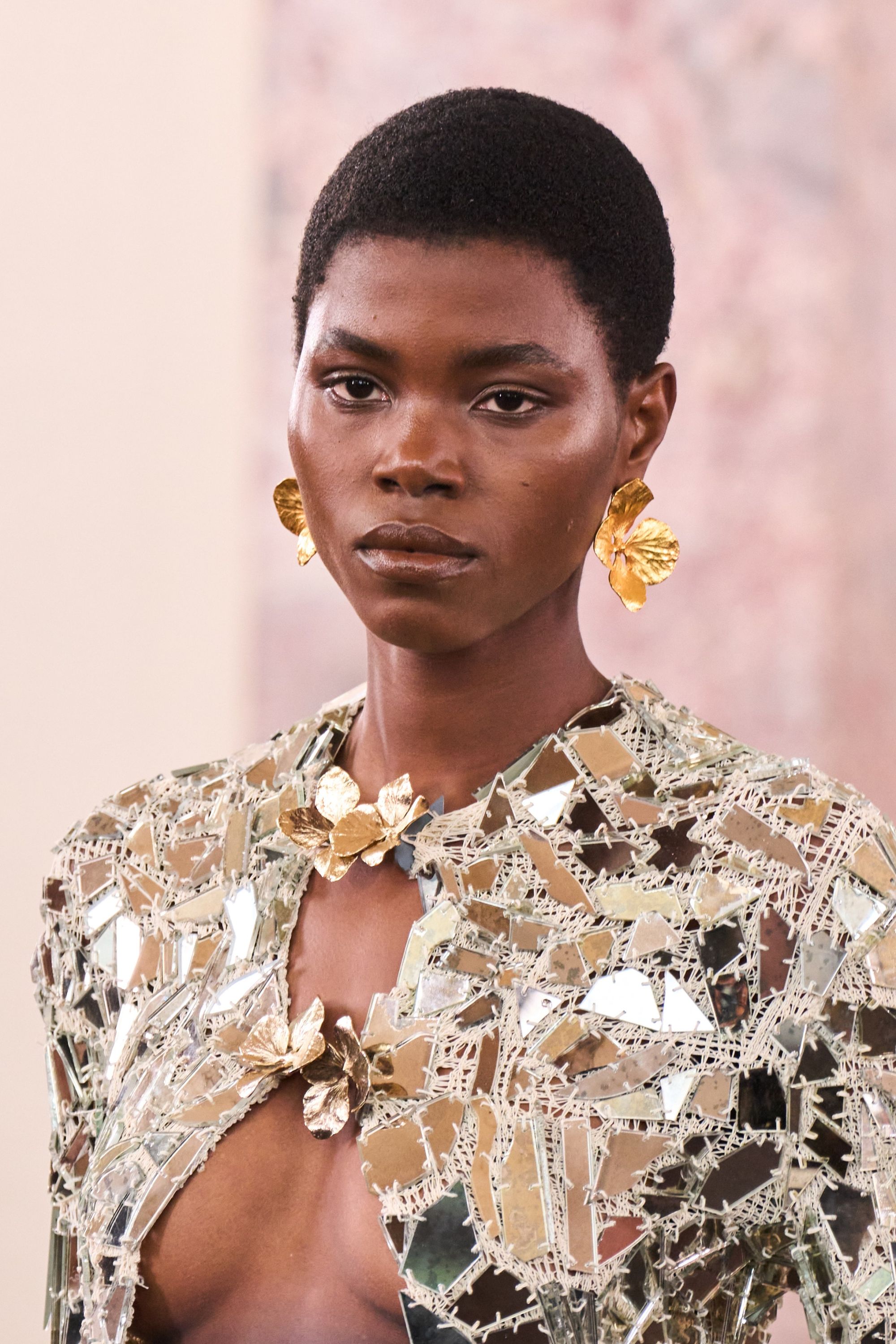 Pommes surréalistes d'où jaillissent des oreilles dorées, visages métalliques portés en bracelets ou bouches cachées dans des vestes : pour Daniel Roseberry de Schiaparelli, l'accessoire est une petite sculpture. Et puis il y a les boucles d'oreilles florales plus conventionnelles de Giambattista Valli, que l'on ne peut certainement pas qualifier de "bijoux classiques".