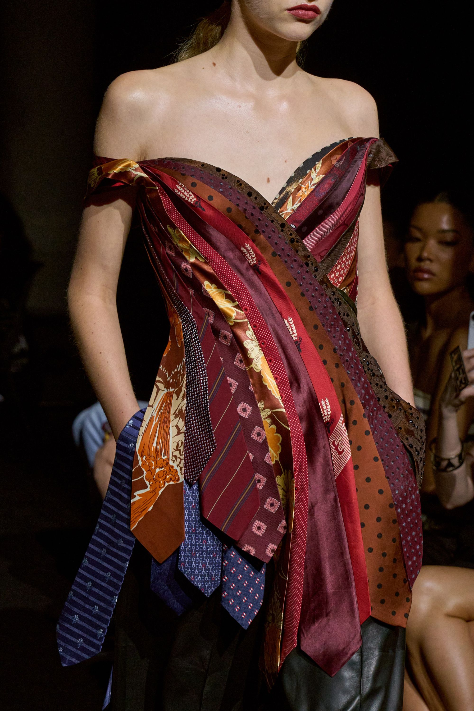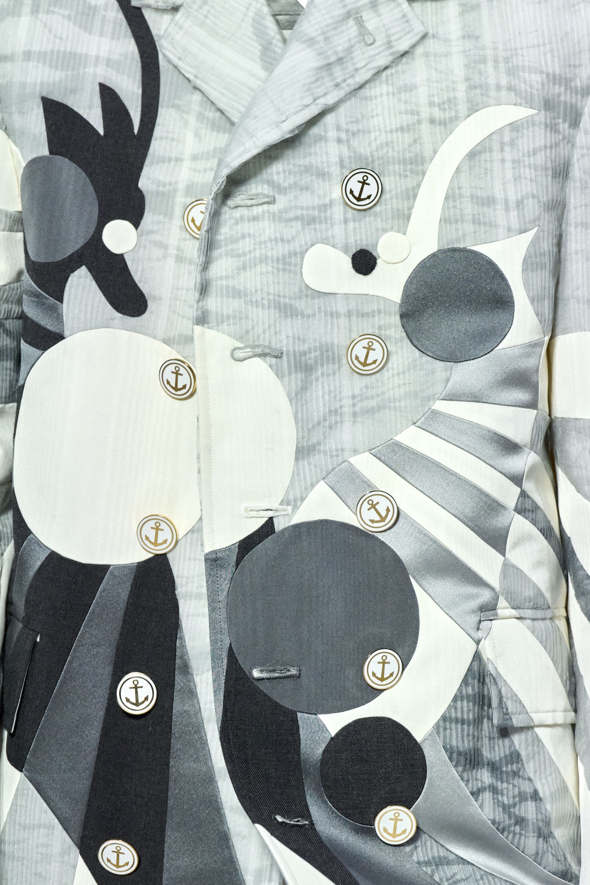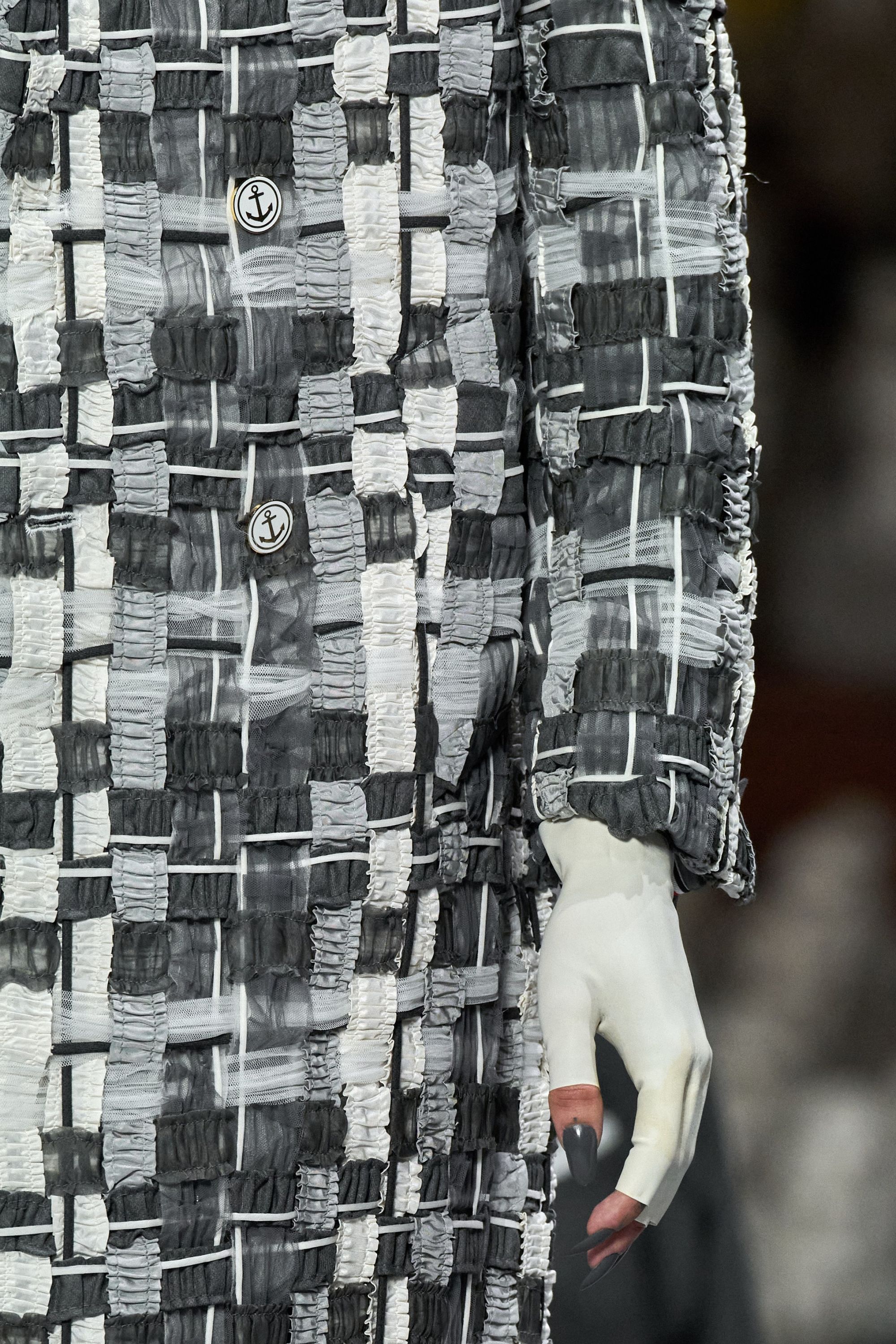 La scelta dei materiali è un’altra delle eccellenze della Couture. Spesso i tessuti non sono utilizzati nella loro forma originale ma sono trattati e manipolati mediante tecniche particolari di tintura o cuciti in un patwork per formare un disegno come nelle giacche di Thom Browne.