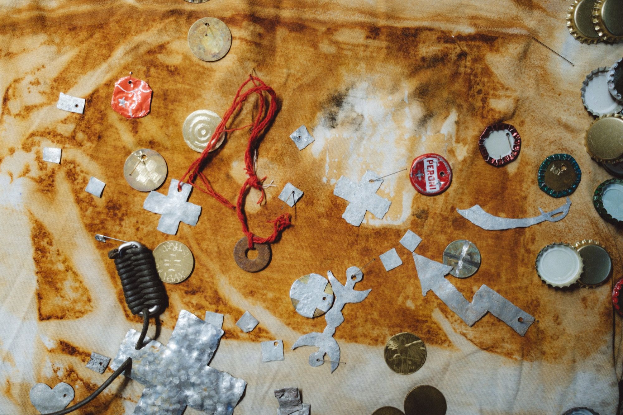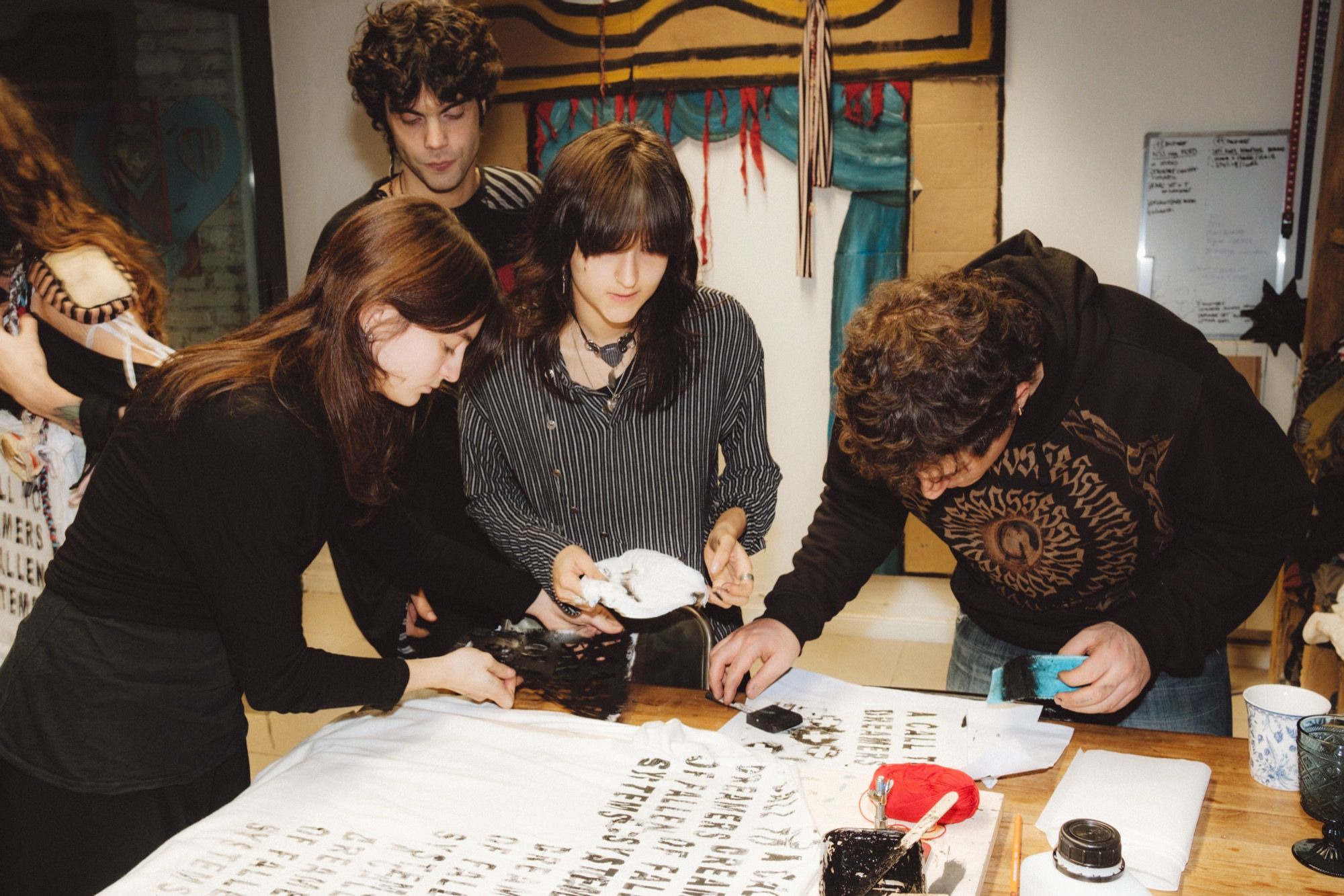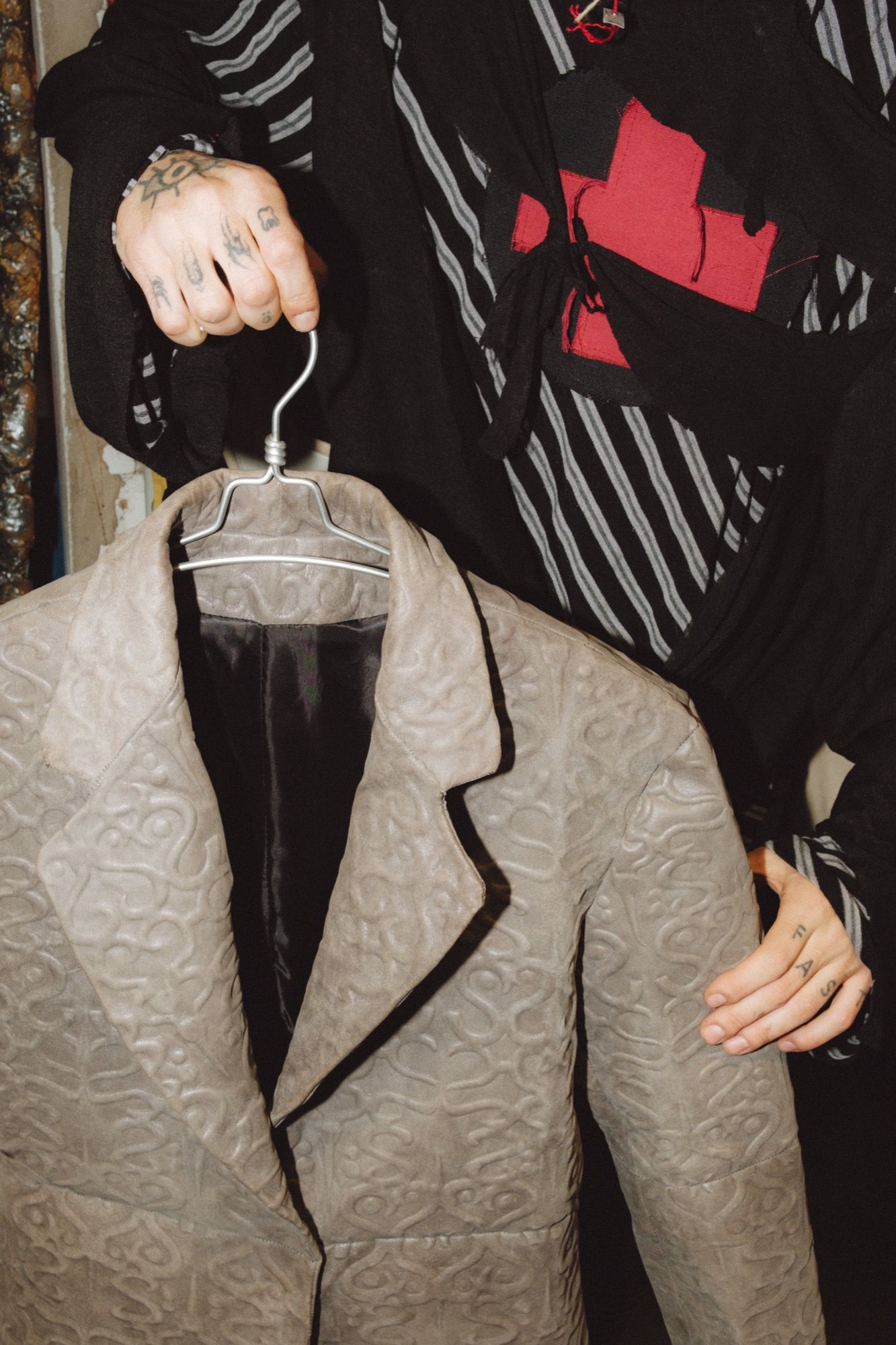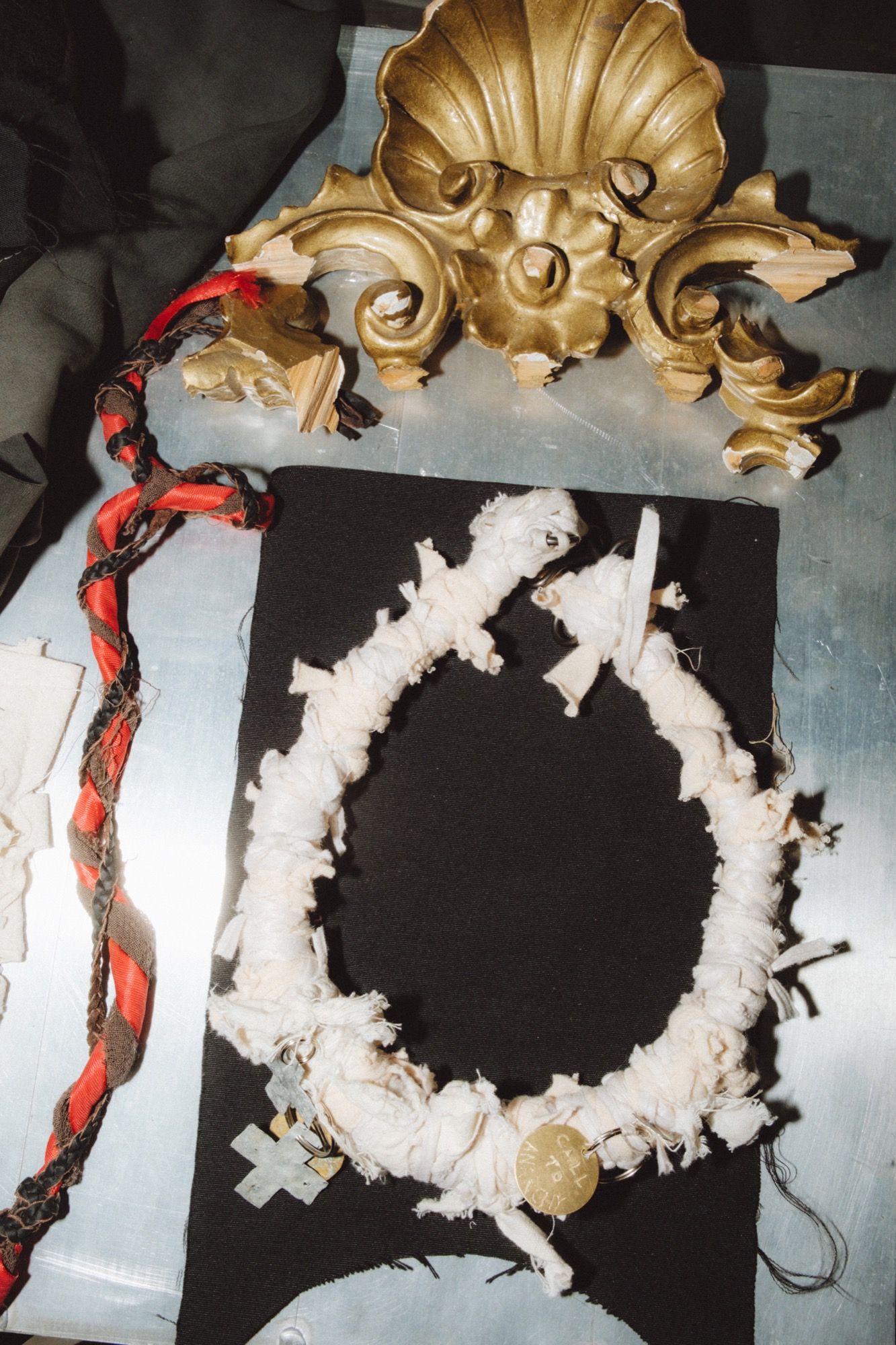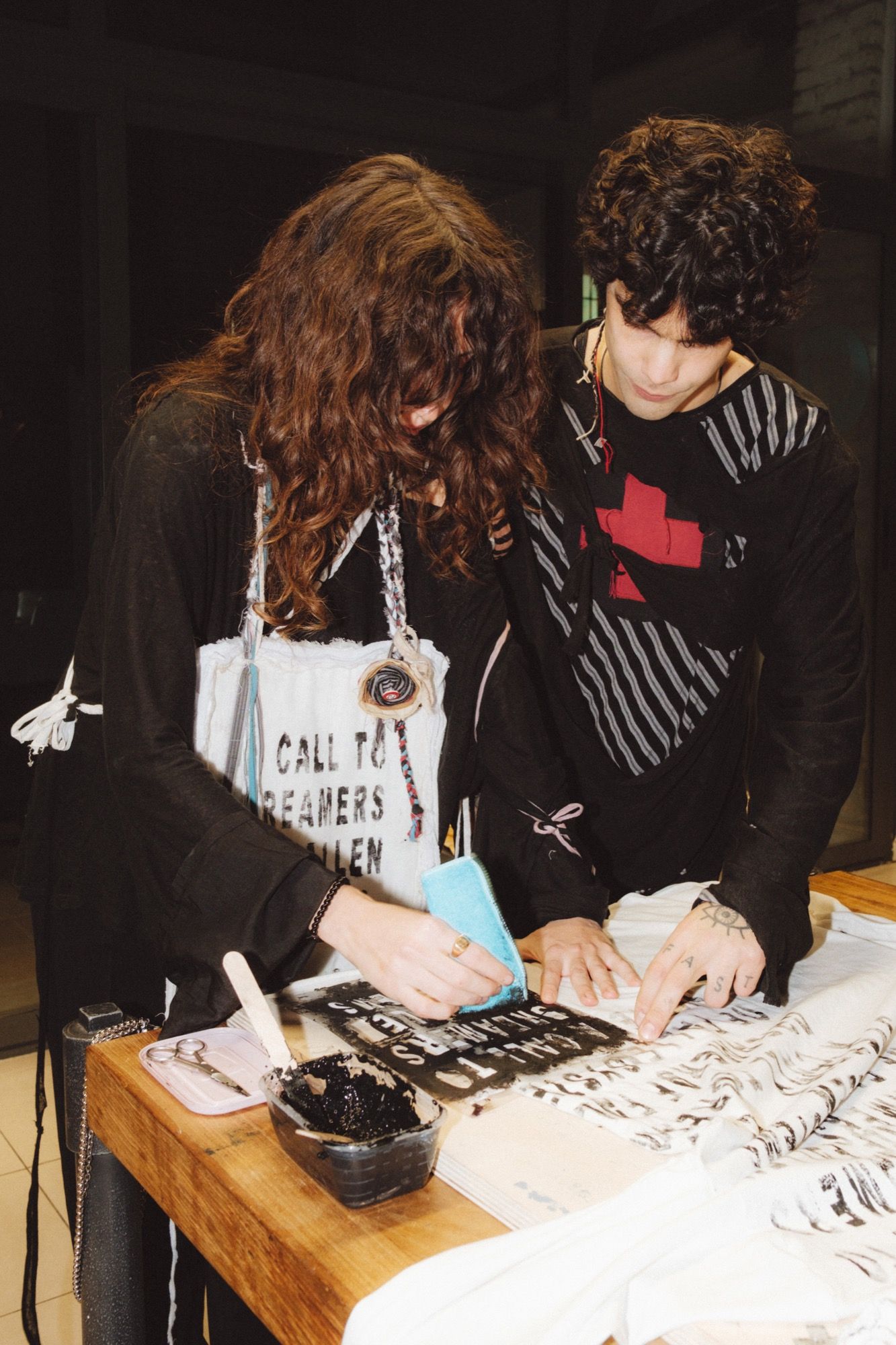 Lorenzo et Letizia sont deux jeunes designers qui tentent de se frayer un chemin dans un secteur très ancien. Les voir évoluer dans leur atelier - qui est aussi leur maison - est un peu comme regarder un animal sauvage se faufiler à travers les décombres : un environnement qui a le goût d'une rave qui vient de se terminer, avec des portraits de David Bowie et Patti Smith, des piles de magazines et des tracts promouvant la lutte des classes. Sur le mur principal, s'étend une paire d'ailes énormes aux plumes noires, tout autour, des personnes peignent des t-shirts, découpent des canettes pour en faire des accessoires, tandis qu'un tatoueur venu de l'étranger profite de la polyvalence de l'espace ouvert pour rencontrer les clients. Un espace à la fois claustrophobique et libérateur, une dichotomie qui résume de manière cohérente l'essence de la marque : « L'imaginaire que nous racontons concerne les repaires de pirates, les quartiers libérés, les marginaux, les populations autochtones et nomades, les communards de Paris, les déshérités et dissidents, les occupations et toutes les histoires de mouvement, tout ce qui naît et se reproduit en dehors de la réalité dominante, de l'oppression et de l'ennui», explique Lorenzo tandis qu'un lévrier afghan avec un pull rouge lui frotte le museau sur les jambes et que Letizia contrôle le processus d'impression sérigraphique d'un t-shirt qui sera bientôt disponible dans leur prochaine sortie.