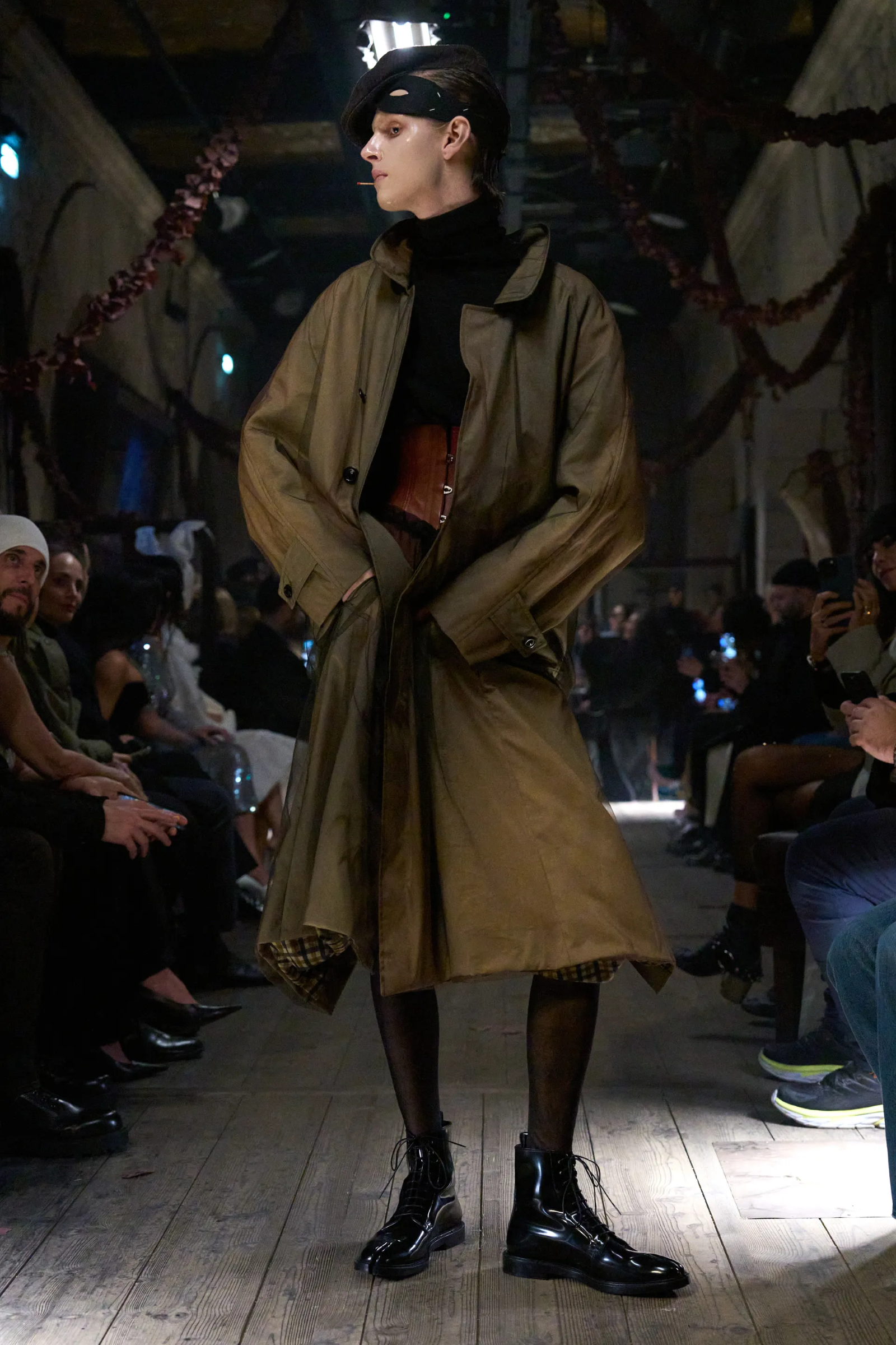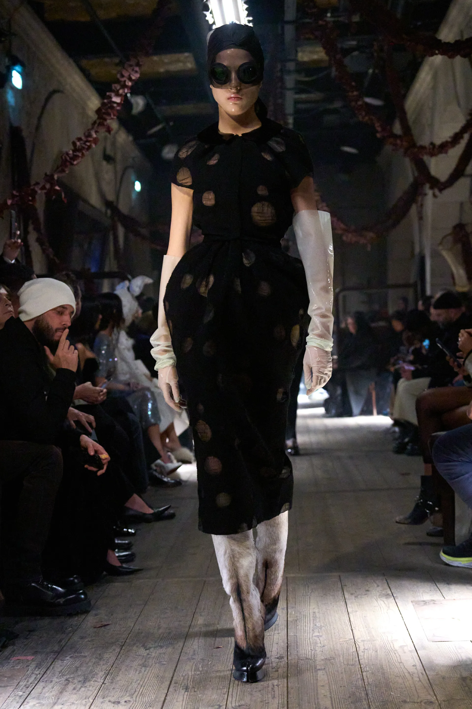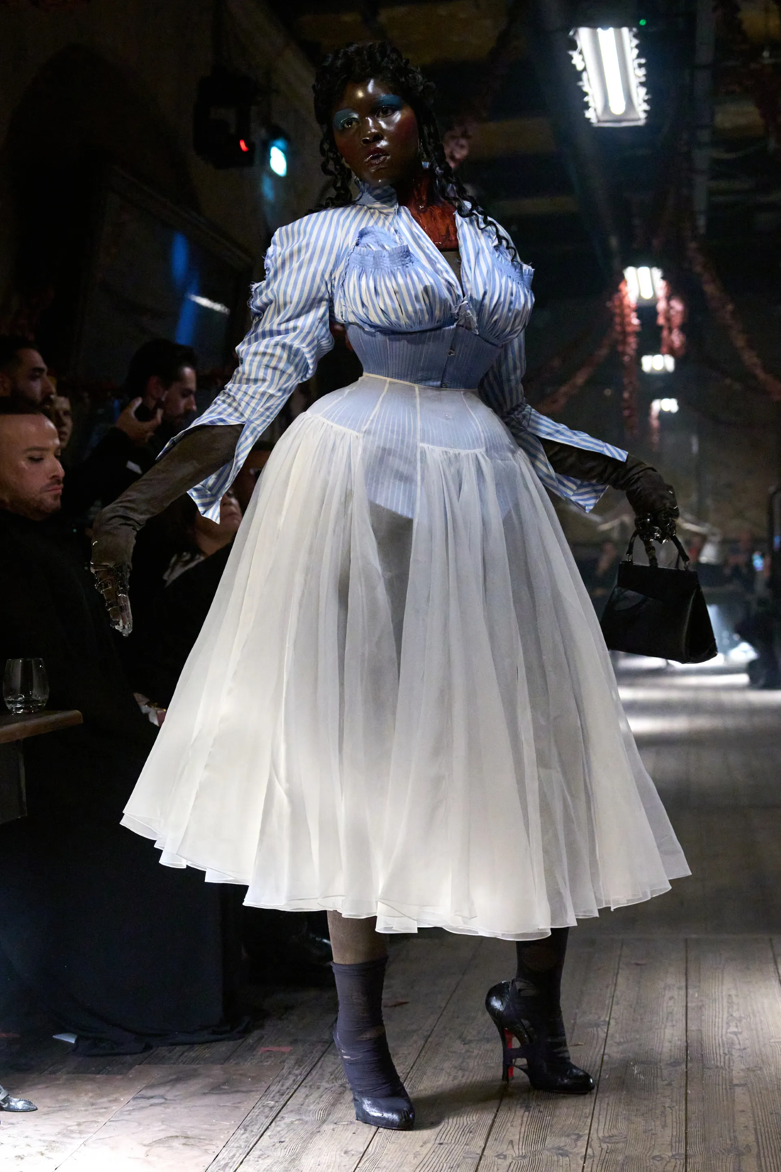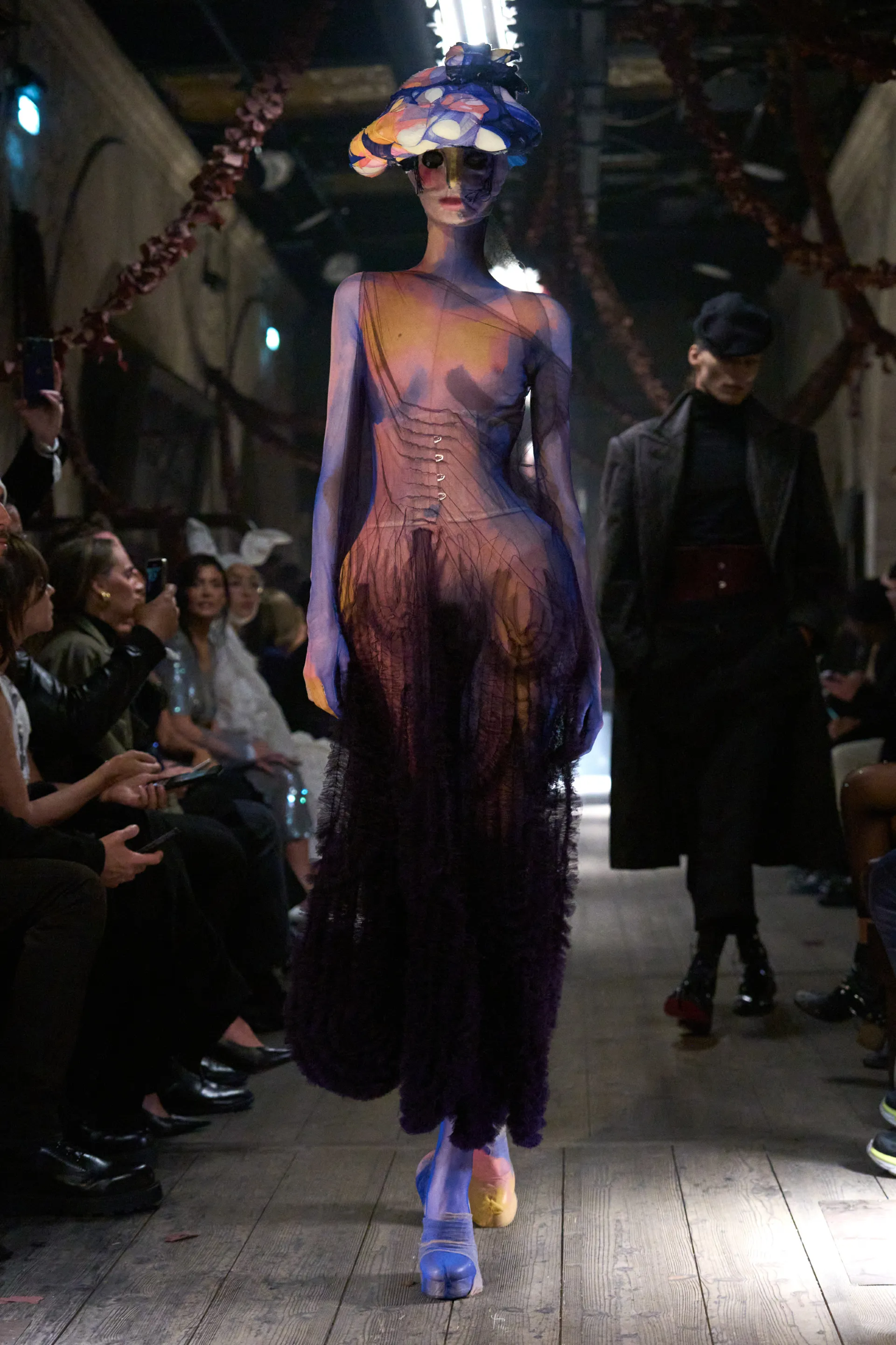 Mis en scène lors de la première pleine lune de l'année sous le Pont Alexandre III, entre brumes, lumières au gaz et une atmosphère de bas-fonds décadent, inspiré des muses sombres du début du siècle de Kees van Dongen et des photographies crépusculaires de Brassaï, le triomphe de Margiela a été supérieur à la somme de ses parties individuelles. Curieusement, pour ce défilé, on peut parler de mode mais pas de vêtements : les poupées burlesques, les rejetés qui marchent contractés par le froid dans des manteaux fermés et tordus, les Junons et les nymphes malades qui auraient plu à Baudelaire étaient vêtus uniquement de corsets et de robes Belle Époque en organza complètement transparent. Le maquillage rappelait celui de poupées de porcelaine inquiétantes ou de visages souillés d'huile, les coiffures ébouriffées et les chapeaux exprimaient un tourment romantique, un goût pour le drame et la beauté inhérents à chaque décomposition. Les corps abondants, dénudés, contraints dans des corsets exposés comme si ces vêtements d'époque avaient été dévorés par les mites jusqu'à atteindre leur âme la plus fine et impalpable, la sensualité troublante et funèbre à la fois, et même un sens surréaliste du grotesque qui effaçait certains visages et dessinait les seins des mannequins avec des coups de pinceau imprimés dans le tissu des collants peints – il n'y avait rien de réconfortant et de rassurant dans ce défilé, aucune affection pour l'énergie et le dynamisme, aucun optimisme feint. C'était un récit noir, un mystère de Paris digne d'Eugène Sue, un concept enfin détaché de l'obsession de décrire, commenter et réagir au présent.
