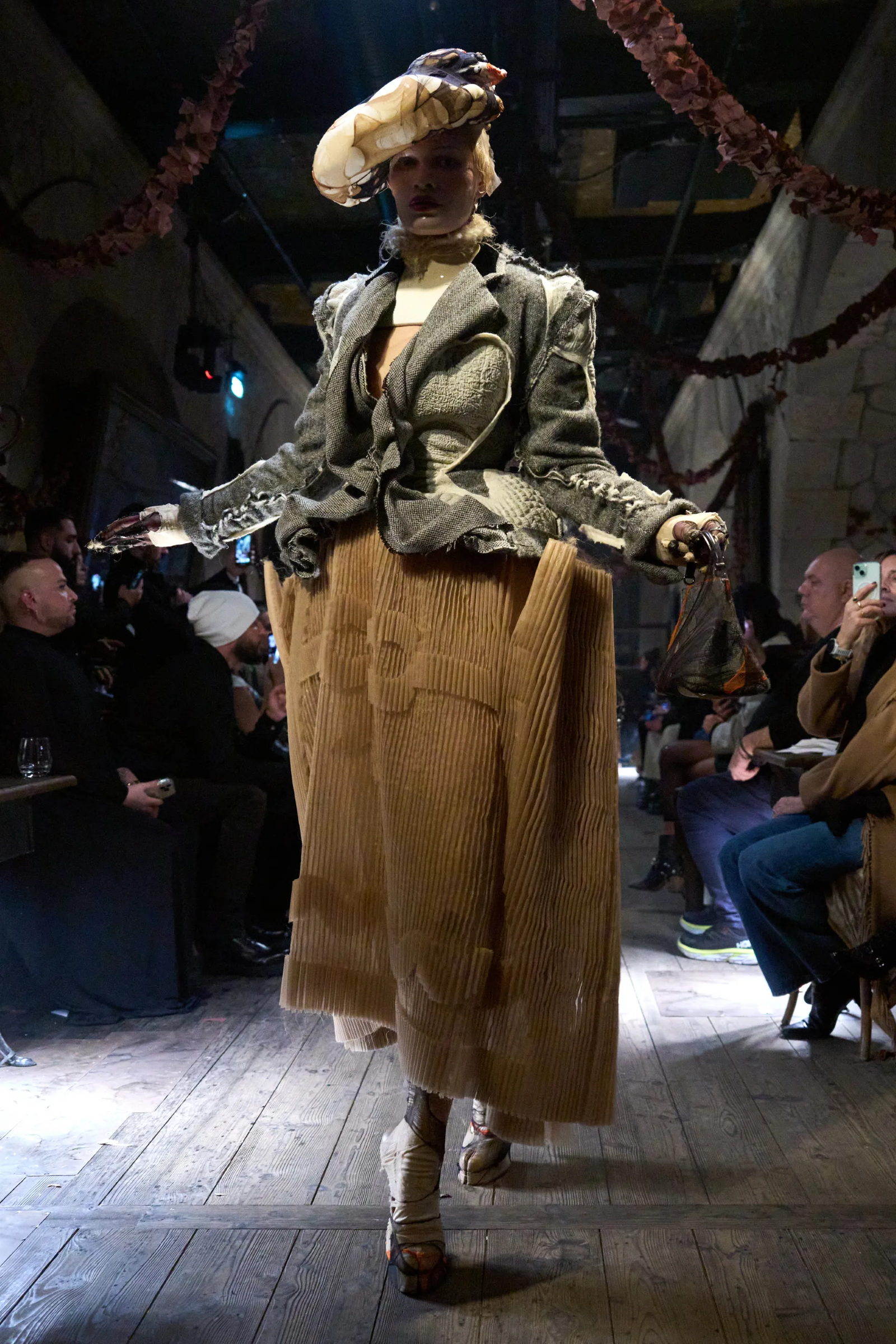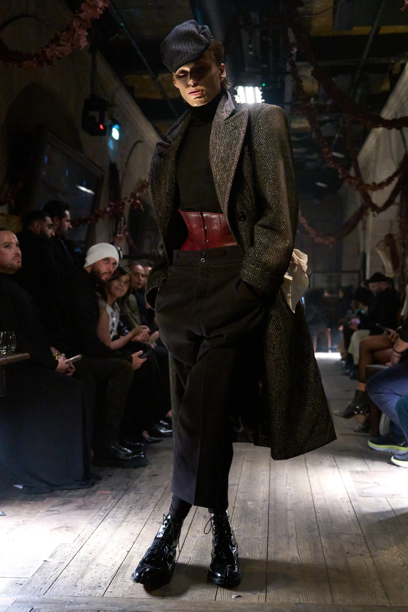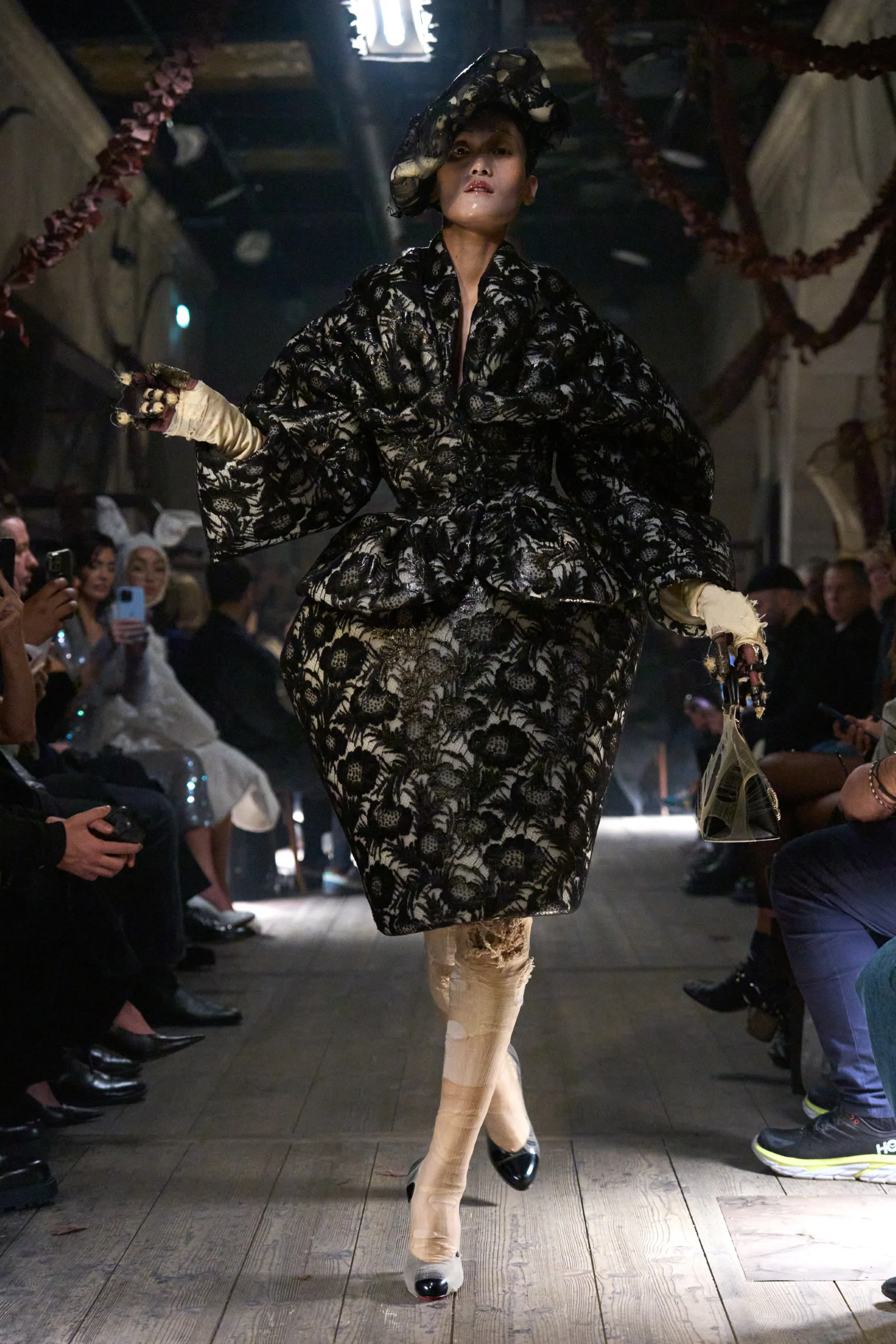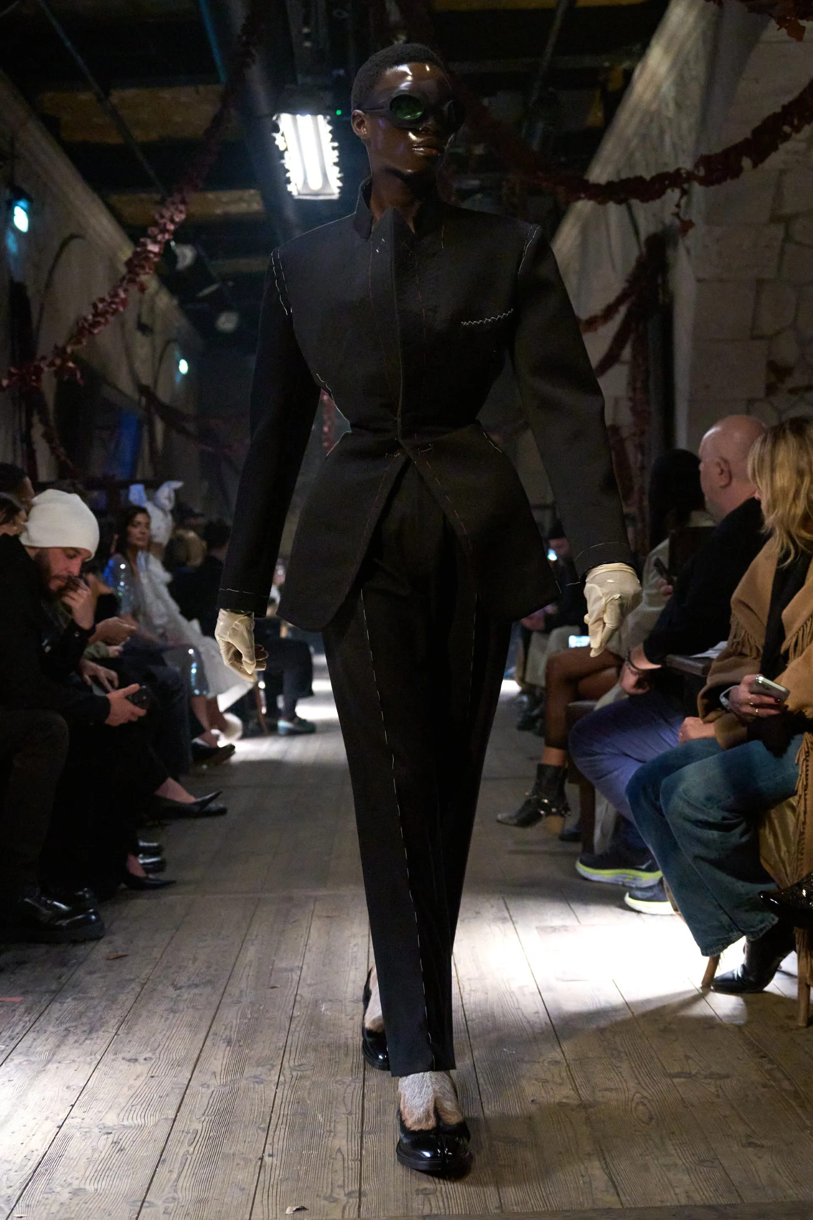 Mis en scène lors de la première pleine lune de l'année sous le Pont Alexandre III, entre brumes, lumières au gaz et une atmosphère de bas-fonds décadent, inspiré des muses sombres du début du siècle de Kees van Dongen et des photographies crépusculaires de Brassaï, le triomphe de Margiela a été supérieur à la somme de ses parties individuelles. Curieusement, pour ce défilé, on peut parler de mode mais pas de vêtements : les poupées burlesques, les rejetés qui marchent contractés par le froid dans des manteaux fermés et tordus, les Junons et les nymphes malades qui auraient plu à Baudelaire étaient vêtus uniquement de corsets et de robes Belle Époque en organza complètement transparent. Le maquillage rappelait celui de poupées de porcelaine inquiétantes ou de visages souillés d'huile, les coiffures ébouriffées et les chapeaux exprimaient un tourment romantique, un goût pour le drame et la beauté inhérents à chaque décomposition. Les corps abondants, dénudés, contraints dans des corsets exposés comme si ces vêtements d'époque avaient été dévorés par les mites jusqu'à atteindre leur âme la plus fine et impalpable, la sensualité troublante et funèbre à la fois, et même un sens surréaliste du grotesque qui effaçait certains visages et dessinait les seins des mannequins avec des coups de pinceau imprimés dans le tissu des collants peints – il n'y avait rien de réconfortant et de rassurant dans ce défilé, aucune affection pour l'énergie et le dynamisme, aucun optimisme feint. C'était un récit noir, un mystère de Paris digne d'Eugène Sue, un concept enfin détaché de l'obsession de décrire, commenter et réagir au présent.