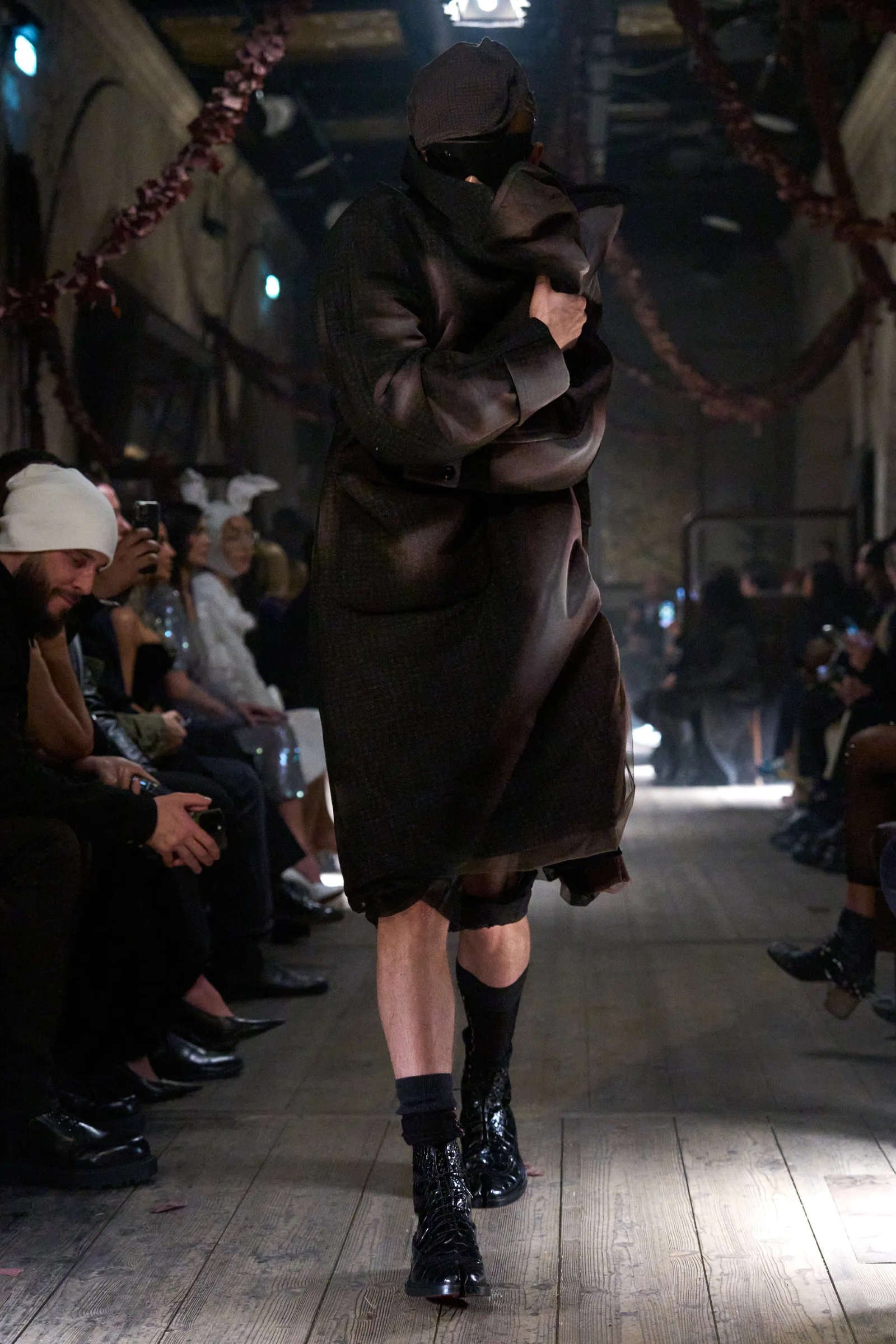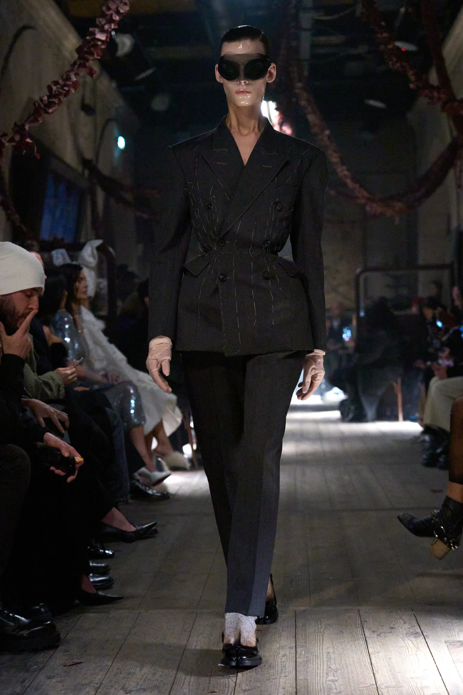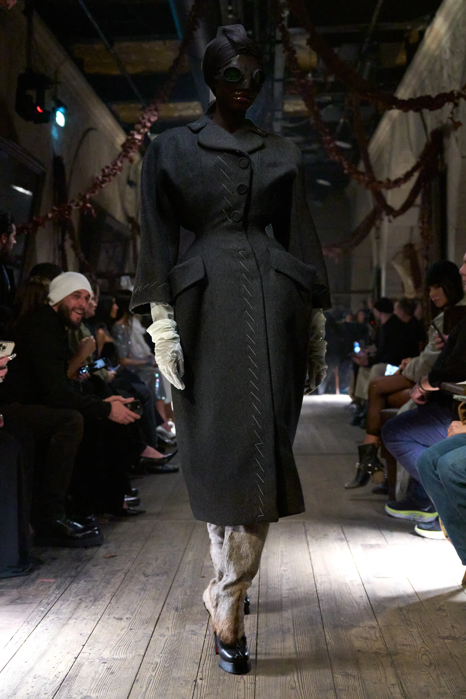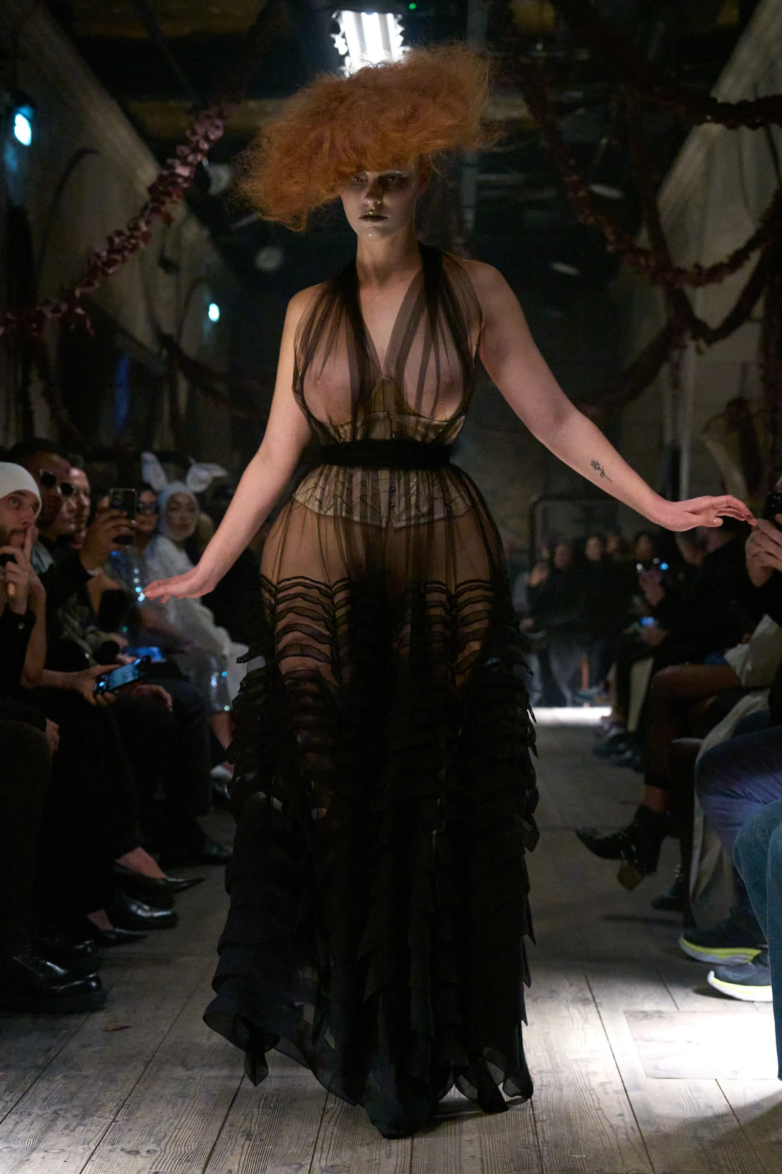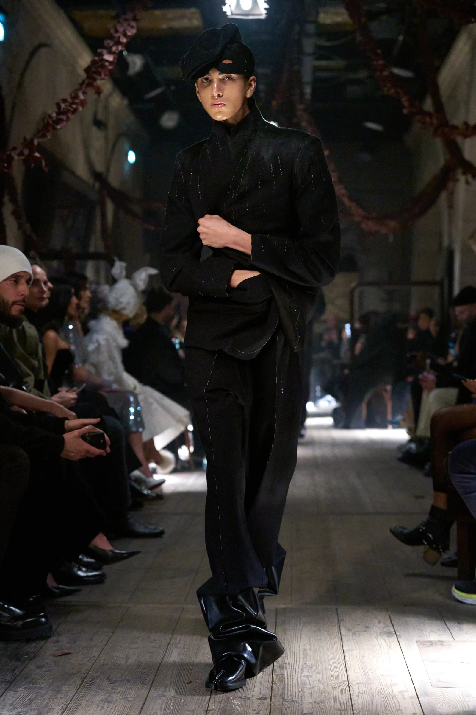 Mis en scène lors de la première pleine lune de l'année sous le Pont Alexandre III, entre brumes, lumières au gaz et une atmosphère de bas-fonds décadent, inspiré des muses sombres du début du siècle de Kees van Dongen et des photographies crépusculaires de Brassaï, le triomphe de Margiela a été supérieur à la somme de ses parties individuelles. Curieusement, pour ce défilé, on peut parler de mode mais pas de vêtements : les poupées burlesques, les rejetés qui marchent contractés par le froid dans des manteaux fermés et tordus, les Junons et les nymphes malades qui auraient plu à Baudelaire étaient vêtus uniquement de corsets et de robes Belle Époque en organza complètement transparent. Le maquillage rappelait celui de poupées de porcelaine inquiétantes ou de visages souillés d'huile, les coiffures ébouriffées et les chapeaux exprimaient un tourment romantique, un goût pour le drame et la beauté inhérents à chaque décomposition. Les corps abondants, dénudés, contraints dans des corsets exposés comme si ces vêtements d'époque avaient été dévorés par les mites jusqu'à atteindre leur âme la plus fine et impalpable, la sensualité troublante et funèbre à la fois, et même un sens surréaliste du grotesque qui effaçait certains visages et dessinait les seins des mannequins avec des coups de pinceau imprimés dans le tissu des collants peints – il n'y avait rien de réconfortant et de rassurant dans ce défilé, aucune affection pour l'énergie et le dynamisme, aucun optimisme feint. C'était un récit noir, un mystère de Paris digne d'Eugène Sue, un concept enfin détaché de l'obsession de décrire, commenter et réagir au présent.