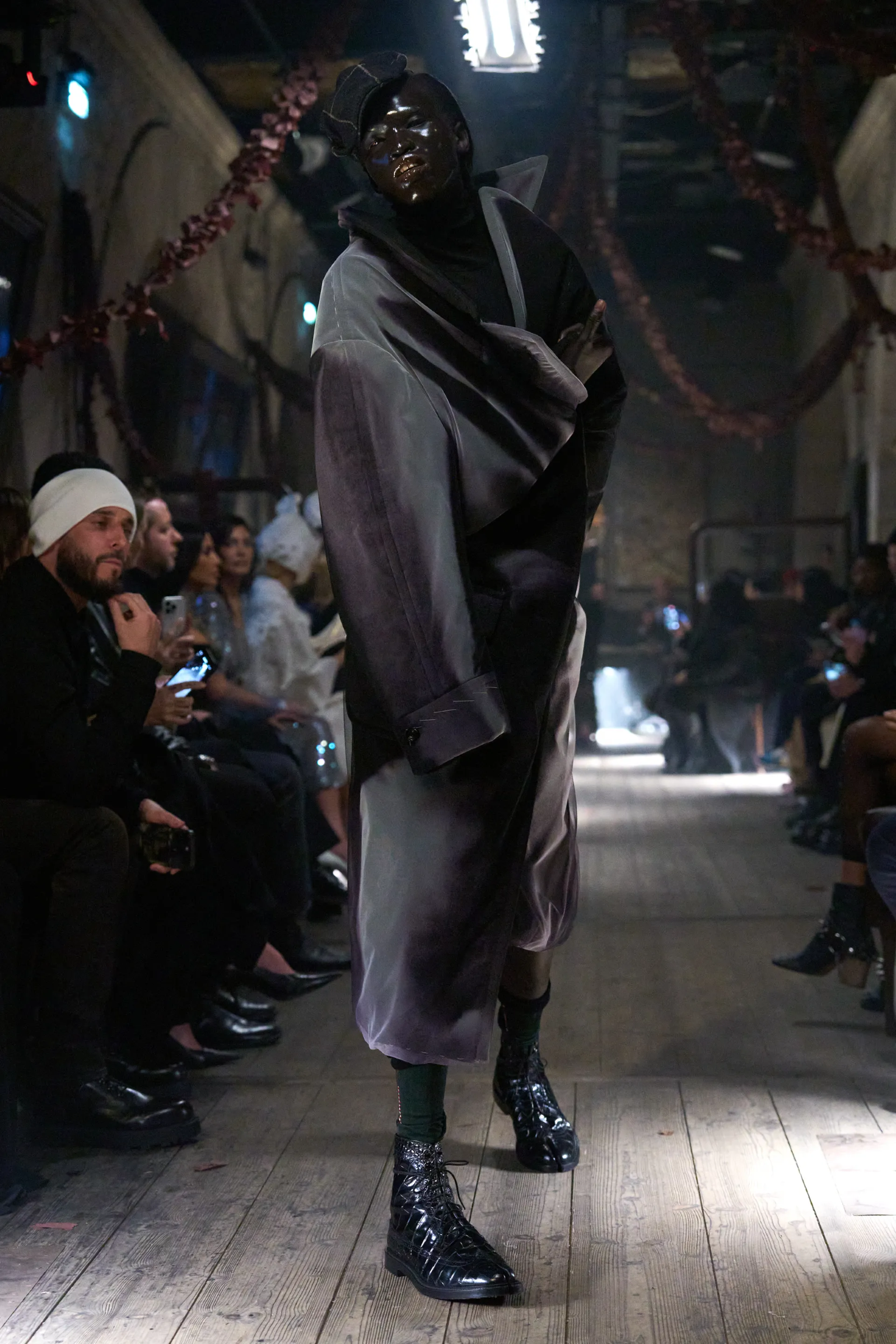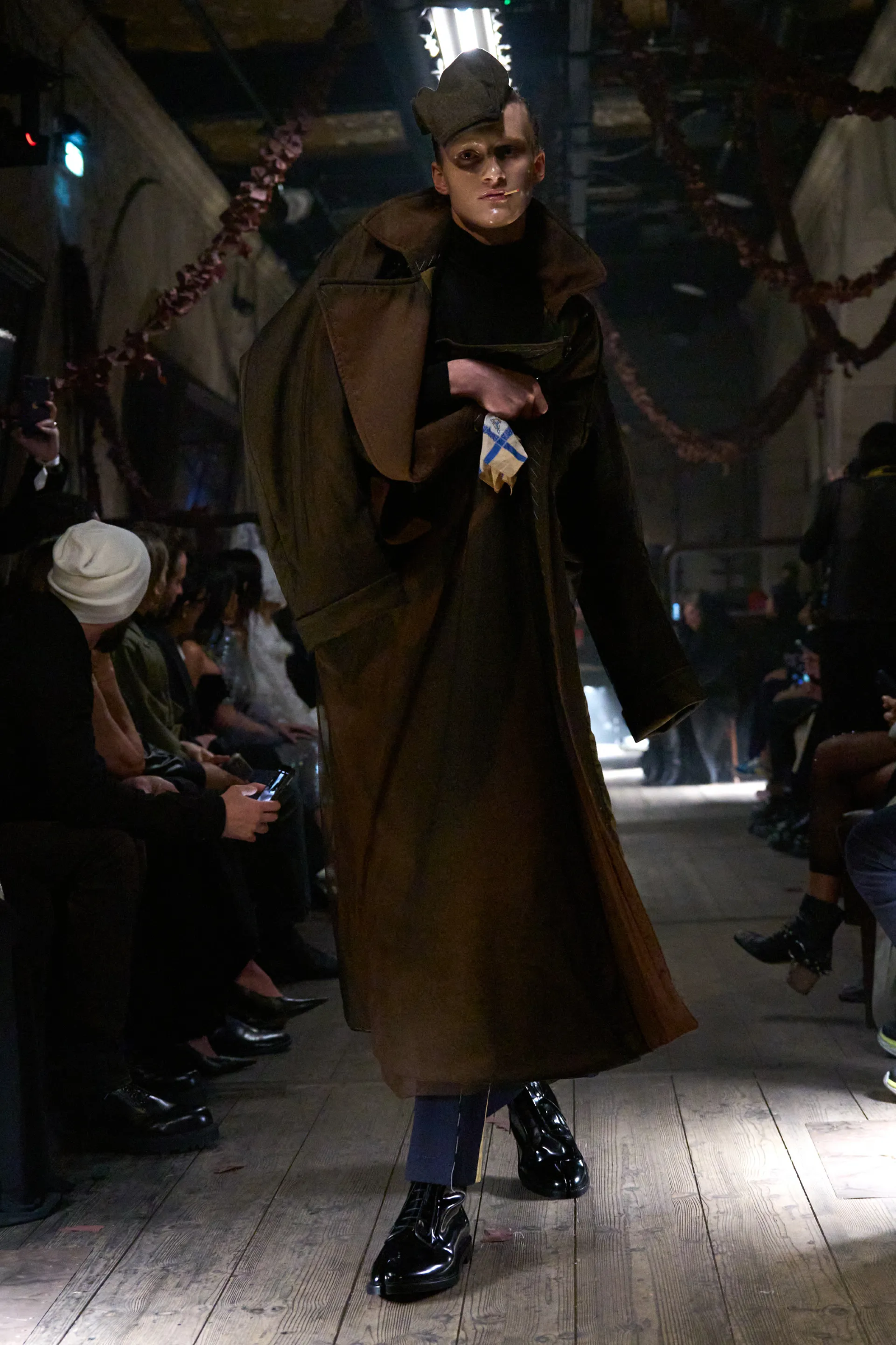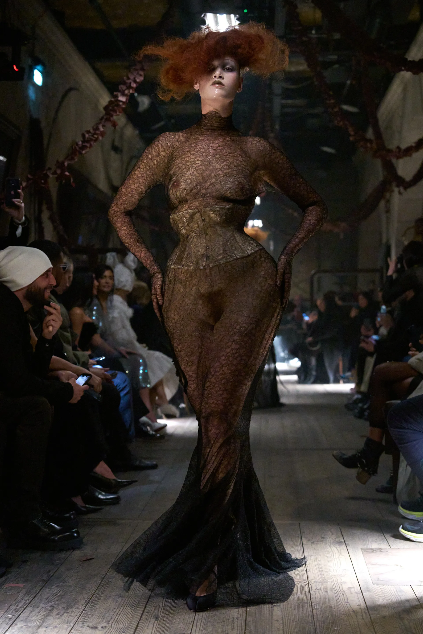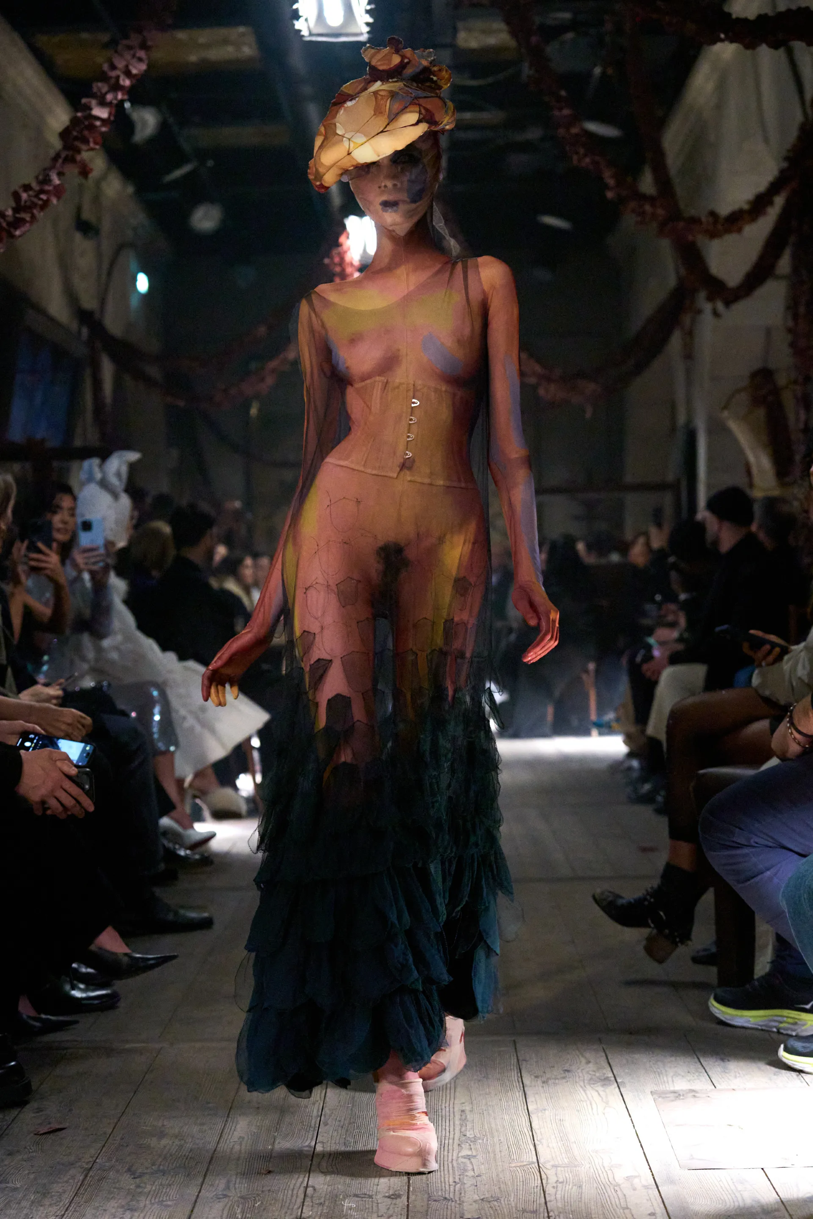 Mis en scène lors de la première pleine lune de l'année sous le Pont Alexandre III, entre brumes, lumières au gaz et une atmosphère de bas-fonds décadent, inspiré des muses sombres du début du siècle de Kees van Dongen et des photographies crépusculaires de Brassaï, le triomphe de Margiela a été supérieur à la somme de ses parties individuelles. Curieusement, pour ce défilé, on peut parler de mode mais pas de vêtements : les poupées burlesques, les rejetés qui marchent contractés par le froid dans des manteaux fermés et tordus, les Junons et les nymphes malades qui auraient plu à Baudelaire étaient vêtus uniquement de corsets et de robes Belle Époque en organza complètement transparent. Le maquillage rappelait celui de poupées de porcelaine inquiétantes ou de visages souillés d'huile, les coiffures ébouriffées et les chapeaux exprimaient un tourment romantique, un goût pour le drame et la beauté inhérents à chaque décomposition. Les corps abondants, dénudés, contraints dans des corsets exposés comme si ces vêtements d'époque avaient été dévorés par les mites jusqu'à atteindre leur âme la plus fine et impalpable, la sensualité troublante et funèbre à la fois, et même un sens surréaliste du grotesque qui effaçait certains visages et dessinait les seins des mannequins avec des coups de pinceau imprimés dans le tissu des collants peints – il n'y avait rien de réconfortant et de rassurant dans ce défilé, aucune affection pour l'énergie et le dynamisme, aucun optimisme feint. C'était un récit noir, un mystère de Paris digne d'Eugène Sue, un concept enfin détaché de l'obsession de décrire, commenter et réagir au présent.